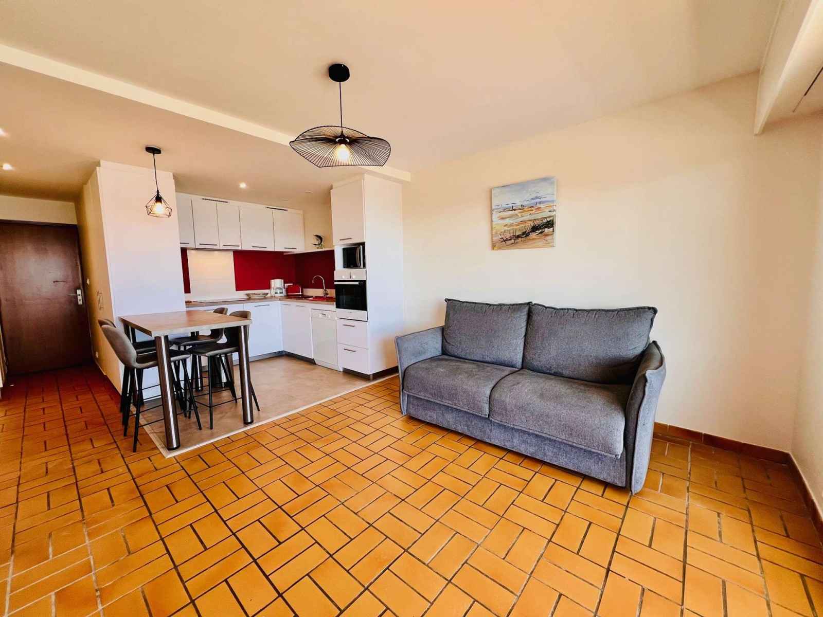• Equipements : Animaux refusés, Bouilloire, Cafetière, Canapé convertible, Chauffage, Douche, Four, Four micro-ondes, Lave-linge, Lave-vaisselle, Lit double, Local à vélos, Mobilier de jardin, Parking, Plaque à induction, Proximité plage, Proximité port, Quartier calme, Réfrigérateur avec congélateur, sans ascenseur, Sans lits superposés, Sans moquette, Sèche-serviette électrique, Télévision, Terrasse ou balcon, Vue Mer