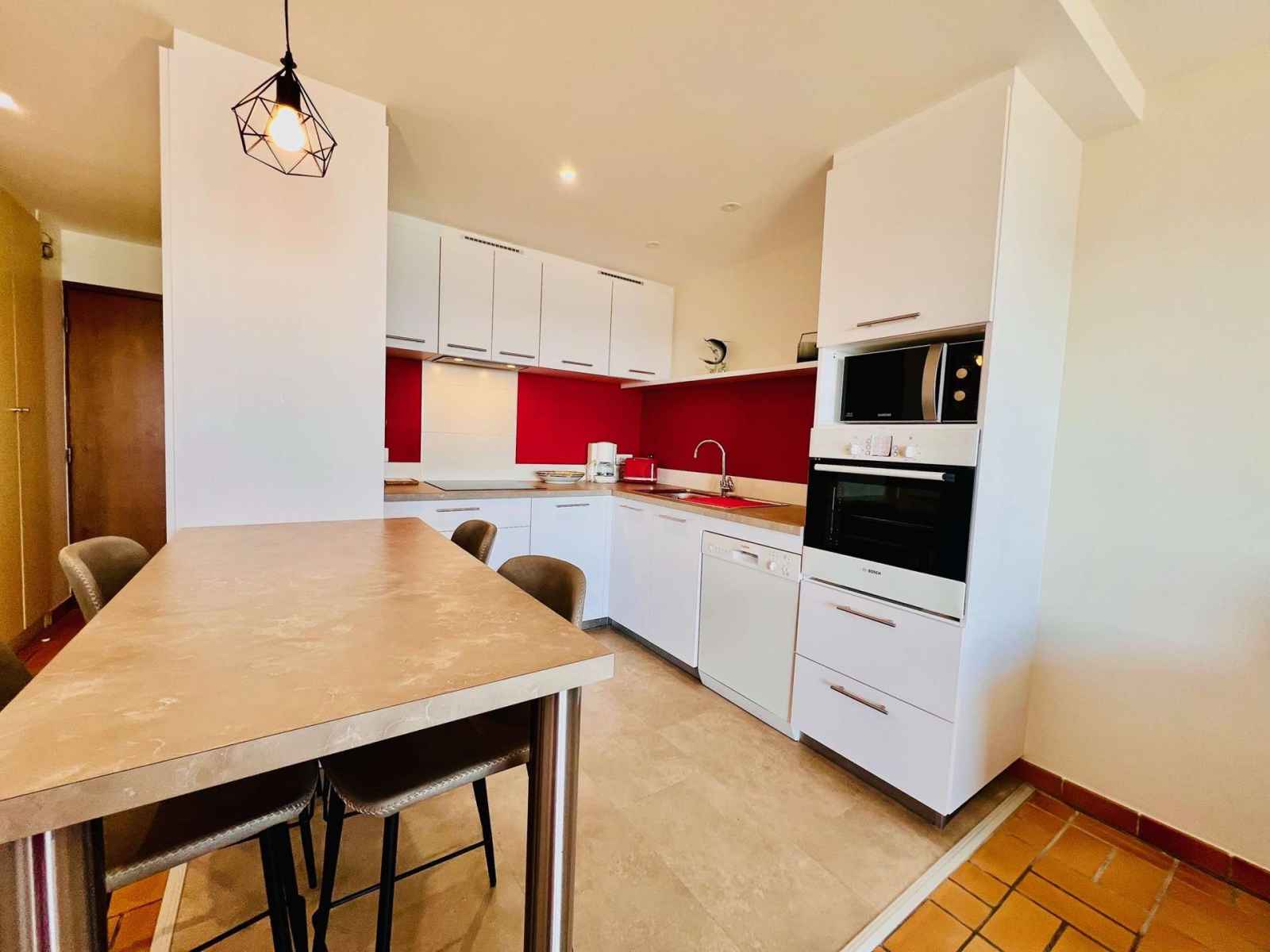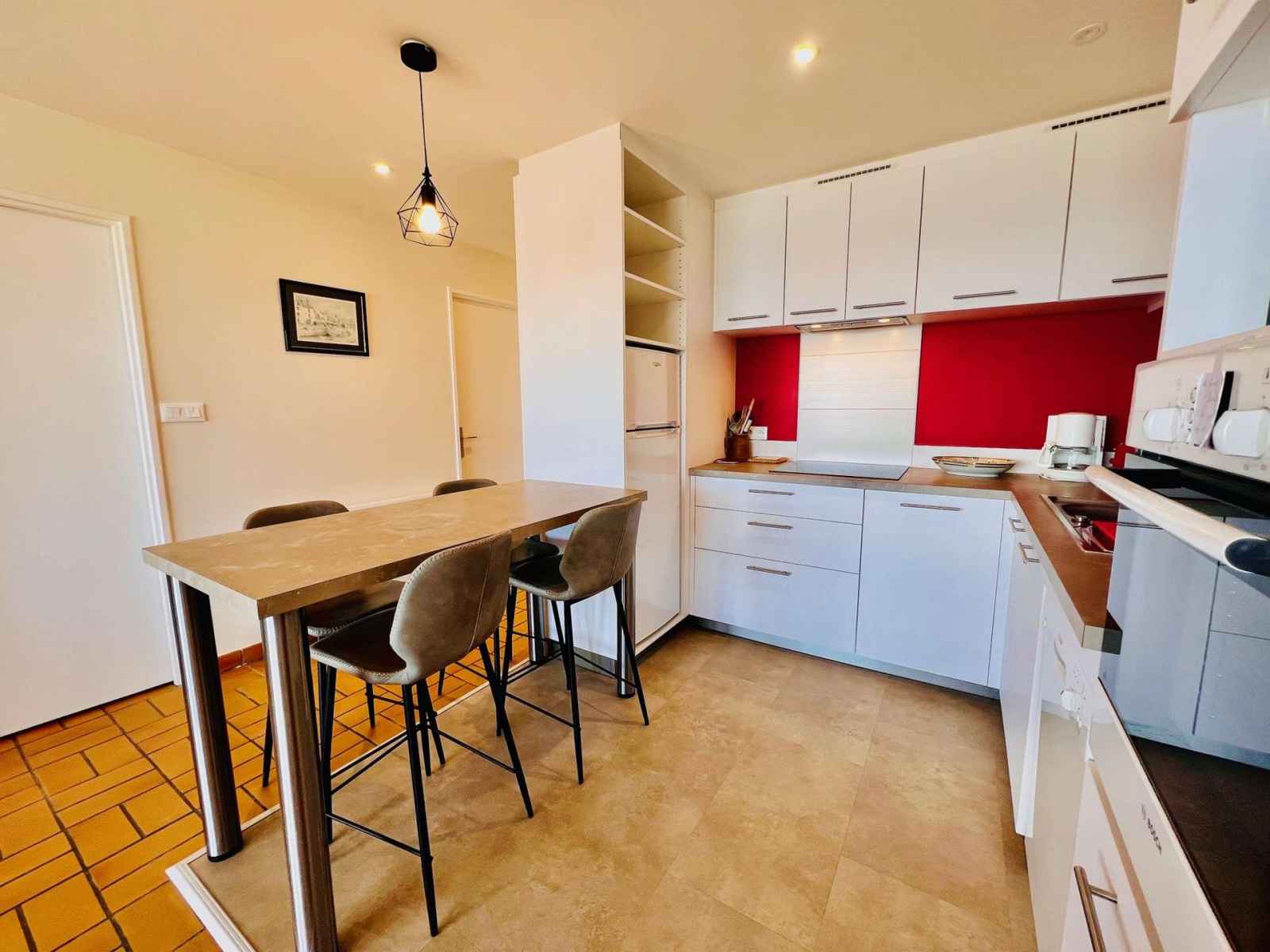induction, lave-vaisselle, micro-onde, réfrigérateur + congélateur, cafetière, bouilloire),