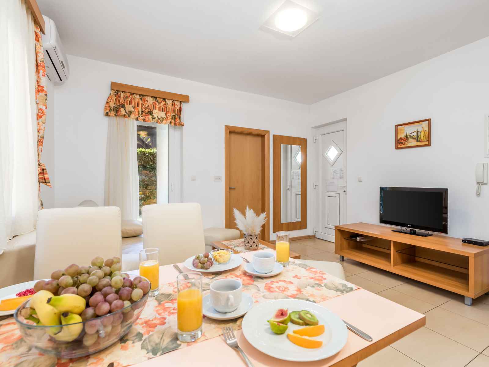 "mihaela 4", apt 2 pièces 35 m2 au 1er étage. aménagement moderne et plaisant: séjour/salle à manger 18 m2 avec 1 divan-lit double, tv (satellite) et air-conditionné. sortie sur le balcon. 1 chambre avec 1 lit double (160 cm, longueur 200 cm). sortie sur la terrasse. cuisine ouverte (4 plaques de cuisson, micro-ondes, congélateur).