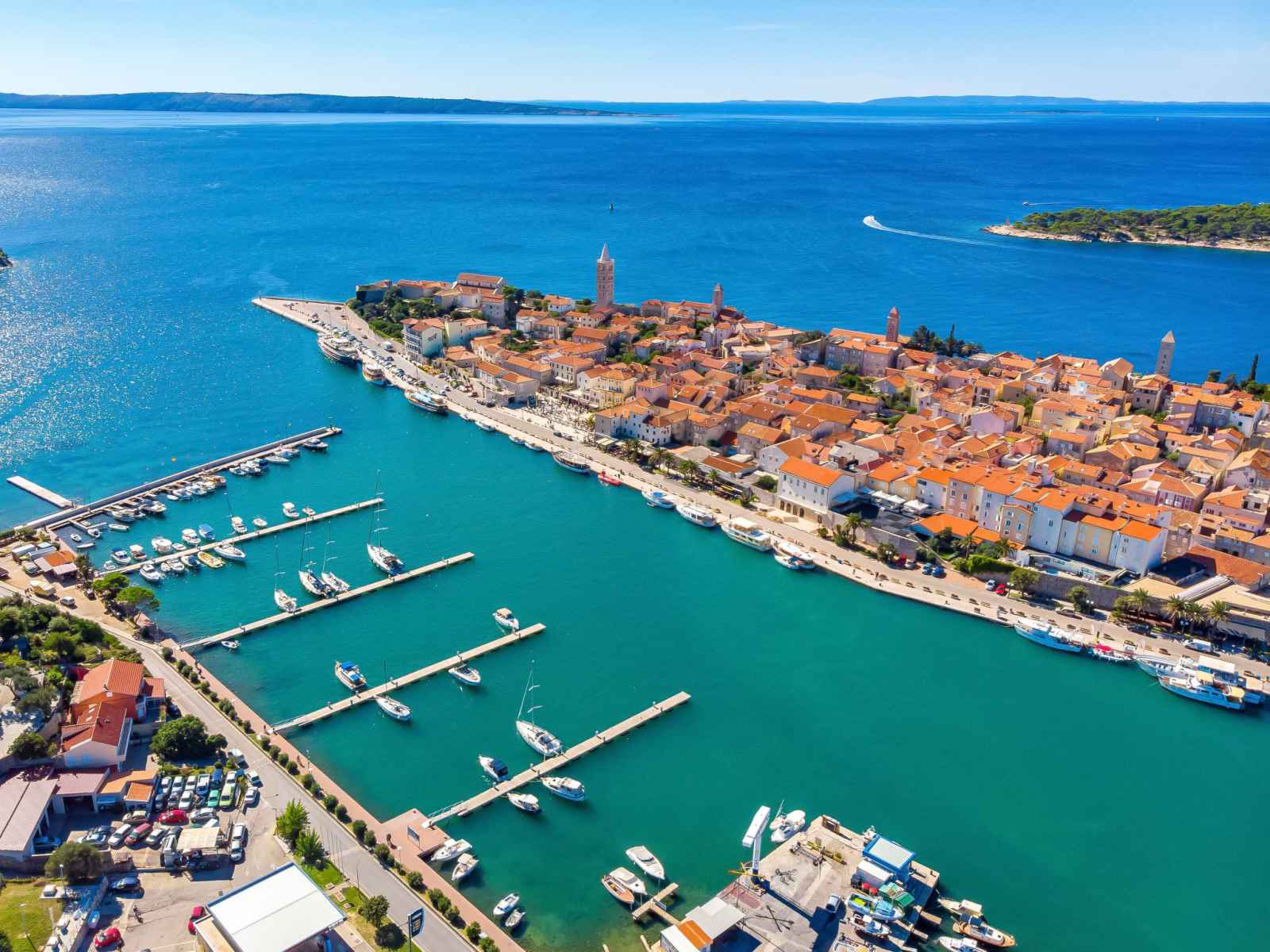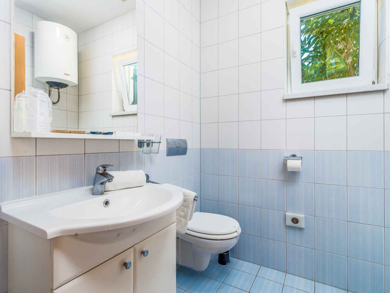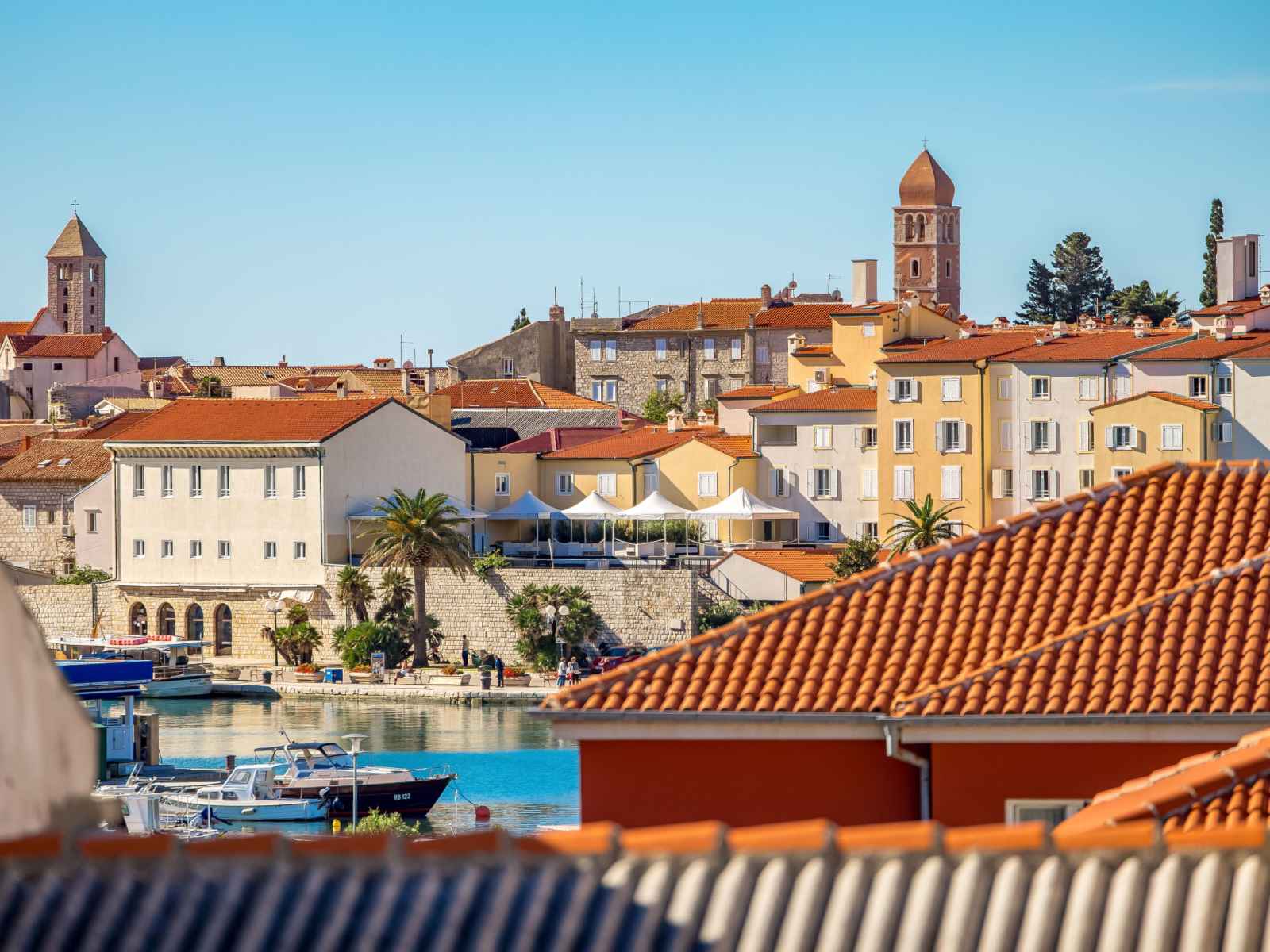 Belle petite résidence. dans le quartier de banjol, à 200 m du centre de rab, situation tranquille, ensoleillée, à 200 m de la mer, à 500 m de la plage, dans une impasse. en commun: terrain (clôturé), jardin entretenu avec pelouse, piscine chauffée (8 x 4 m, profondeur 120 - 160 cm, disponibilité saisonnière: 13.mai. - 30.sep.) avec
