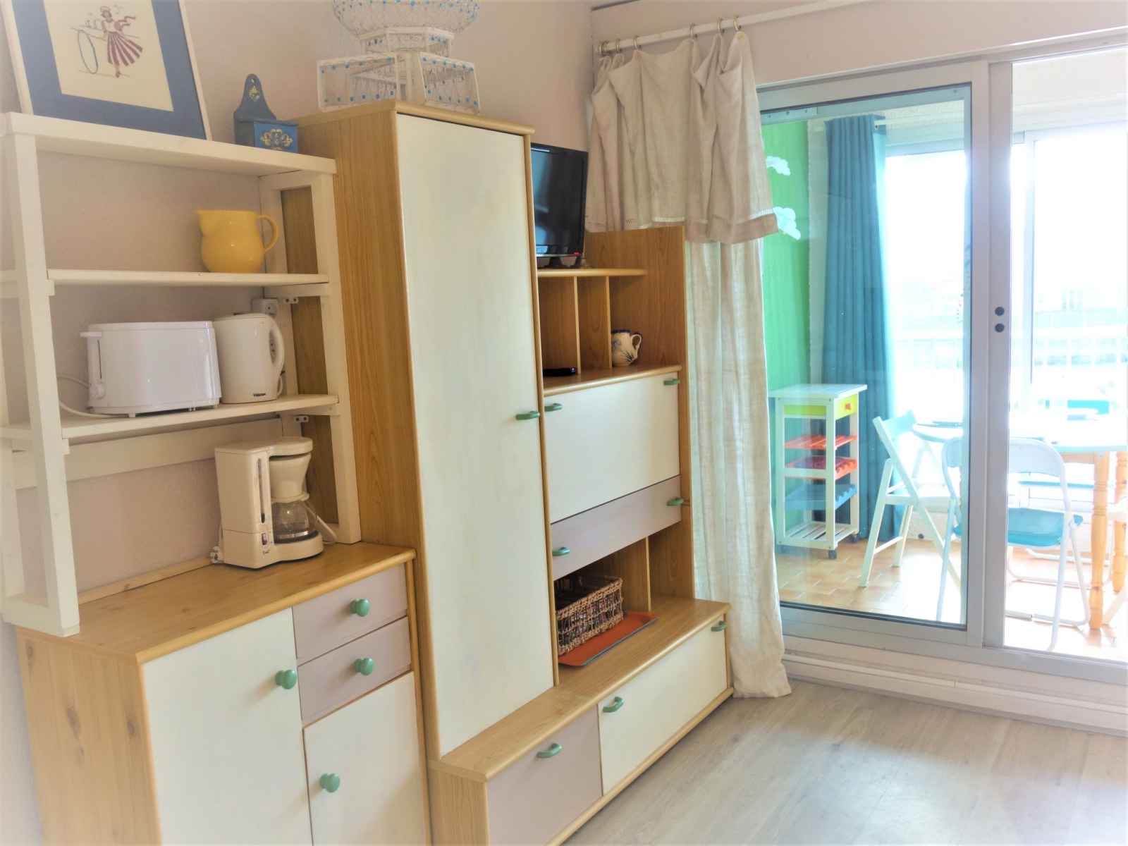 Apt 2 pièces 30 m2 au 1er étage. logement idéal pour 2 adultes + 1 enfant. séjour/salle à manger avec 1 divan-lit double (140 cm, longueur 200 cm), tv (écran plat). sortie sur la loggia. 1 petite chambre avec 1 lit (90 cm, longueur 190 cm). coin cuisine (4 plaques de cuisson, mini-four, micro-ondes, congélateur, cafetière électrique).