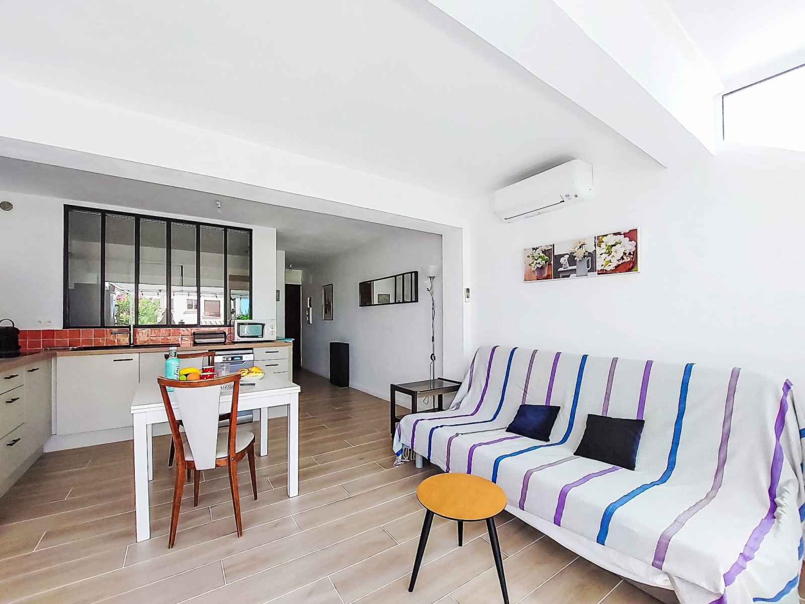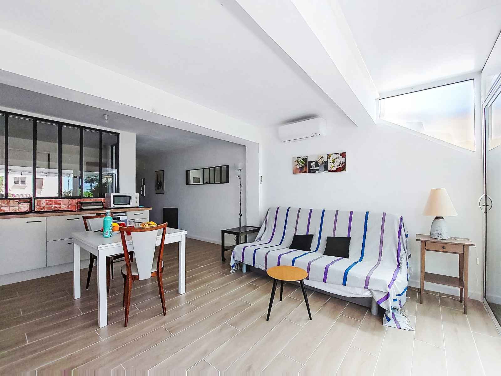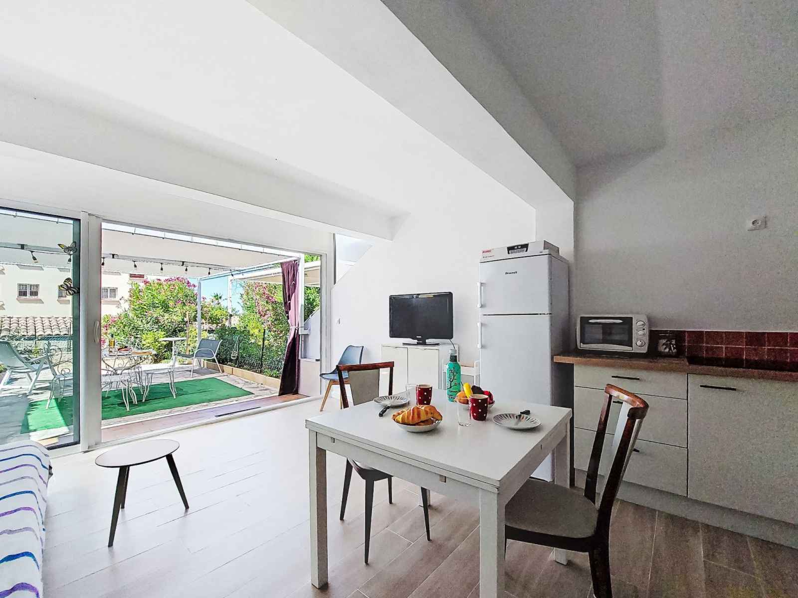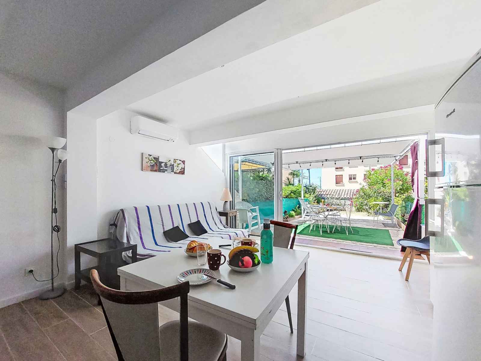 Apt 2 pièces 35 m2, au rez-de-chaussée. clair, aménagement confortable et agréable: séjour/salle à manger avec 1 divan-lit double (140 cm, longueur 200 cm), tv (écran plat), air-conditionné. sortie sur la terrasse. 1 chambre avec 1 grand-lit (140 cm, longueur 190 cm). coin cuisine (mini-four, lave-vaisselle, 3 plaques à induction,
