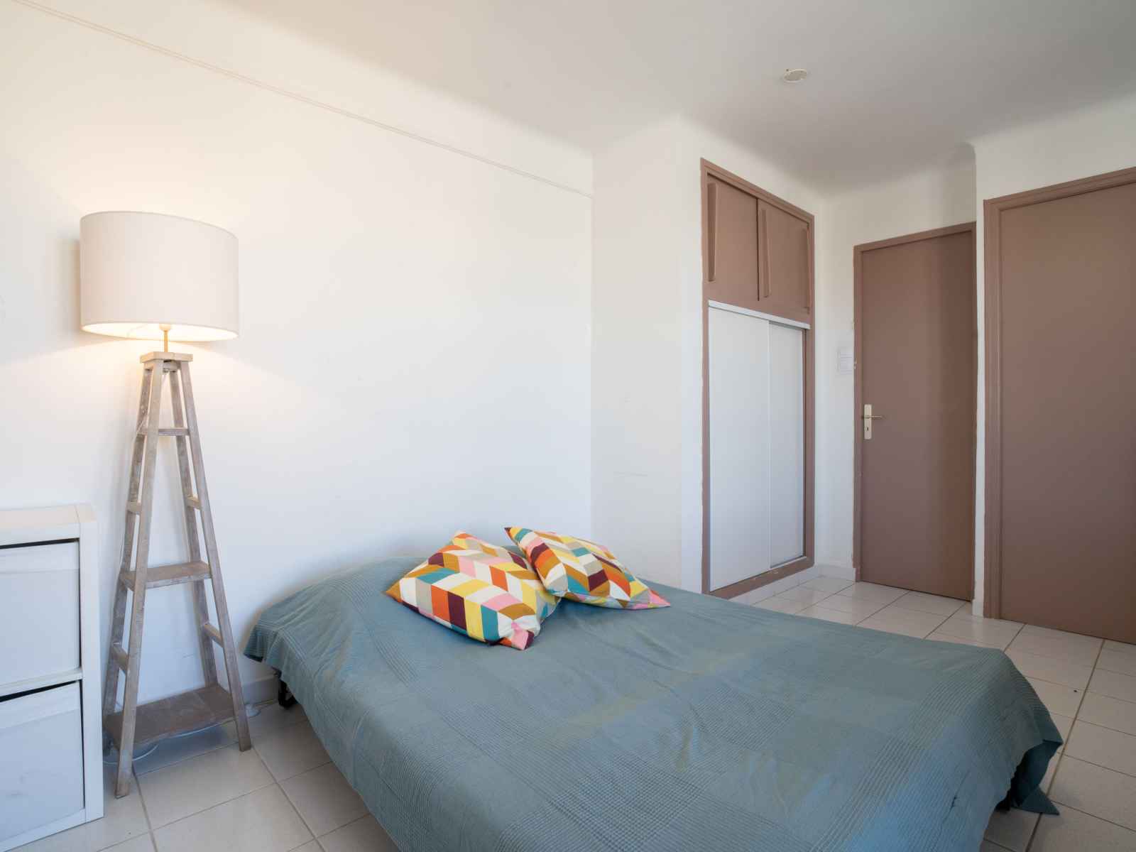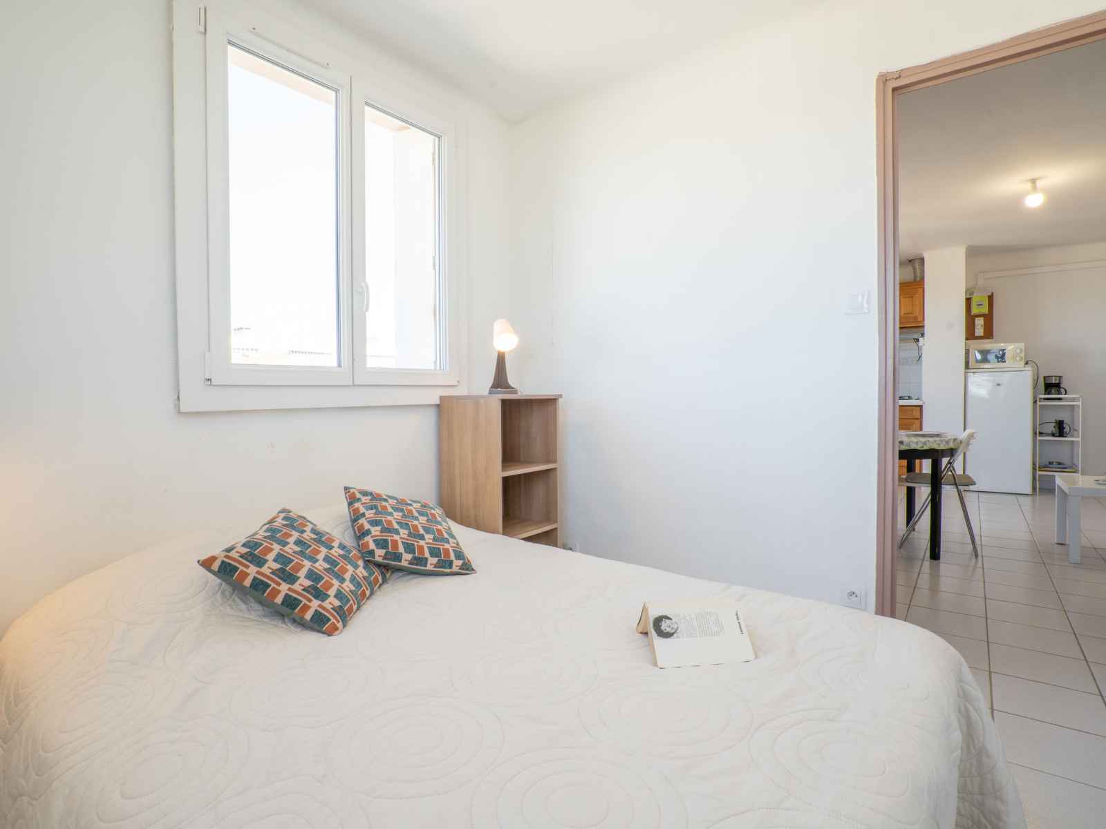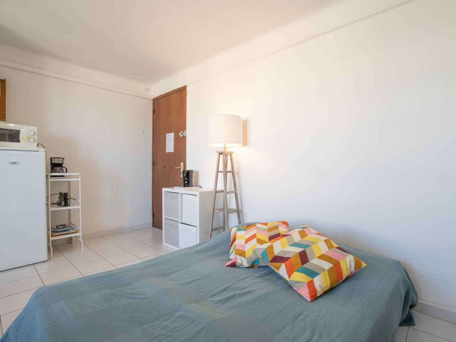 Apt 2 pièces 30 m2 au 2ème étage. clair, aménagement agréable: séjour/salle à manger avec 1 divan-lit double (140 cm, longueur 190 cm), tv (écran plat). sortie sur la terrasse. 1 chambre avec 1 grand-lit (1 x 140 cm, longueur 190 cm). coin cuisine (4 plaques de cuisson, grille-pain, bouilloire électrique, micro-ondes, cafetière