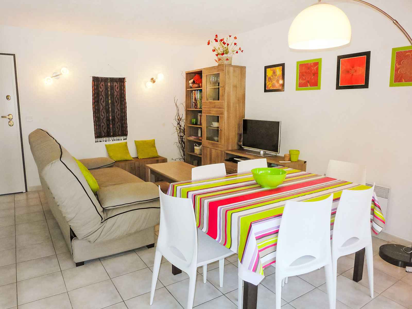 Apt 2 pièces 44 m2 au 1er étage. aménagement fonctionnel: séjour/salle à manger avec 1 divan-lit double (1 x 140 cm, longueur 190 cm), tv et chaînes de tv internationales (écran plat), dvd. sortie sur la terrasse. 1 chambre avec 1 grand-lit (1 x 140 cm, longueur 200 cm). cuisine ouverte (four, 3 plaques à induction, grille-pain,