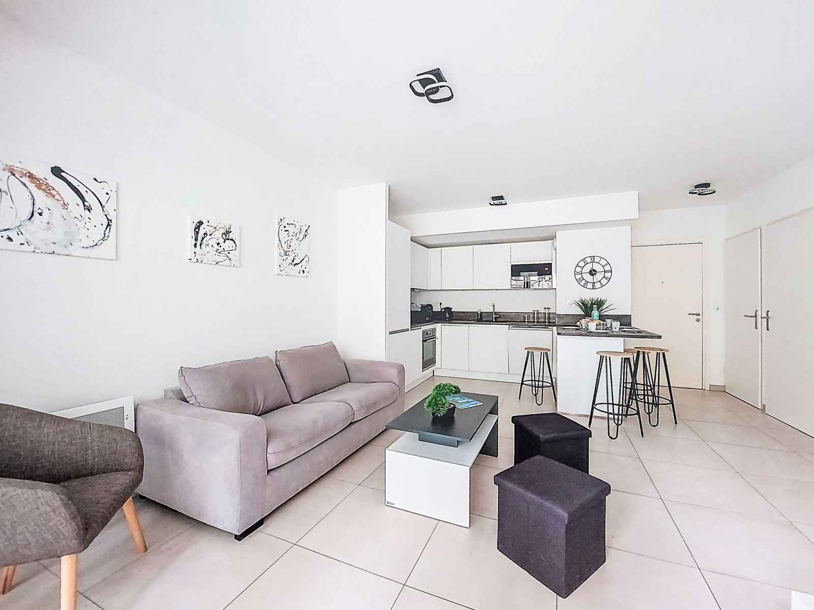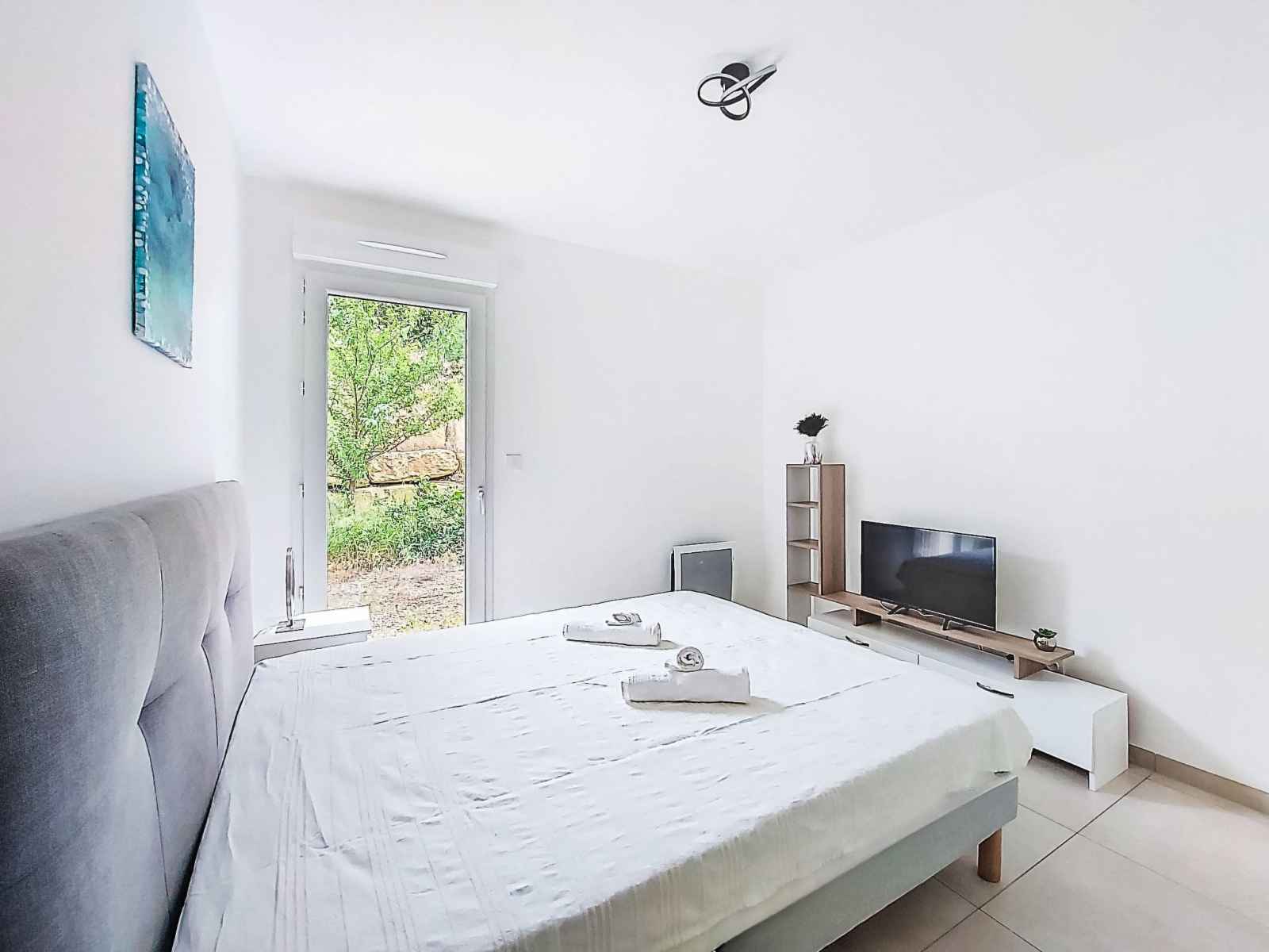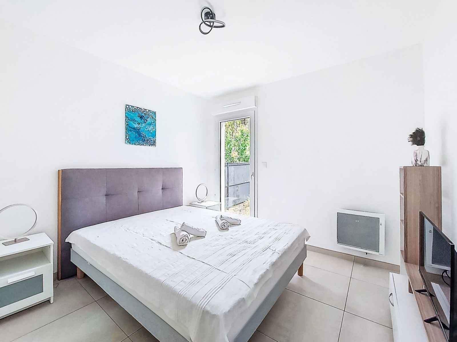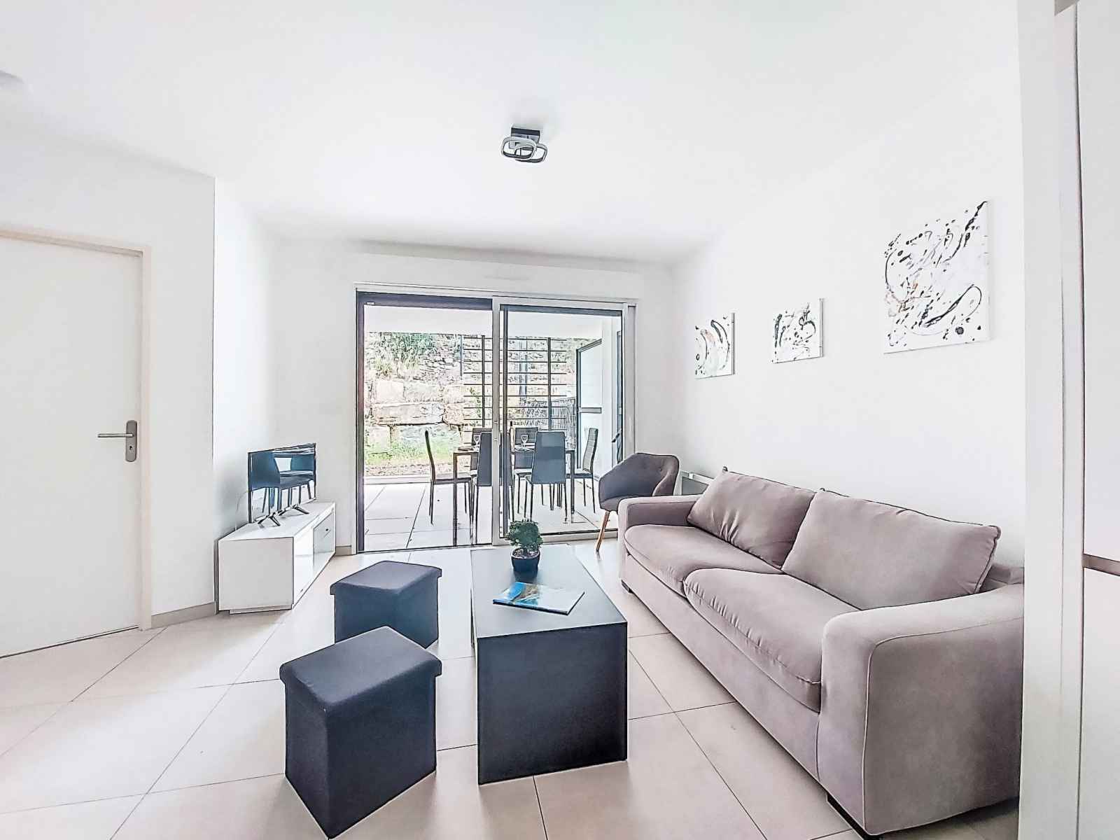 Apt 2 pièces 41 m2, rez-de-chaussée surélevé. clair, aménagement confortable et agréable: séjour/salle à manger avec 1 divan-lit (140 cm, longueur 190 cm), tv (écran plat). sortie sur la terrasse. 1 chambre avec 1 grand-lit (140 cm, longueur 200 cm), tv. sortie sur le jardin. cuisine ouverte (four, lave-vaisselle, 3 plaques à induction,