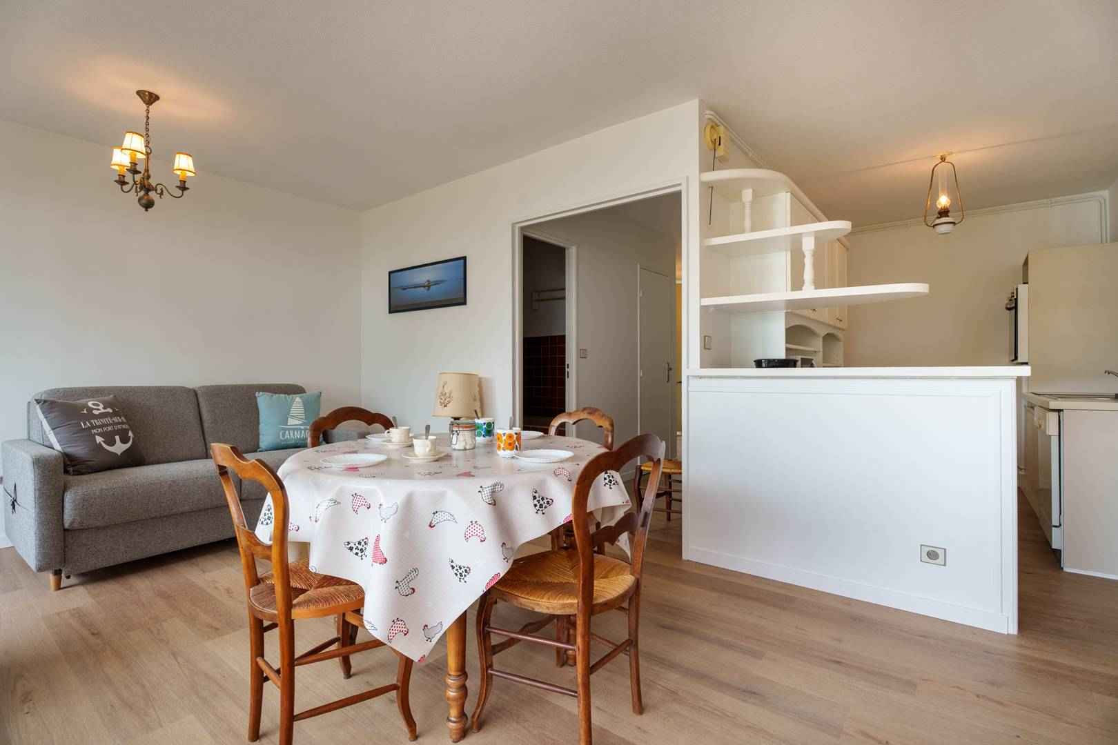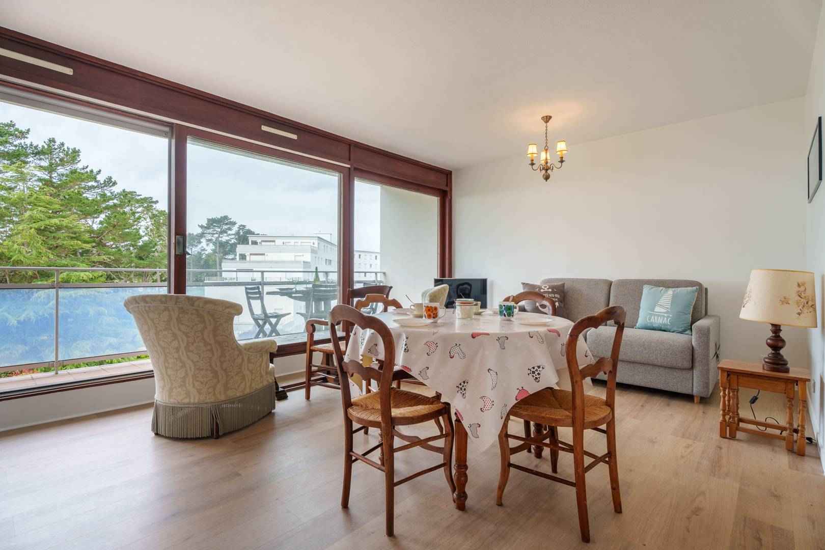 - Séjour avec partie repas (table + chaises) et partie salon (TV, canapé Rapido : couchage 2 personnes, 140, couette), donnant sur loggia orientée Sud et vue mer (salon de jardin)