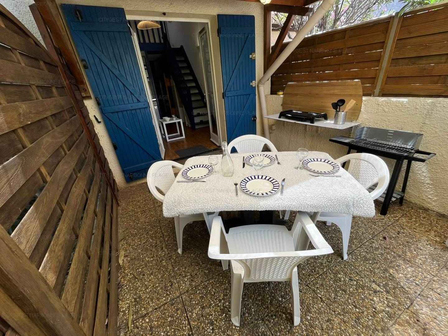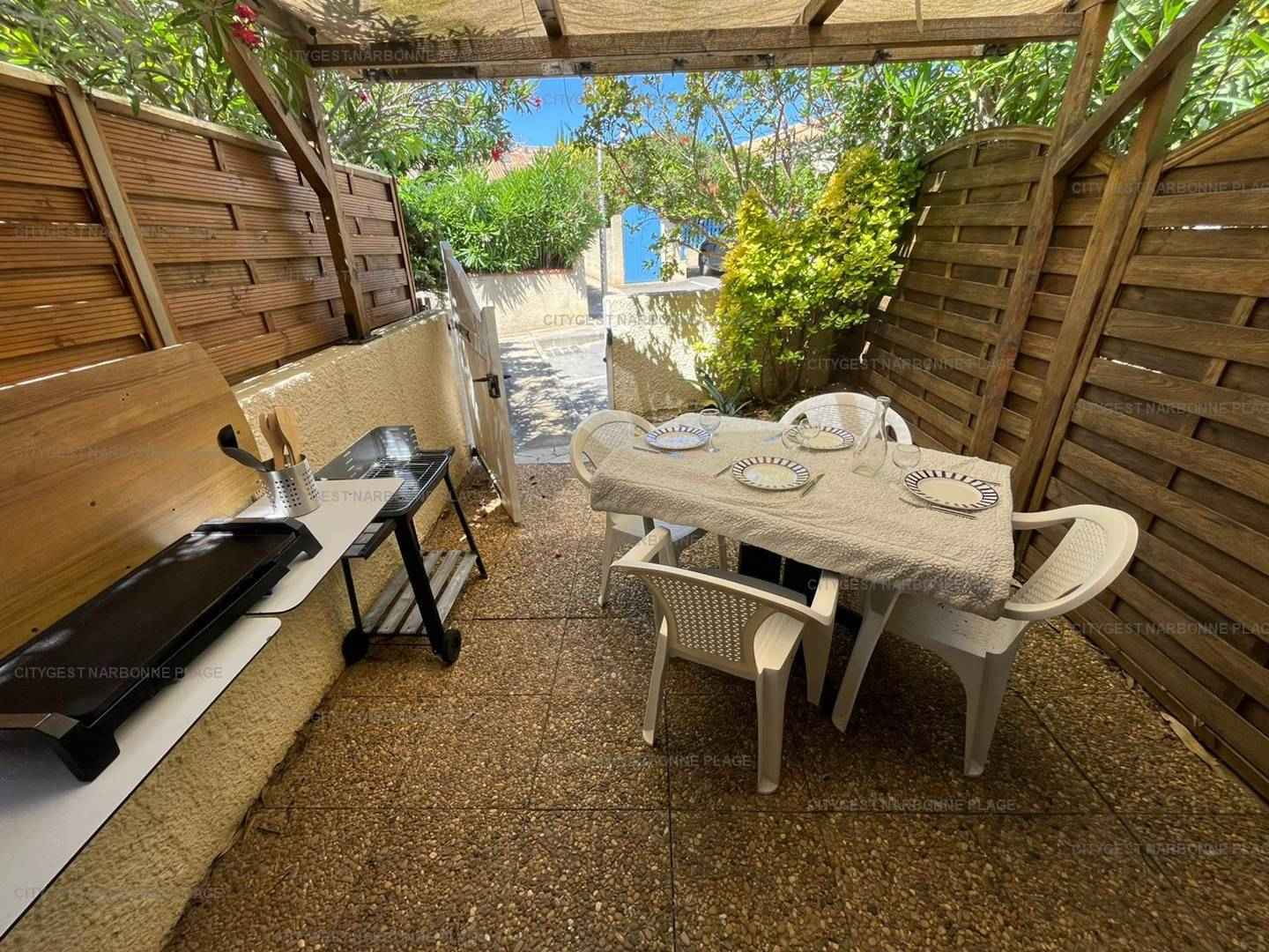 Terrasse privative avec salon de jardin.