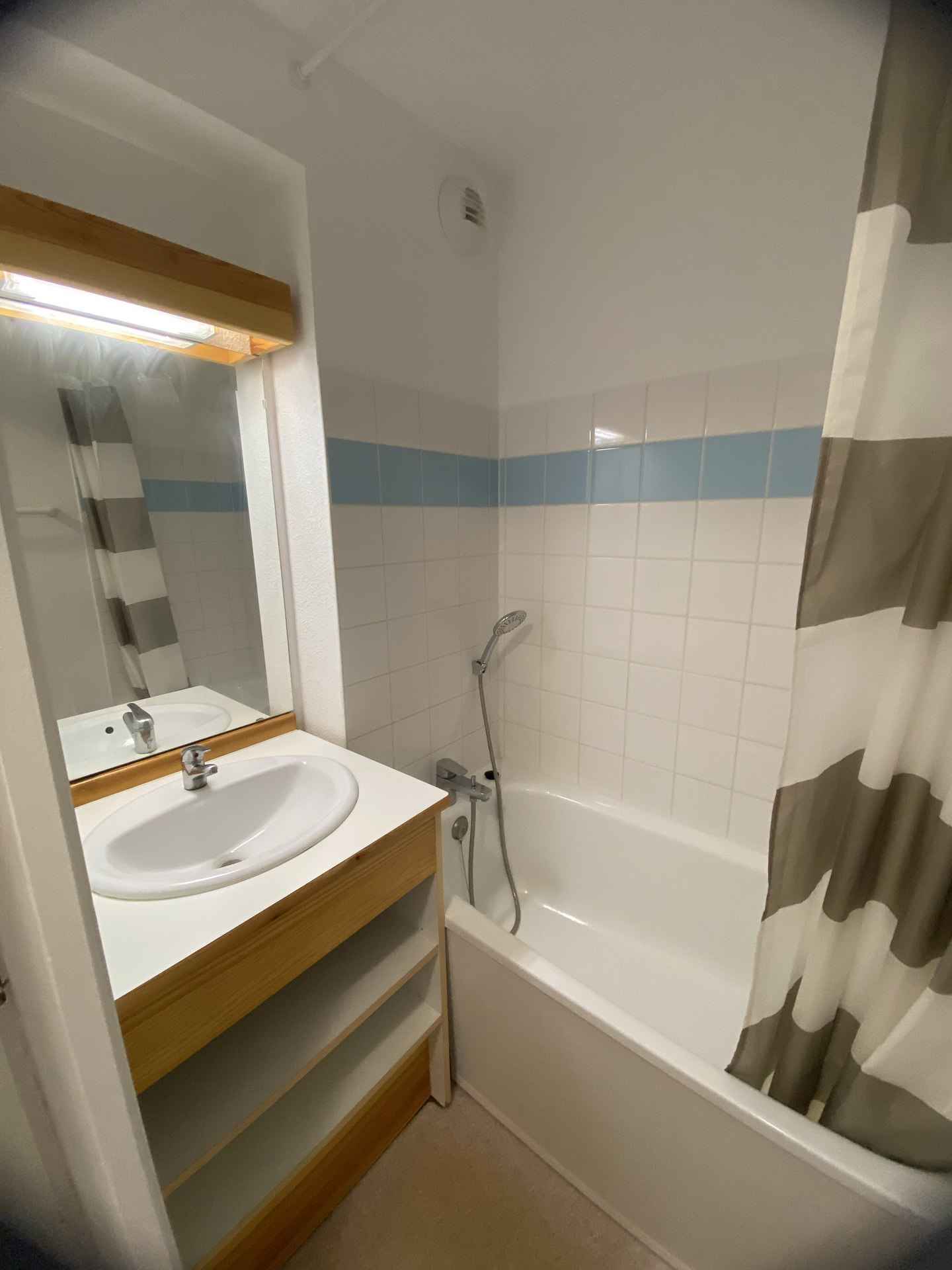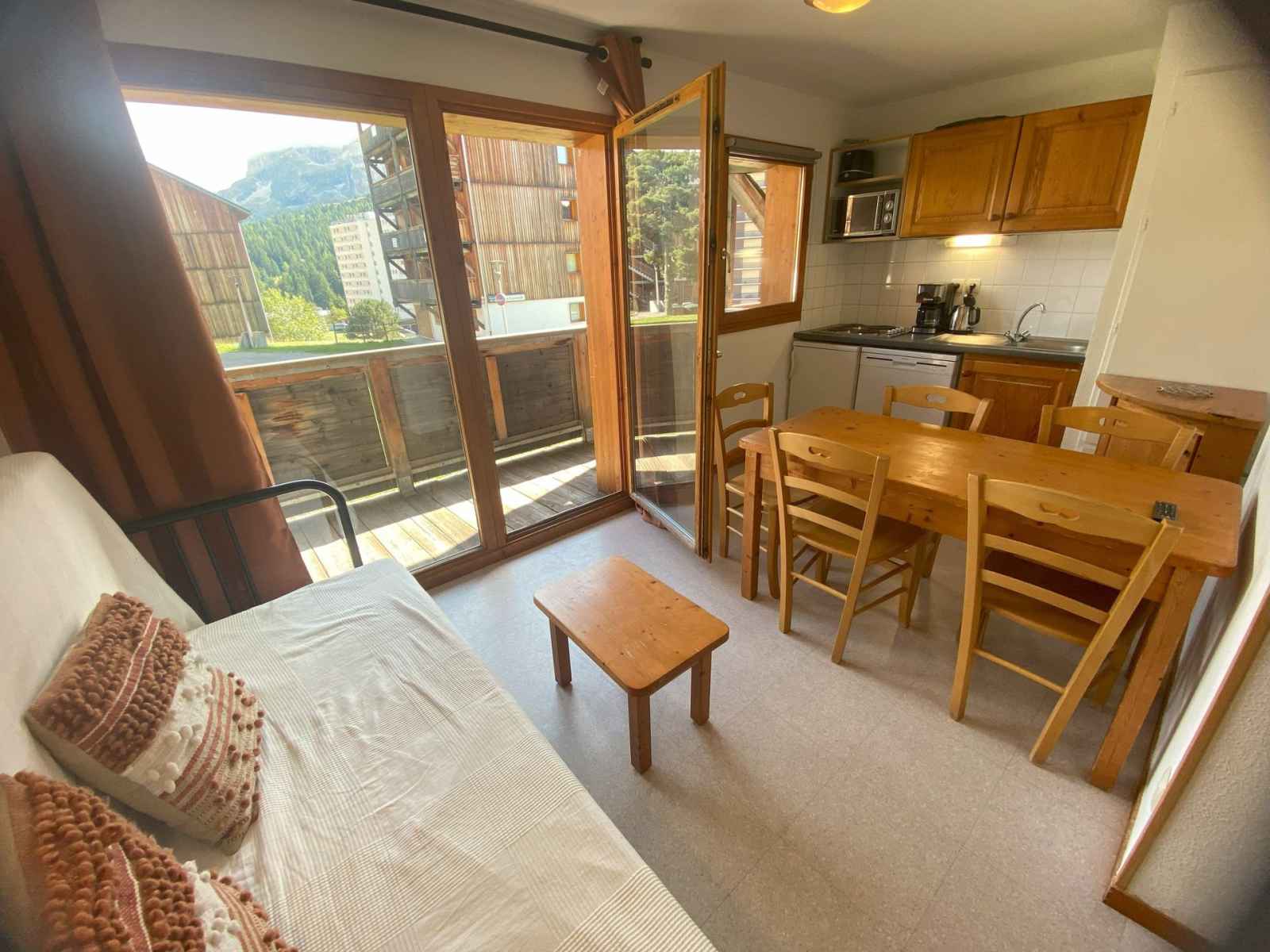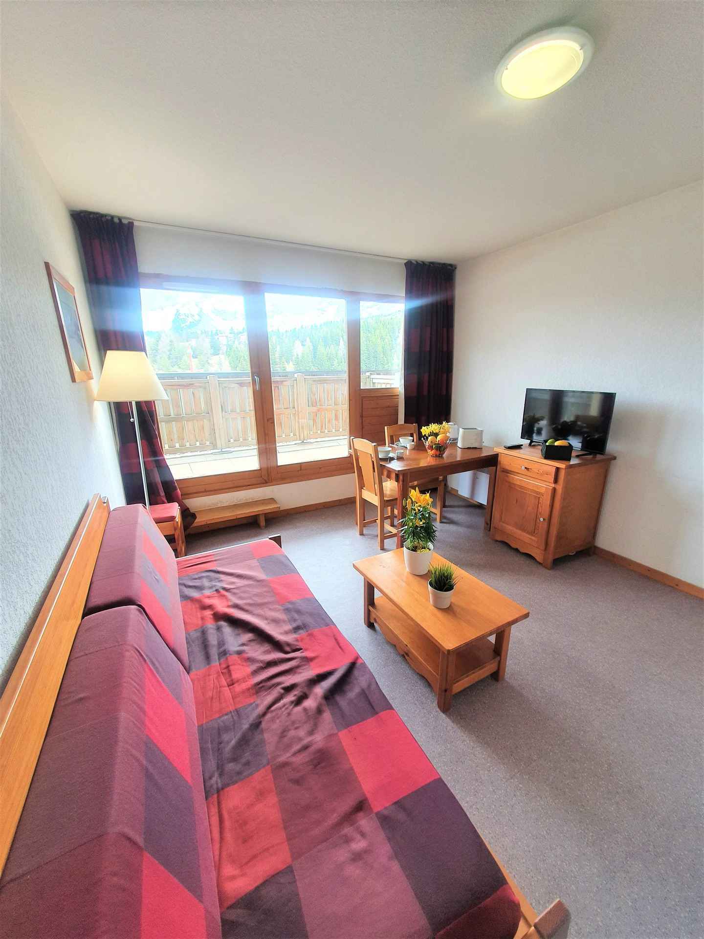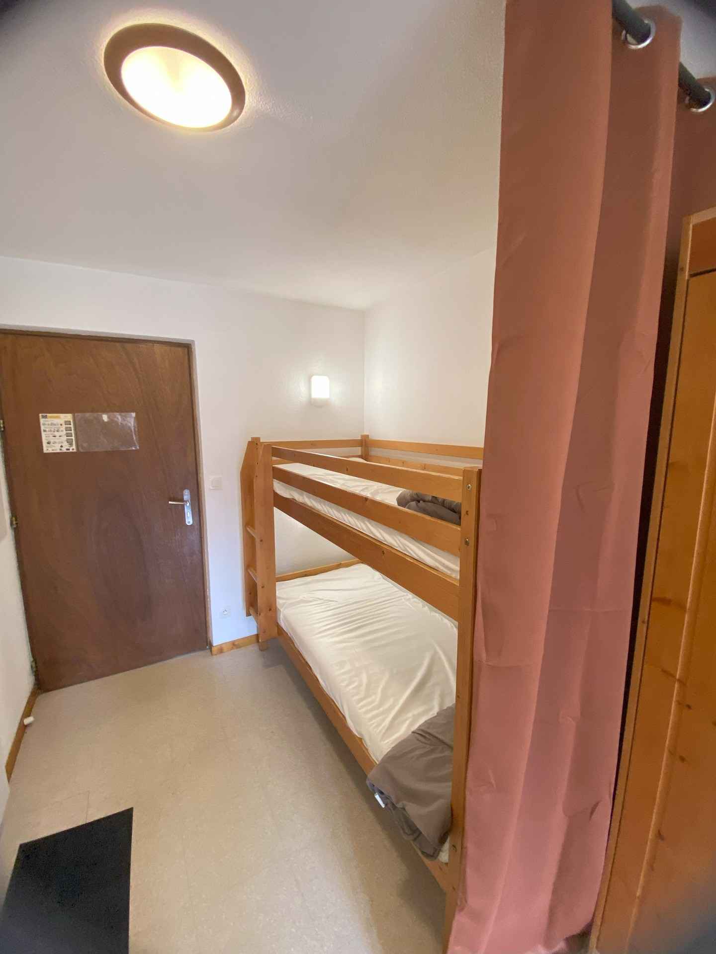 séjour avec canapé lit. coin montagne avec 2 lits superposés. chambre avec 1 double. appartement équipé de couettes (possibilité de location de housse de couette).