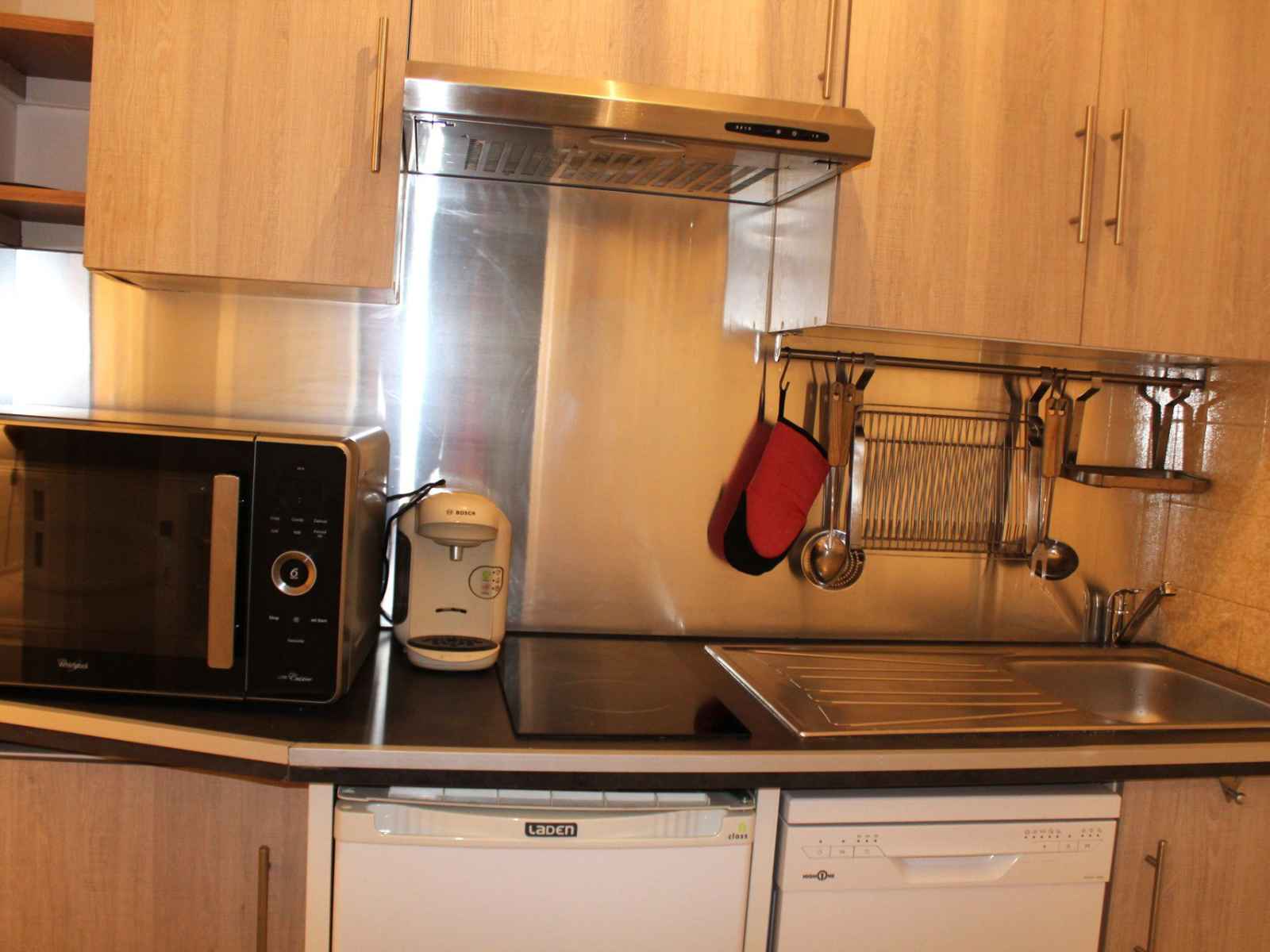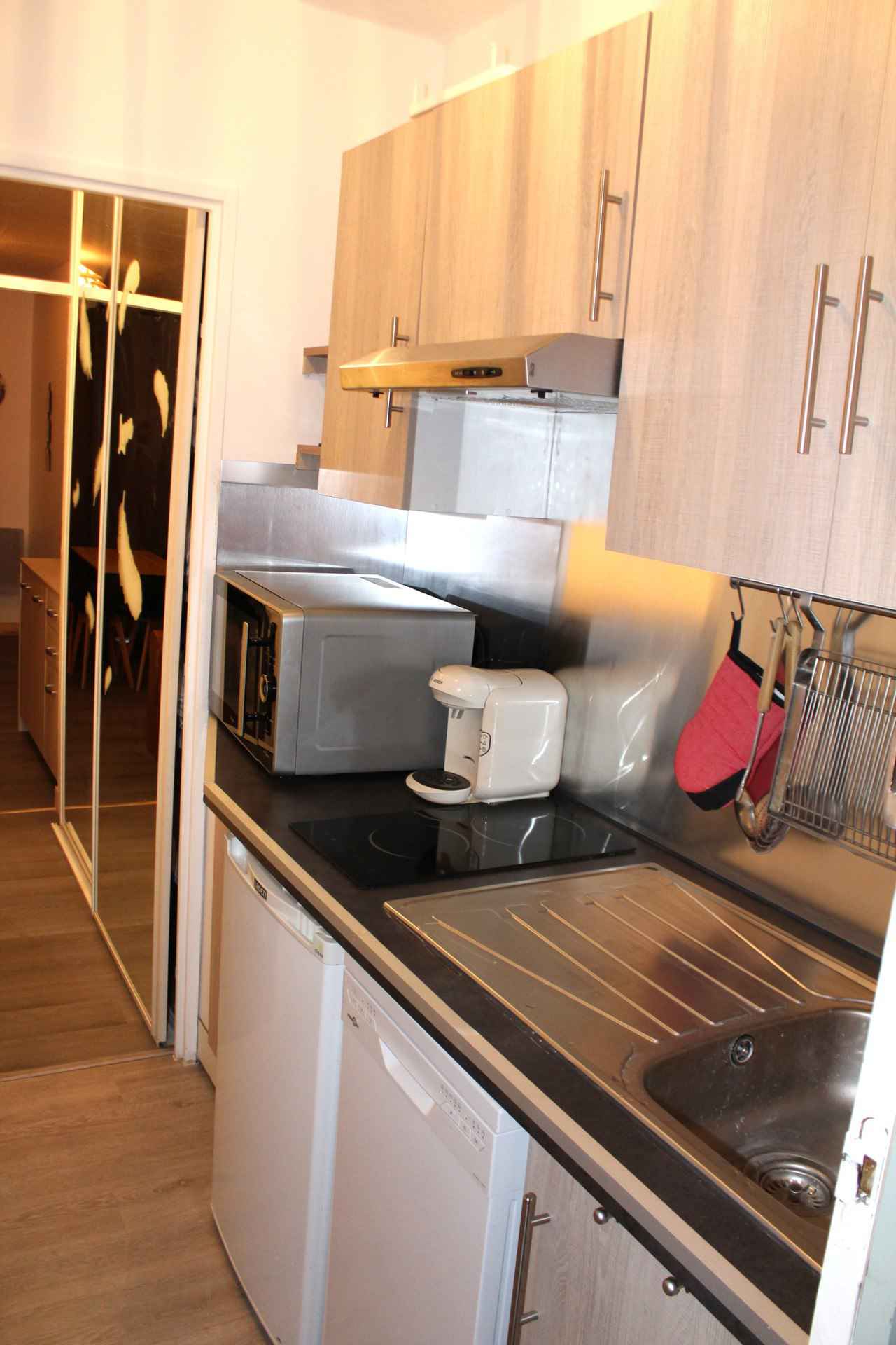 kitchenette équipée, refrigérateur, petit congélateur, plaques chauffantes, lave vaisselle. cafetière bosch à capsule, four