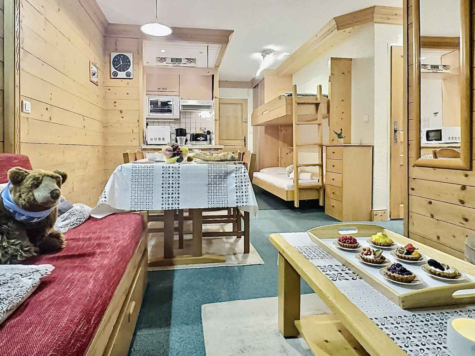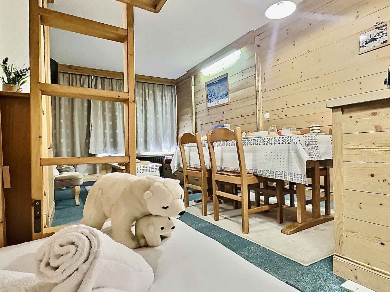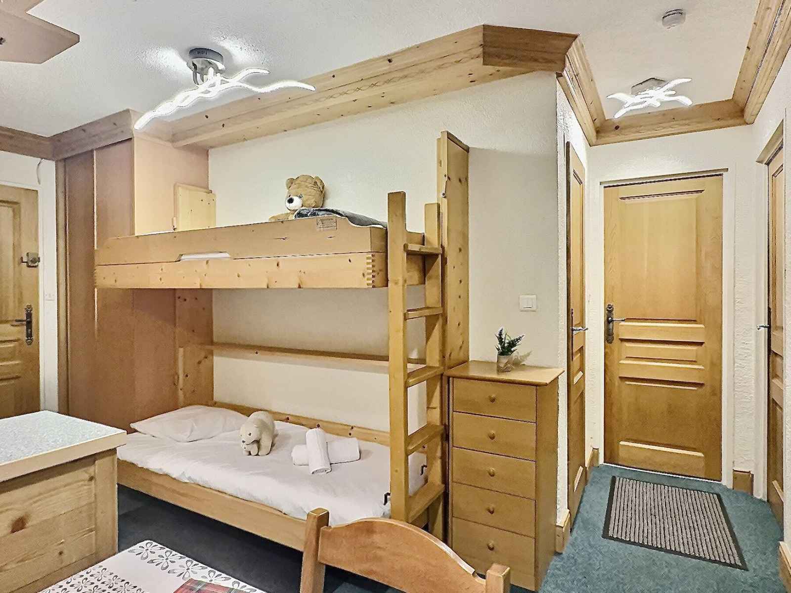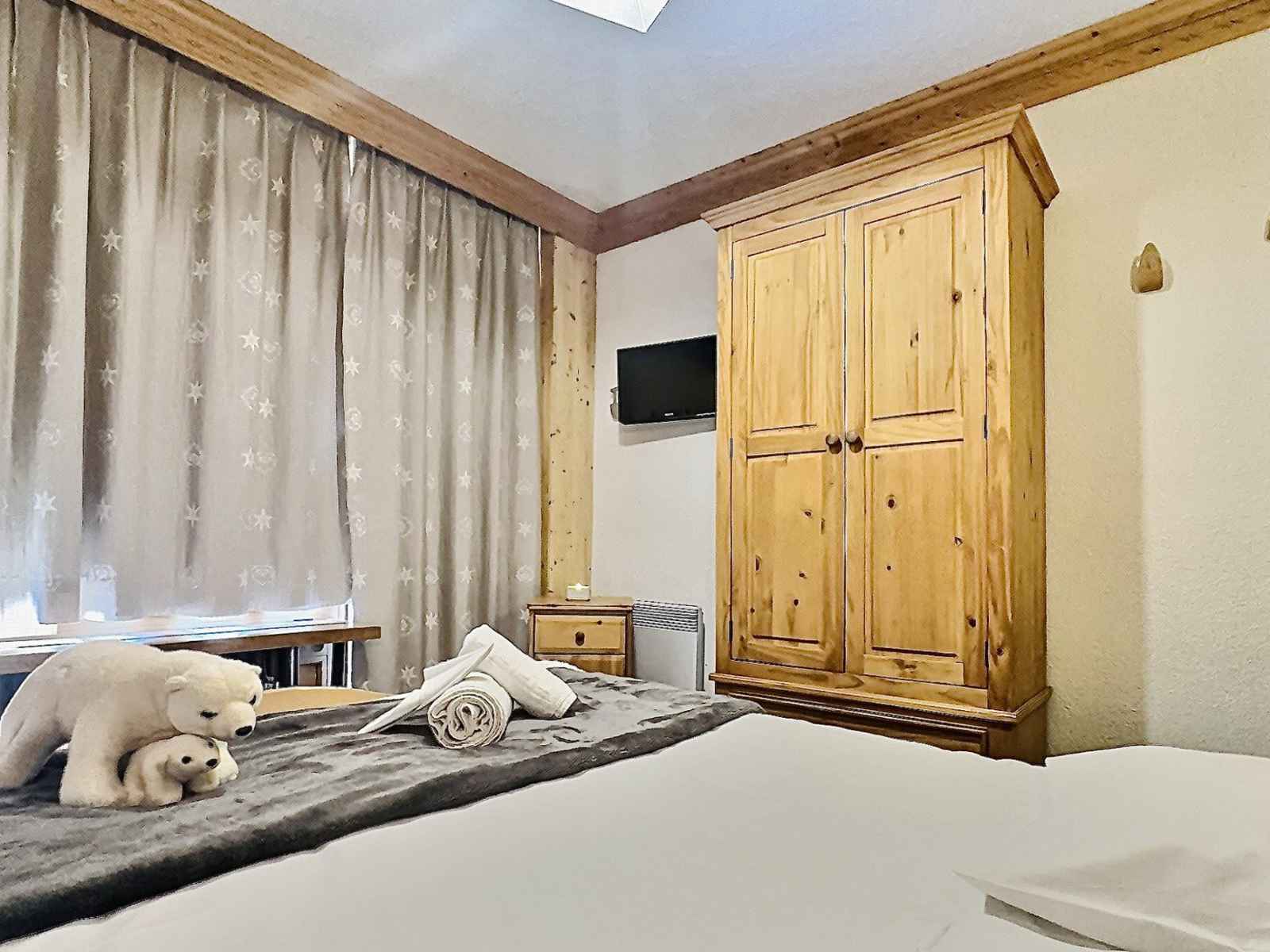 oreillers" par la commune et 2* en catégorie 'Meublés de Tourisme". Il se trouve au 4ème étage d'une résidence avec ascenseur, au pied des pistes et à moins d'une minute des commerces. Les couchages Dans le Séjour se trouve 1 ensemble de lits gigognes ainsi qu'un coin montagne dans l'entrée avec 2 lits simples rabattables. merci de noter que le lit supèrieur ne convient pas à un enfant de moins de 6 ans. Dans le chambre 1 lit double ainsi qu'une télévision La cuisine ouverte sur le séjour Elle est tout équipée avec des plaques électriques, un four, un micro ondes , un réfrigérateur et un lave vaisselle. Les sanitaires A votre disposition une salle de bains avec baignoire et un WC séparé. Les équipements complémentaires Une télévision dans le séjour avec lecteur DVD, une autre dans la chambre. Un Casier à ski. Informations supplémentaires Linge de lit et de toilette en supplément. Nos amis les animaux ne sont pas tolérés dans cet appartement. Appartement non fumeur