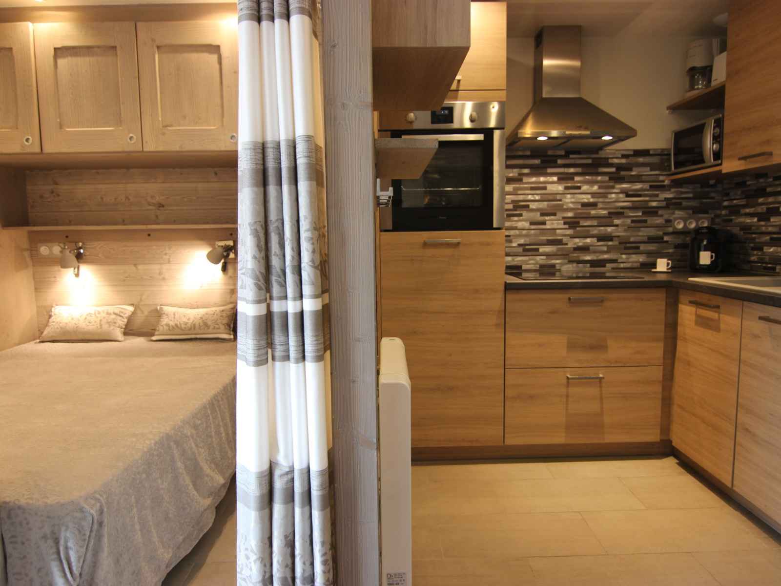 coin montagne : un lit double, de nombreux rangements aménagés, séparation par un rideau.