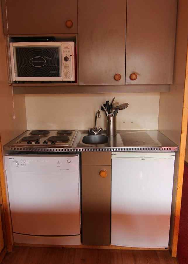 coin cuisine: four, lave-vaisselle, plaques électriques et réfrigérateur.