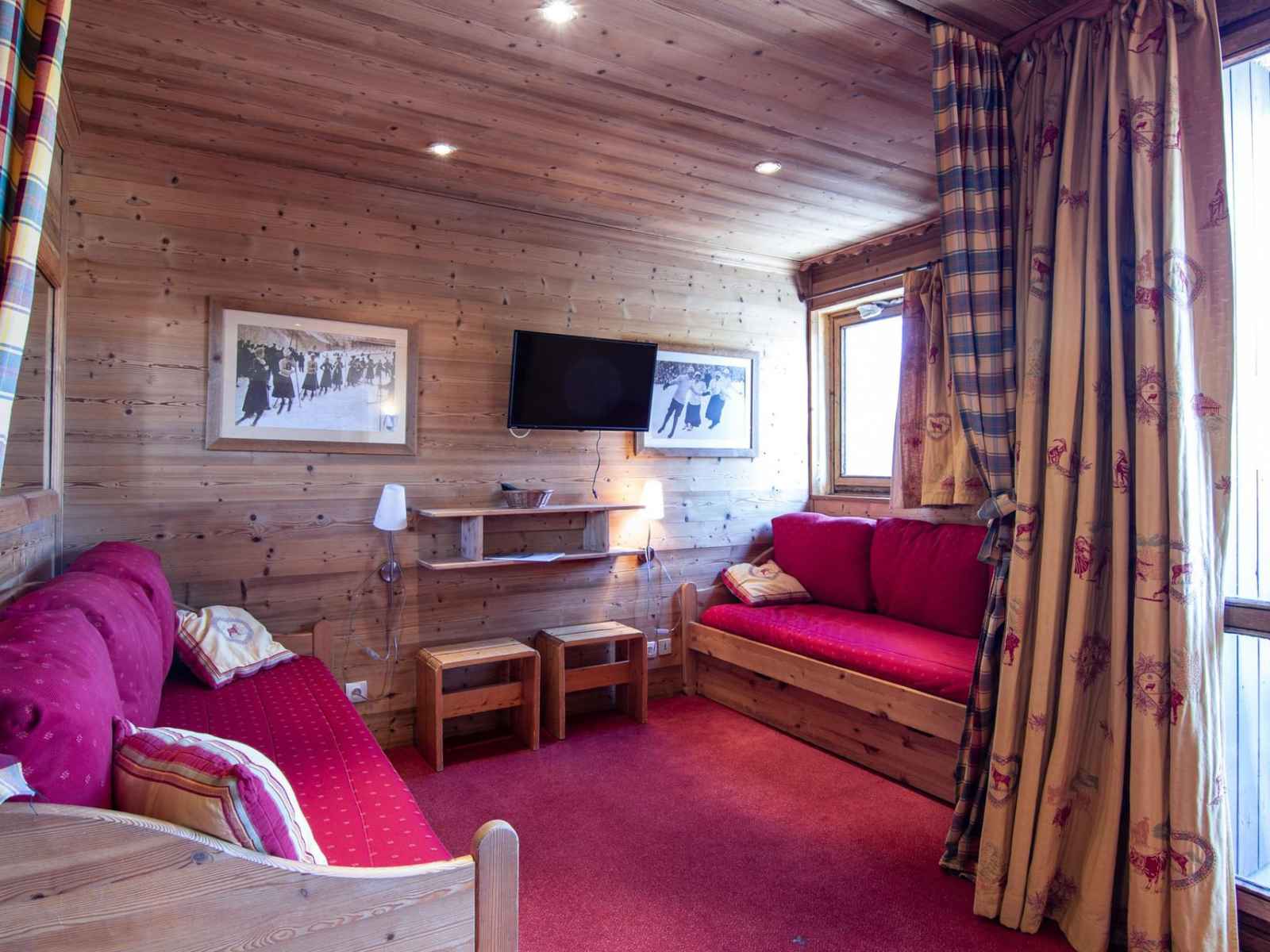 chambre: banquette lit (1pax), canapé gigogne (2pax), tv, fermée par un rideau