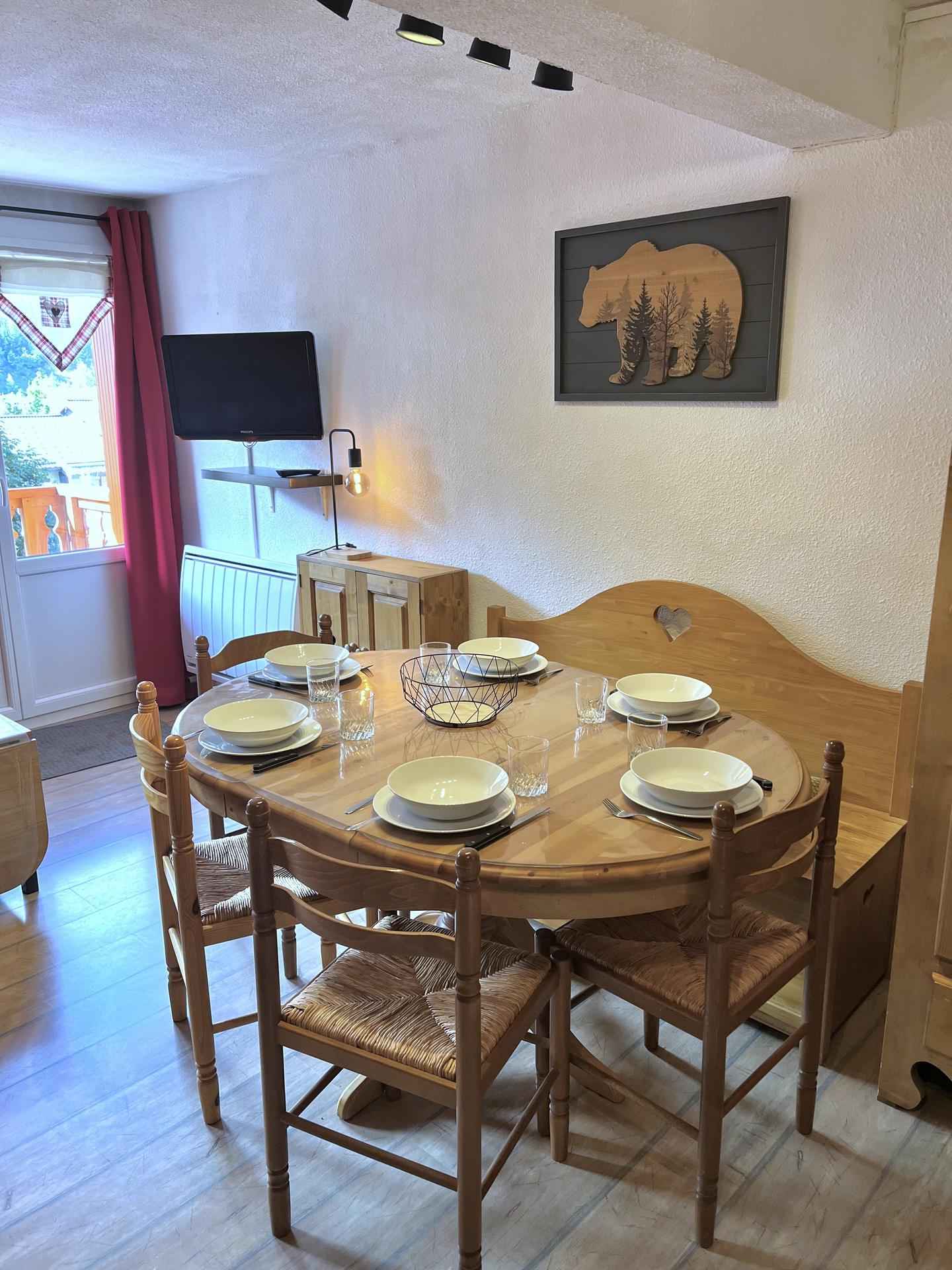 mini-four, micro-ondes, plaque vitrocéramiques (3 foyers), réfrigérateur, lave-vaisselle - Coin salon : télévision, Wifi Salle de bains (Niv +1) : lavabo, douche. 2 WC indépendants. SERVICES/OBSERVATIONS : Animaux refusés. Linge de lit et de toilette non fournis. Ménage de fin de séjour inclus. Casier à ski. Parking collectif non privatif. 2 balcons (Niv 0 et +1/ Ouest).