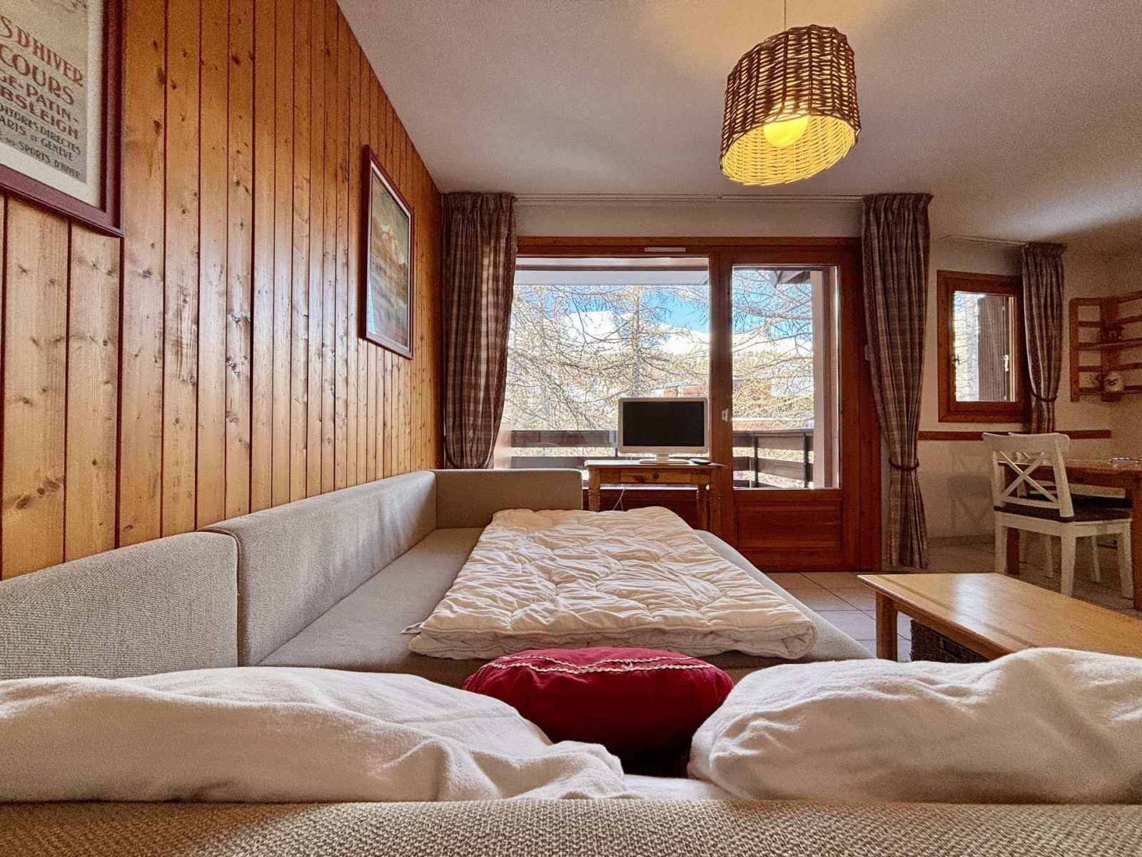 D'un séjour lumineux et cocooning avec un canapé lit double.