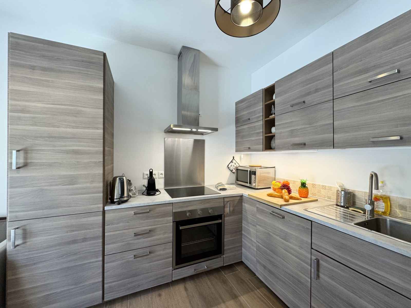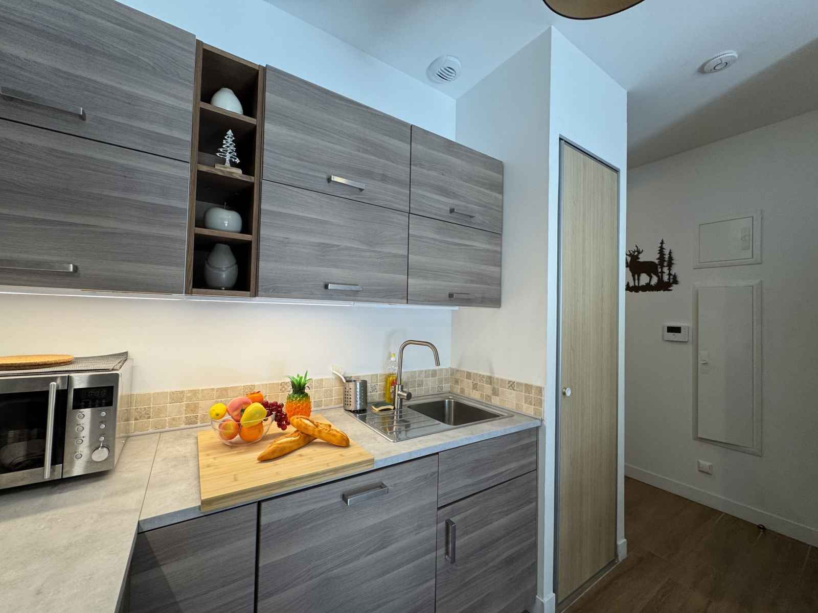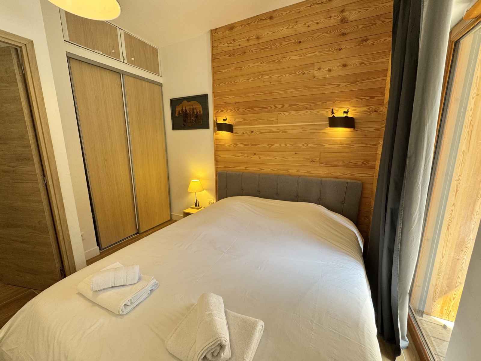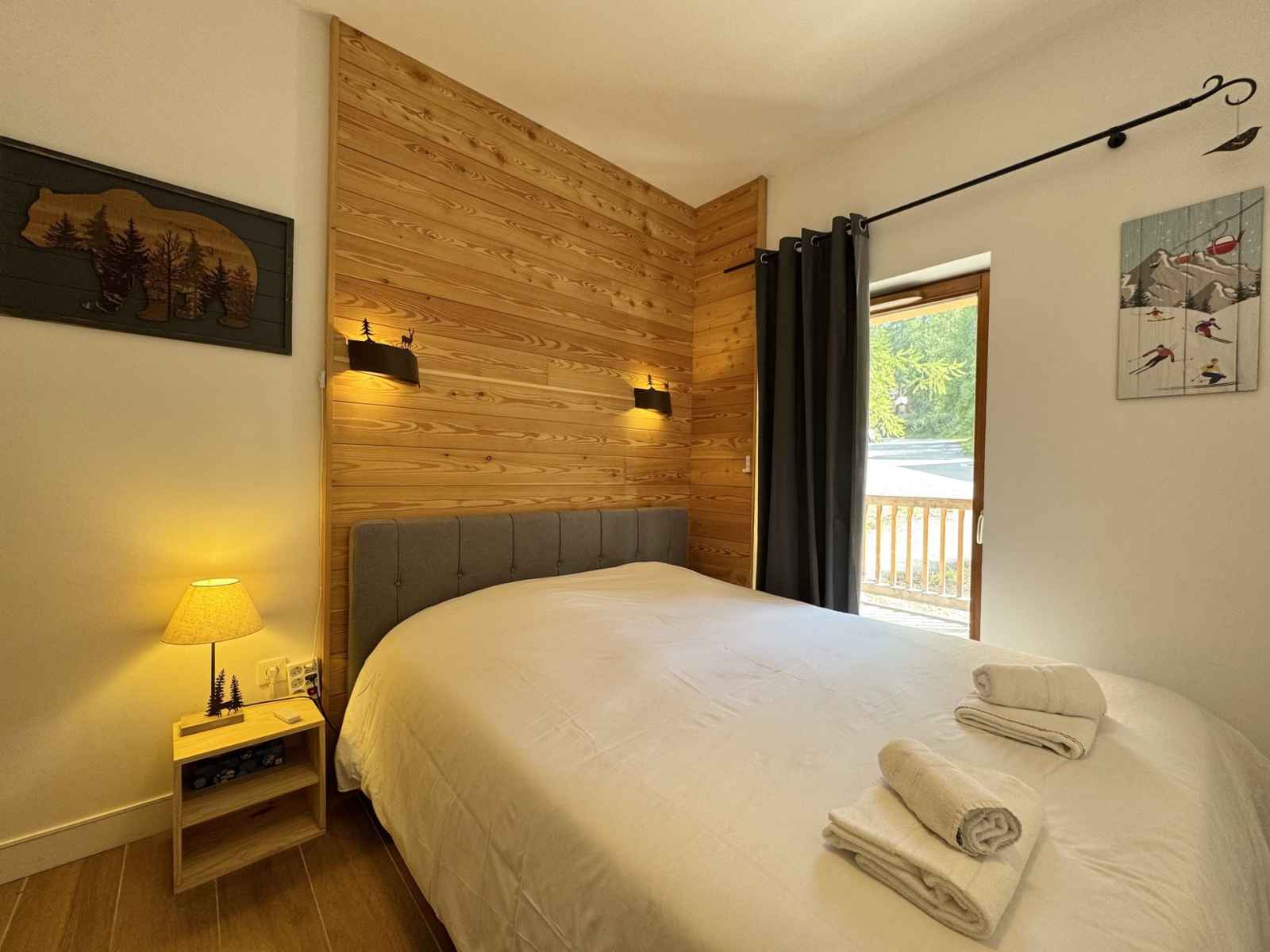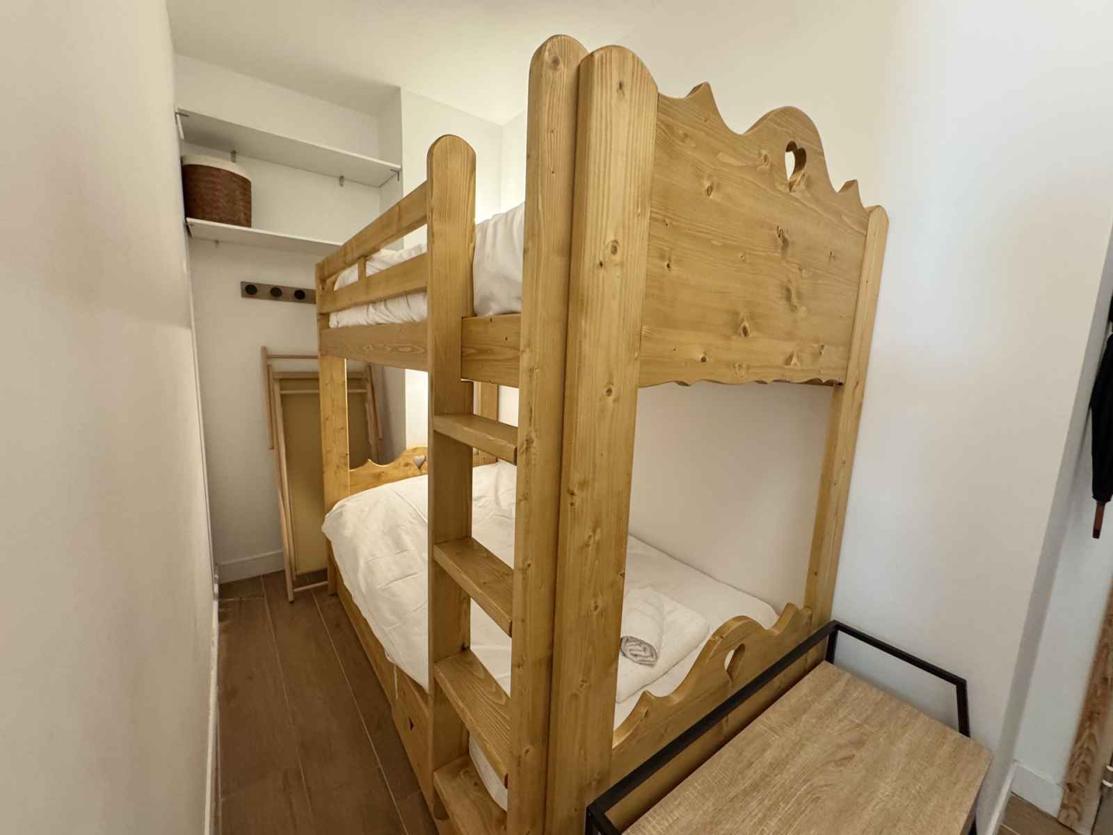 avec compartiment congélateur, four, plaques à induction, bouilloire, machine à café Nespresso, micro-ondes, mixeur plongeant, appareil à raclette et grille-pain. Le salon, convivial et confortable, est agrémenté d’une télévision. L’appartement dispose d’une chambre avec un lit double (160x200), d’un coin montagne avec deux lits simples superposés, ainsi que d’une salle d’eau moderne et de toilettes séparées. Pour un séjour en toute sérénité, le linge de maison est inclus, les lits sont faits à votre arrivée et le ménage de fin de séjour est assuré. Une connexion Wi-Fi est également à votre disposition.