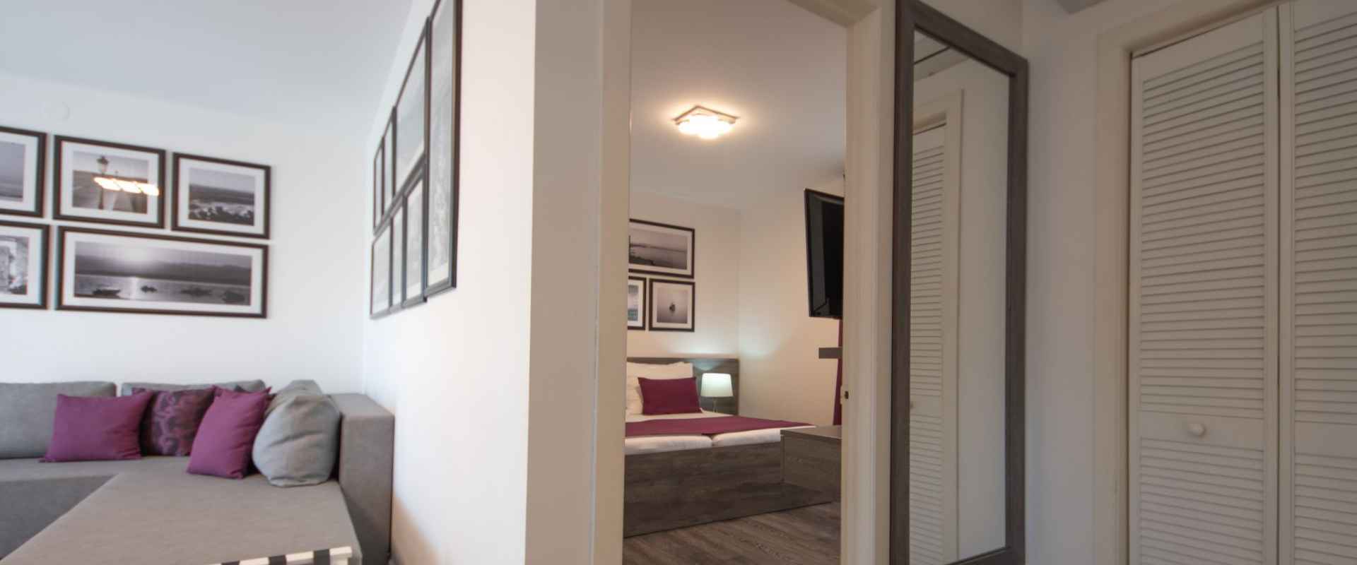 Apt 2 pièces 50 m2 au 1er étage, situation sud. aménagement agréable et moderne: séjour/salle à manger avec 1 divan-lit double (140 cm, longueur 200 cm), tv (satellite) et air-conditionné. sortie sur le balcon. 1 chambre avec 1 lit double (2 x 90 cm, longueur 200 cm), tv. cuisine ouverte (lave-vaisselle, 4 plaques à induction, bouilloire