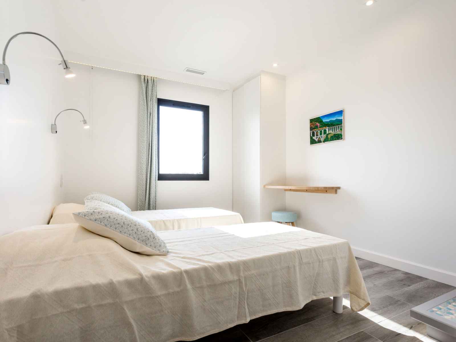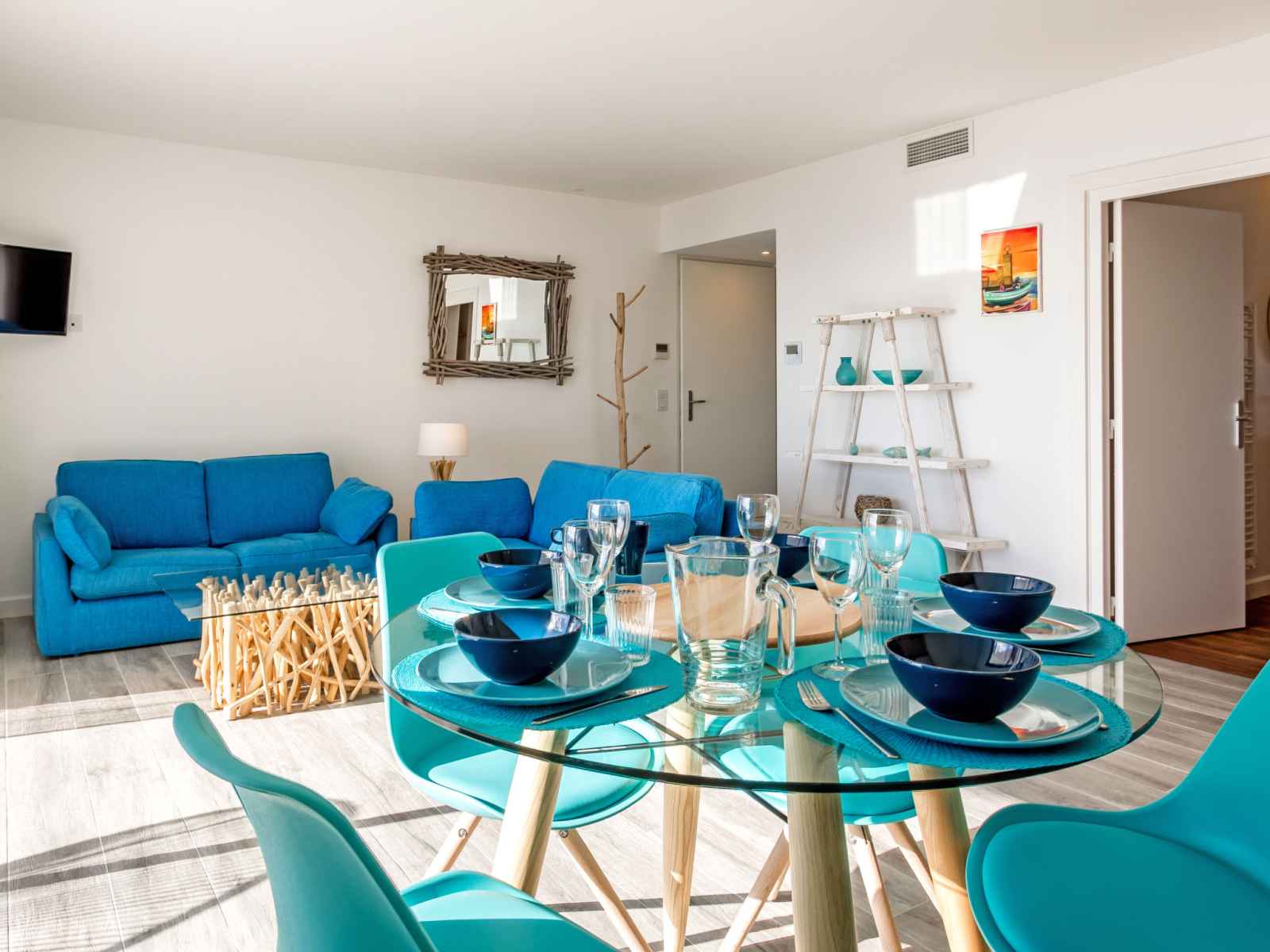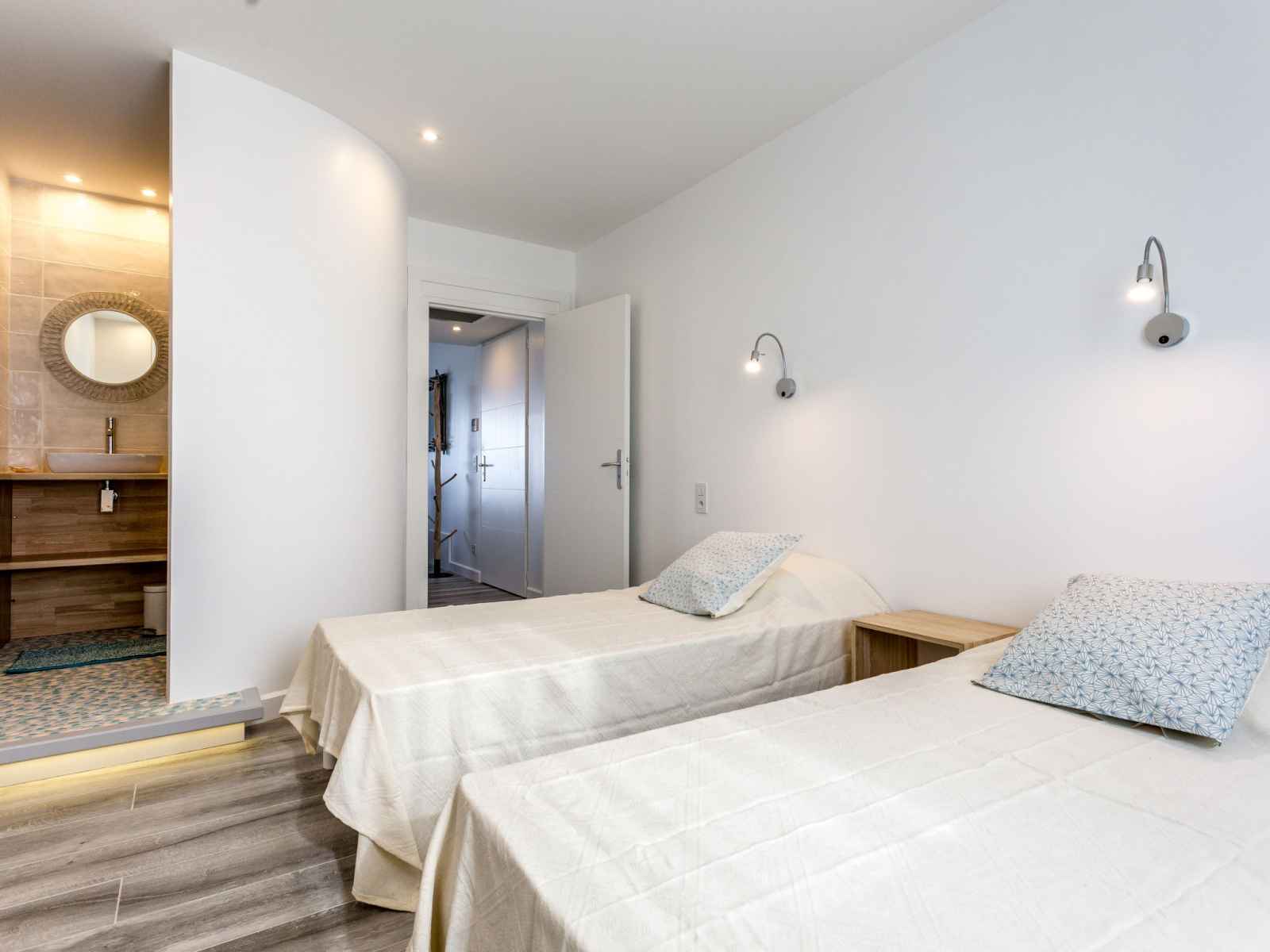 "la palangre", apt 3 pièces 67 m2 au 4ème étage, situation est. aménagement moderne et de style: séjour/salle à manger avec table pour les repas et tv (satellite). sortie sur le balcon. 1 chambre avec 1 grand-lit (160 cm), douche/wc. 1 chambre avec 2 lits et douche. cuisine ouverte (four, lave-vaisselle, 4 plaques vitrocéramiques,