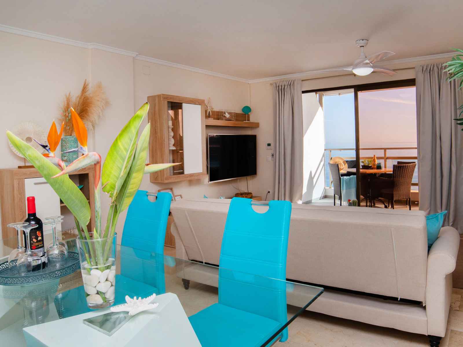 avec: 1 grand-lit (1 x 150 cm, longueur 190 cm), air-conditionné, ventilateur et chauffage à air chaud. Cuisine (four, lave-vaisselle, 3 plaques vitrocéramiques, grille-pain, bouilloire électrique, micro-ondes, congélateur, cafetière électrique). Douche/WC. Petite terrasse. Meubles de terrasse, place pour s'asseoir. Vue panoramique sur la mer. A disposition: lave-linge, fer à repasser, chaise haute pour enfant, lit bébé jusqu'à 2 ans, sèche-cheveux. Internet (Connexion WIFI, gratuit). Adapté(e) aux familles. VT-487184-A // Reg. Nr.: ESFCTU00000302900033576600000000000000000VT-487184-A9