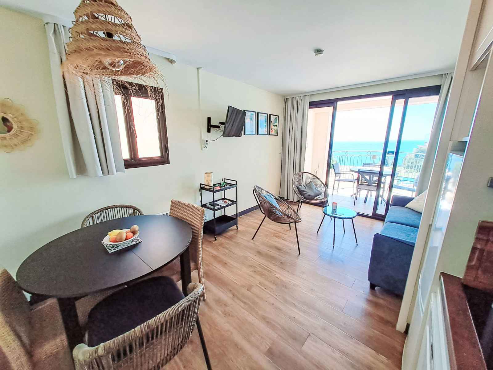 Appartement sur 2 niveaux 3 pièces 40 m2 au 2ème étage. aménagement confortable et agréable: séjour/salle à manger avec baie vitrée avec tv et air-conditionné. sortie sur la terrasse. 1 petite chambre avec 1 x 2 lits superposés (90 cm, longueur 190 cm). cuisine ouverte (lave-vaisselle, 4 plaques à induction, micro-ondes, cafetière