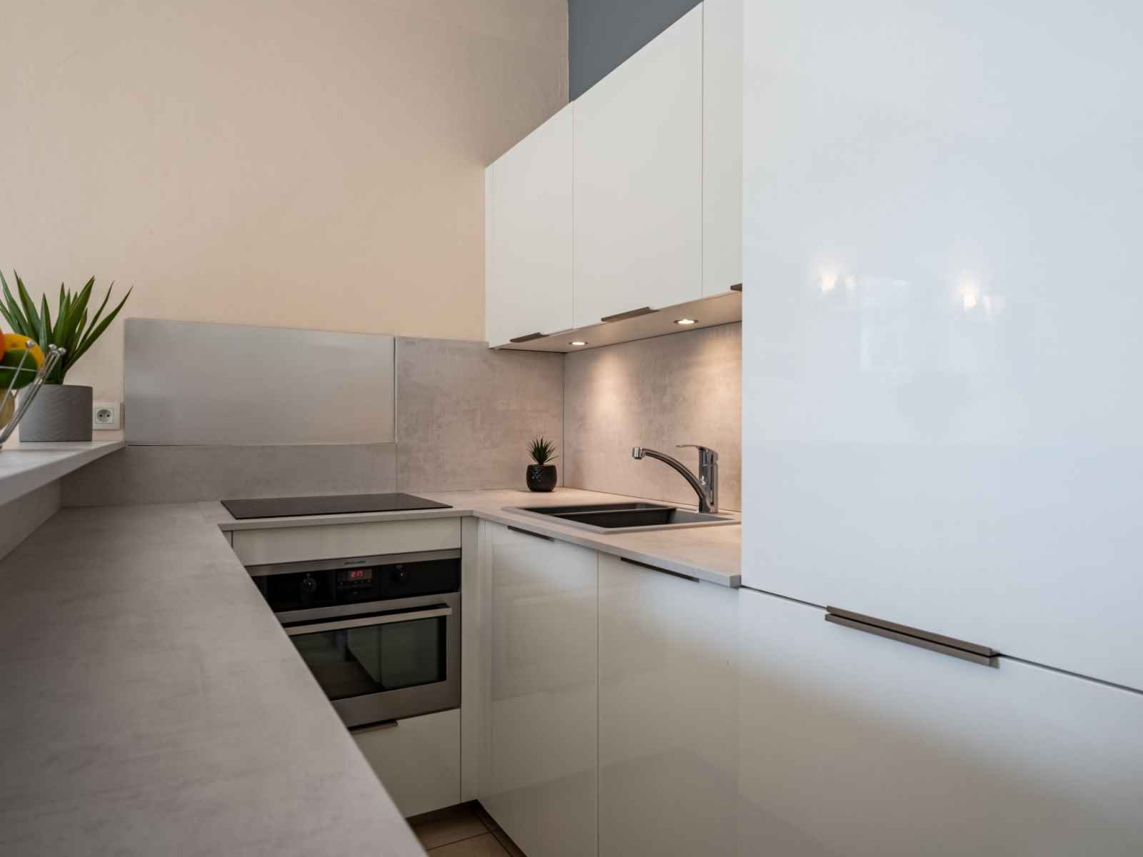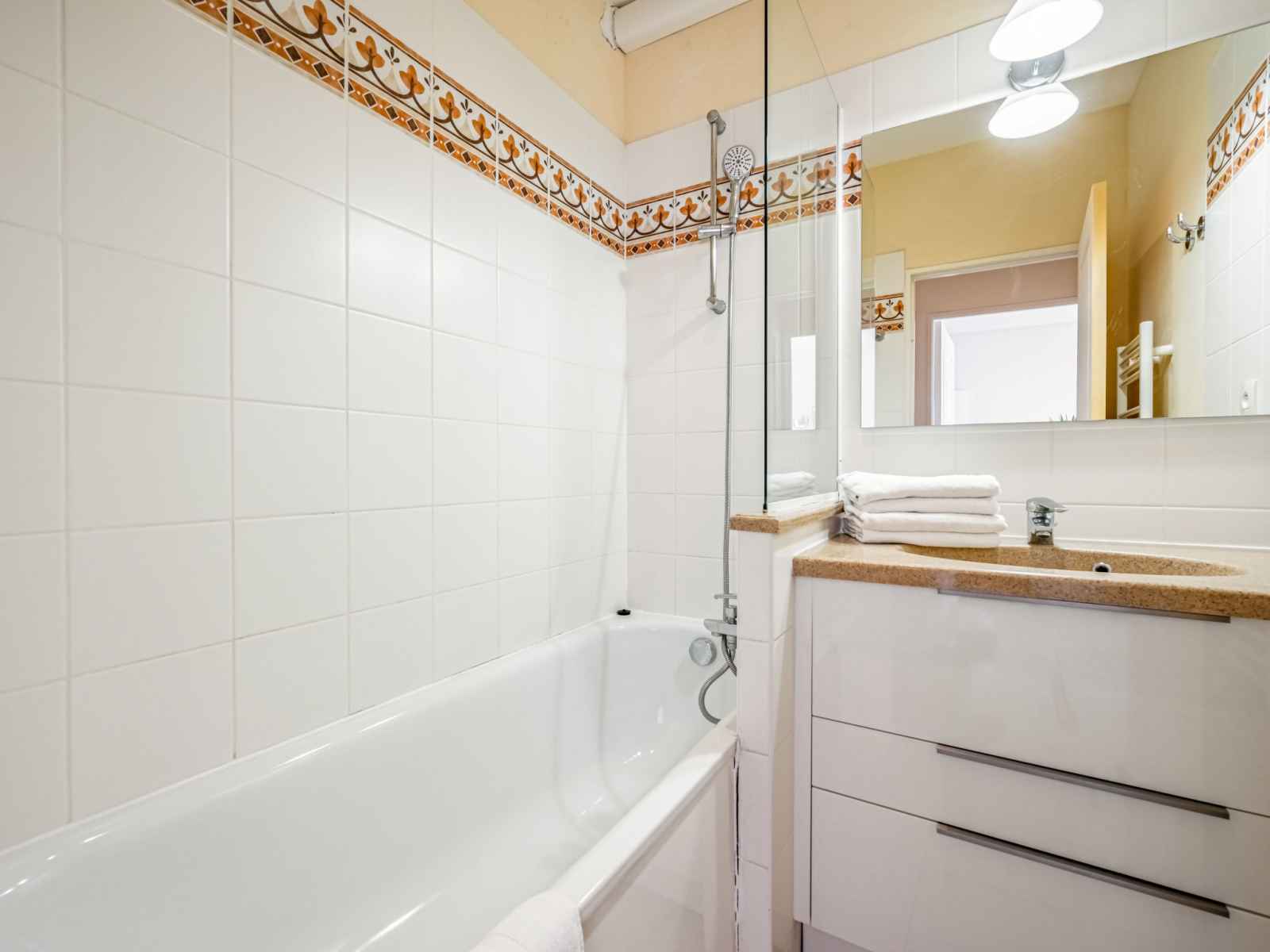 plaques à induction, grille-pain, bouilloire électrique, micro-ondes, congélateur, cafetière électrique, combiné micro-ondes). Salle de bains, douche/WC, WC séparé. Air-conditionné, chauffage à air chaud. Grande terrasse 300 m2, situation sud. Meubles de terrasse. Très belle vue sur la mer. A disposition: Internet (Connexion WIFI, gratuit). Place de parking près de la maison. Veuillez noter: logement non-fumeur. Détecteur de fumée. Veuillez noter : la terrasse de 300 m² est commune aux 4 appartements du rez-de-jardin. 06029023427WF