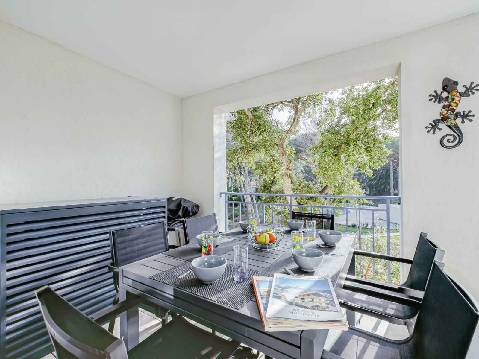 TV (écran plat). 1 chambre avec 1 lits superposés (90 cm, longueur 190 cm), 1 grand-lit (140 cm, longueur 190 cm). Grande cuisine ouverte (four, lave-vaisselle, 4 plaques à induction, grille-pain, bouilloire électrique, micro-ondes, congélateur, cafetière électrique, Capsules pour machine à café (Tassimo) (NON INCLUSES)). Sortie sur la terrasse. Salle de bains, WC séparé. Chauffage électrique, air-conditionné, chauffe eau (300 litres). Terrasse 13 m2, couverte, situation sud et situation ouest. Meubles de terrasse, barbecue électrique. Très belle vue sur la piscine et le jardin. A disposition: lave-linge, fer à repasser, sèche-cheveux. Internet (Connexion WIFI, gratuit). Garage No 347, hauteur 200 cm, largeur 233 cm. Veuillez noter: logement non-fumeur. Détecteur de fumée.
