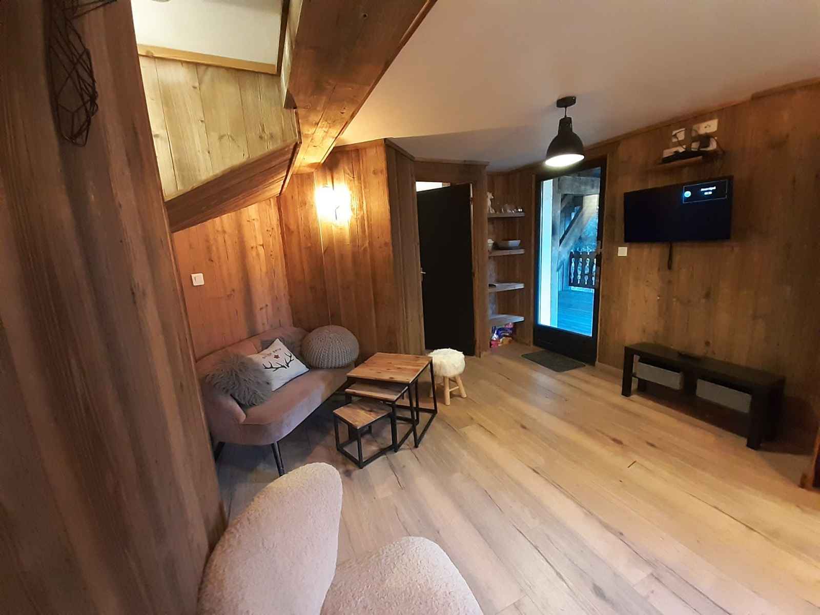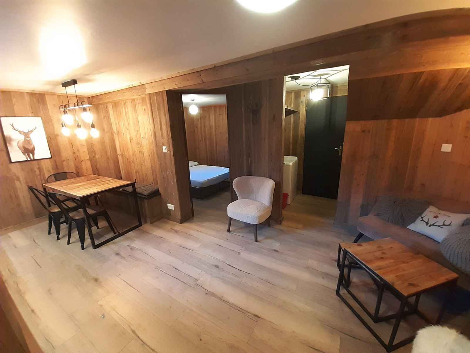 3 pièces de 45m² classé 1* pour 5 personnes maximum au niveau -1 d'un chalet. grande terrasse ombragée exposée ouest avec vue sur la forêt.