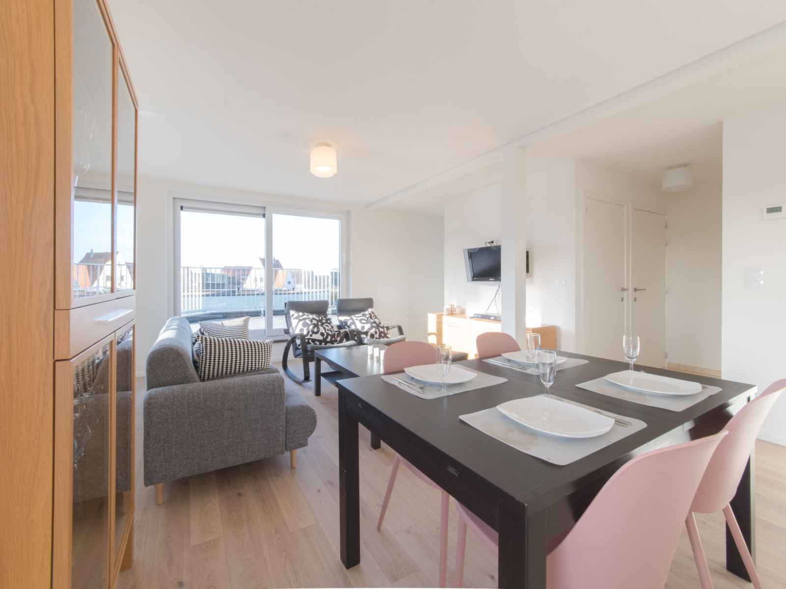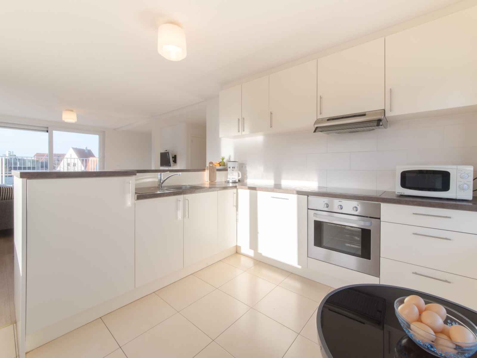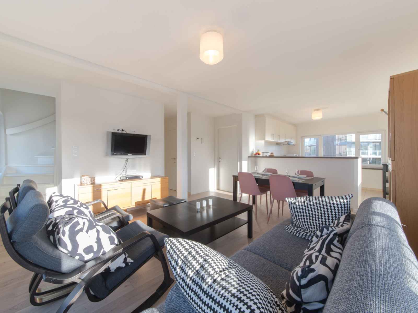 "de zeegloed duplex with parking", apt 3 pièces sur 2 niveaux. logement idéal pour 4 adultes. spacieux et clair, rénové en 2012, aménagement moderne et plaisant: entrée avec wc séparés. séjour/salle à manger avec table pour les repas, télévision numérique, chaînes de tv internationales et écran plat. sortie sur le balcon. 1 chambre