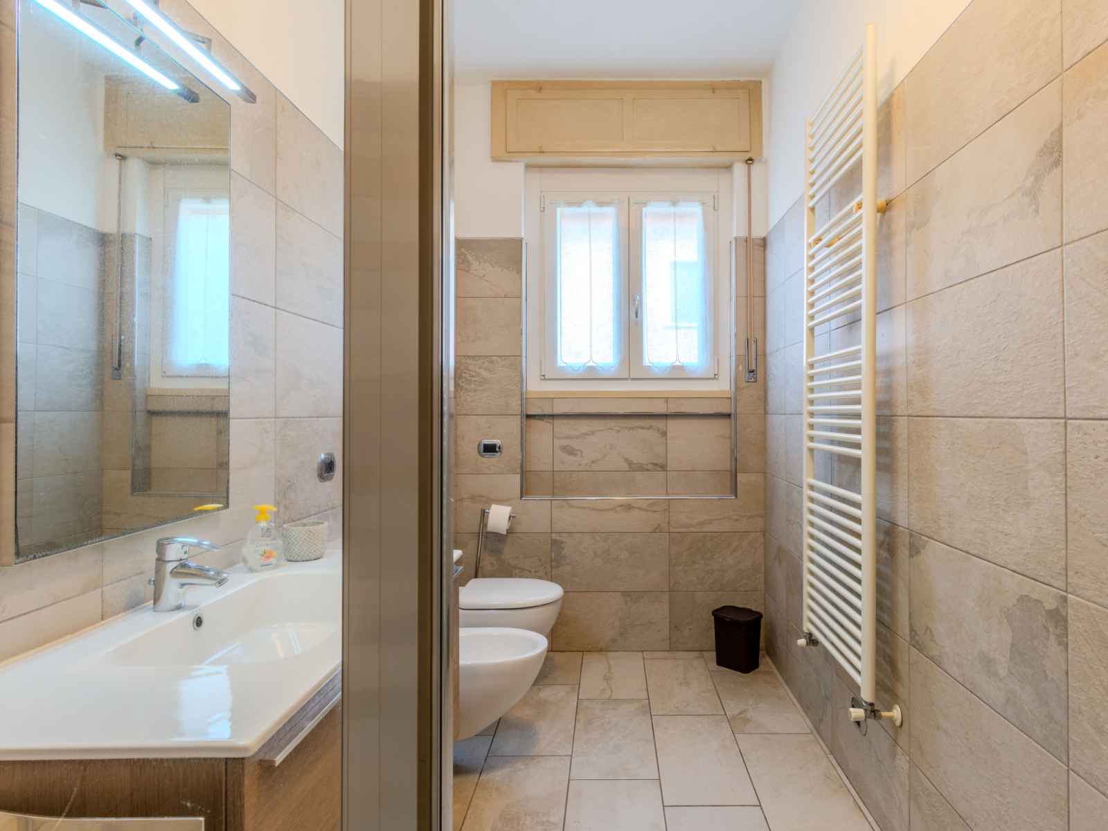 Apt 3 pièces 90 m2, au rez-de-chaussée. partiellement rénové en 2023, aménagement agréable: séjour/chambre à coucher avec 1 divan-lit double (150 cm), coin repas et tv (écran plat). 1 chambre double. 1 chambre avec 2 lits. grande cuisine (four, lave-vaisselle, poêle à gaz, 5 feux, grille-pain, bouilloire électrique, micro-ondes,
