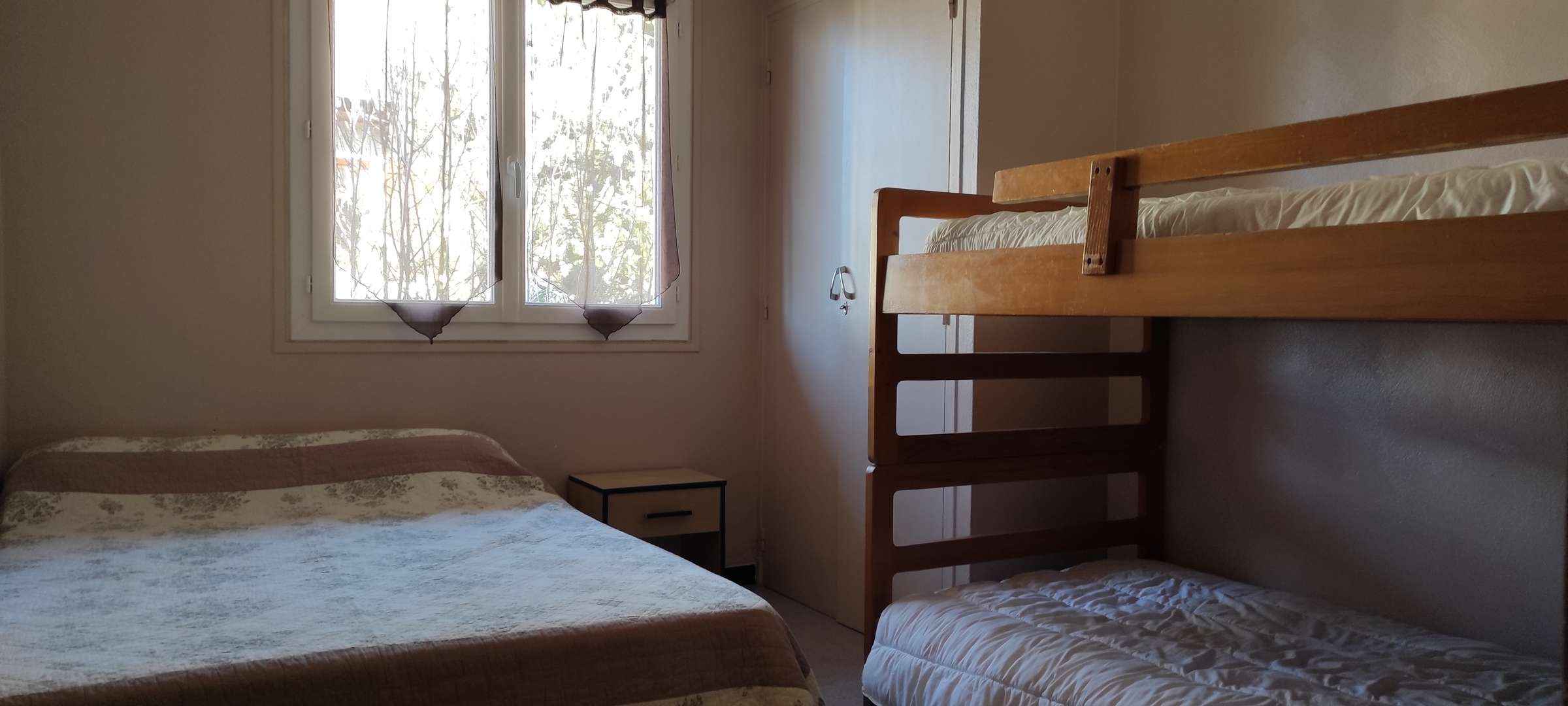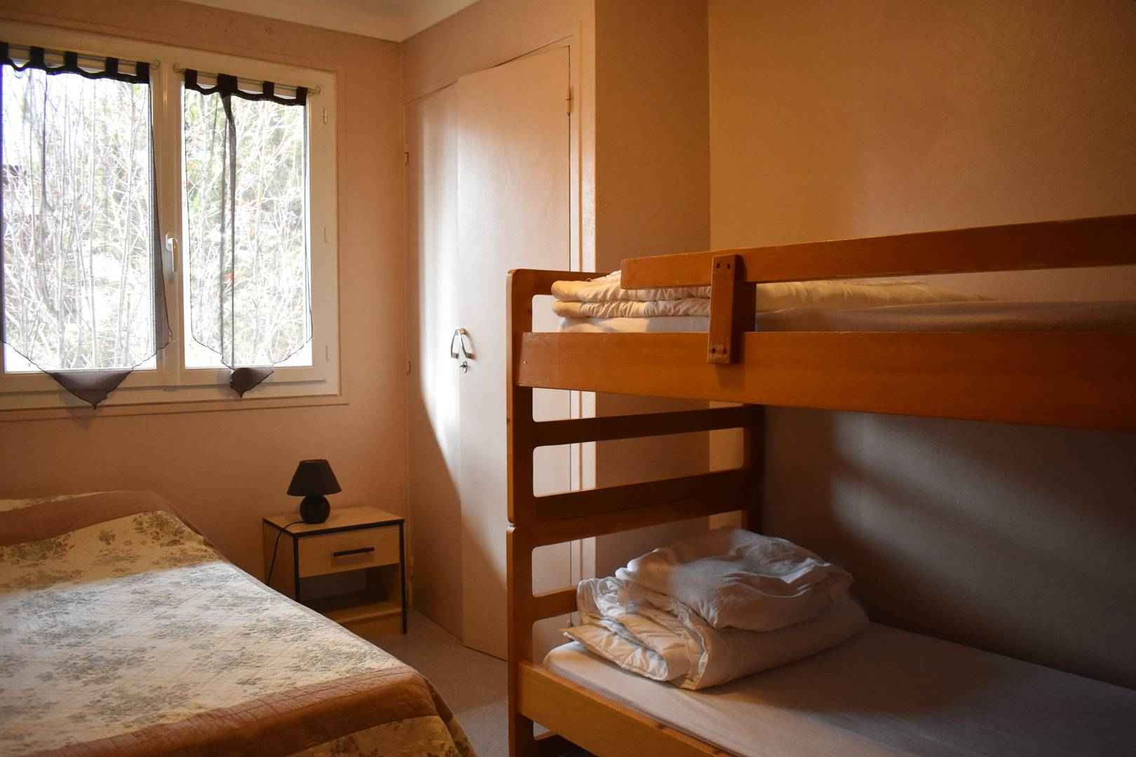 Chambre 2 : Lit double en 140 cm + lits superposés en 90 cm.