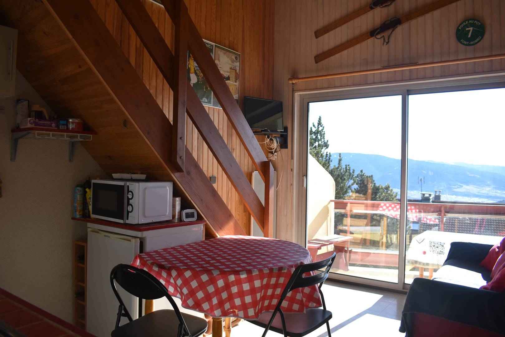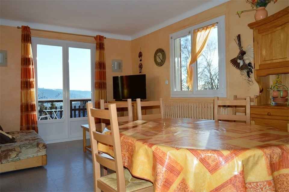 Séjour avec accès au balcon ensoleillé et vue panoramique.