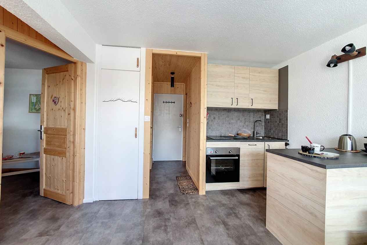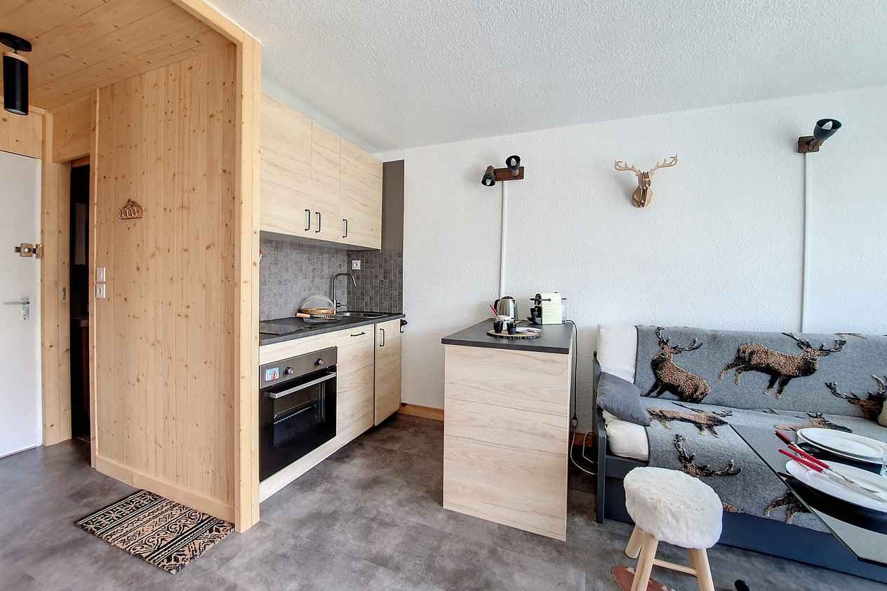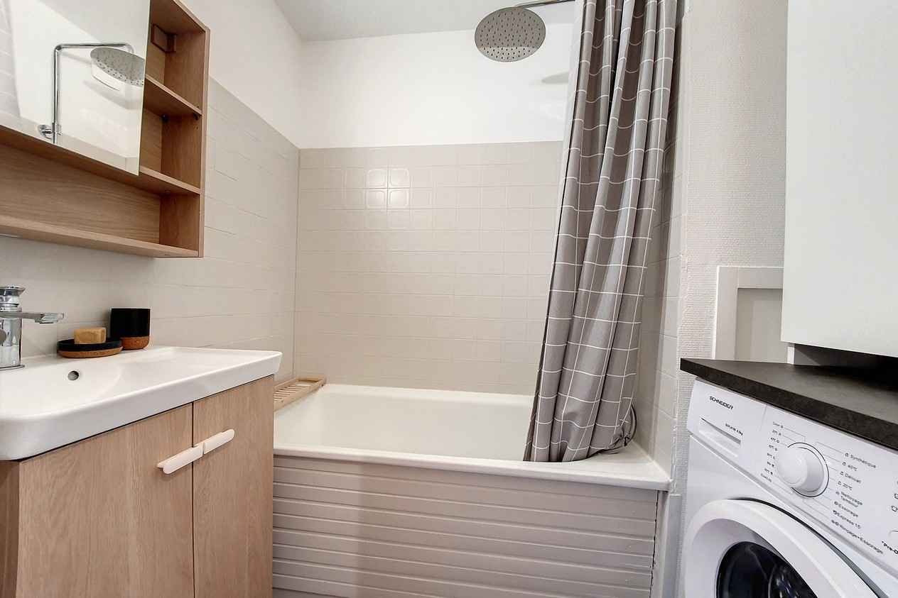 avec baignoire et machine à laver. WC indépendant. Cuisine intégrée avec 2 plaques, four, micro-onde, réfrégirateur, lave vaisselle, grille pain, cafetière, bouilloire, appareil à fondue. Sol : PVC Appartement non-fumeur. Animaux non admis Appartement équipé de couettes WIFI Station payant (sous réserve de couverture de réseau)