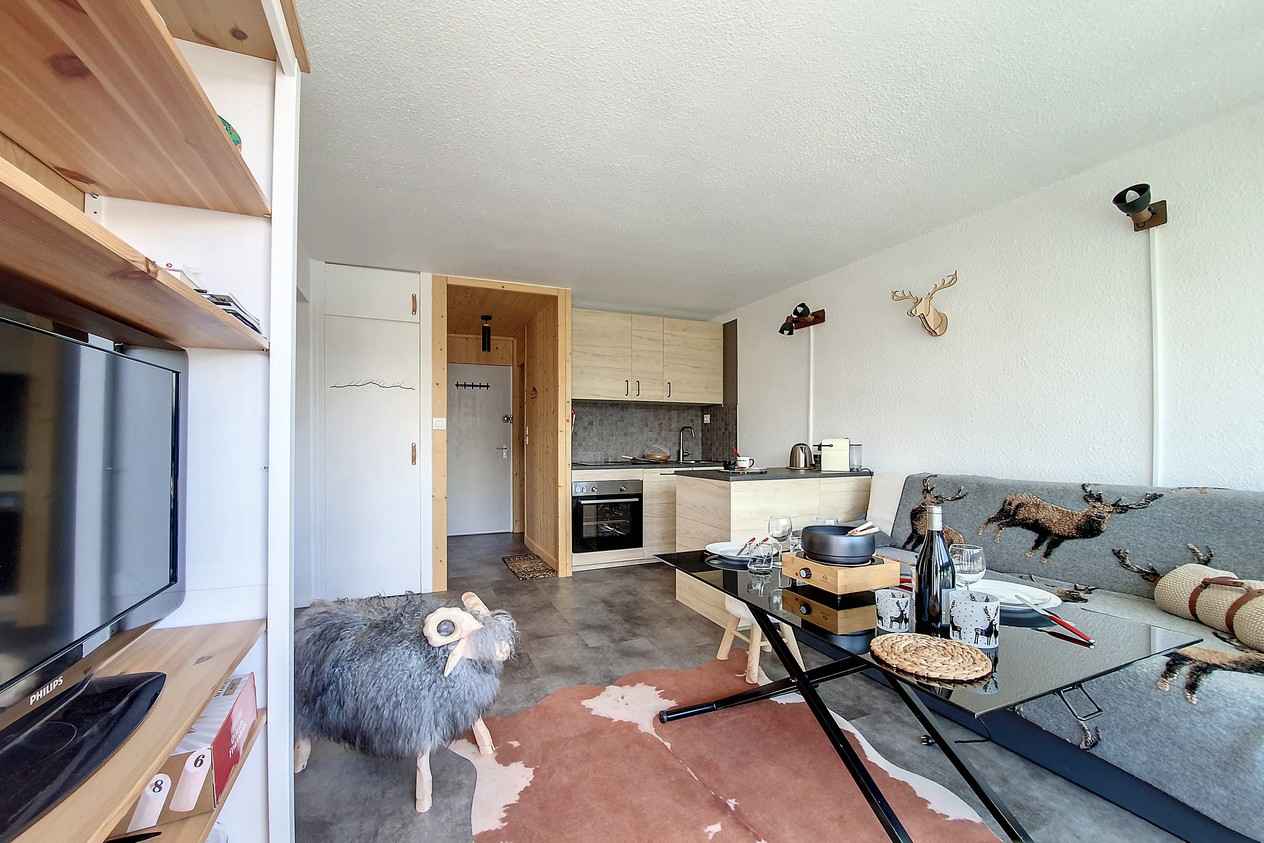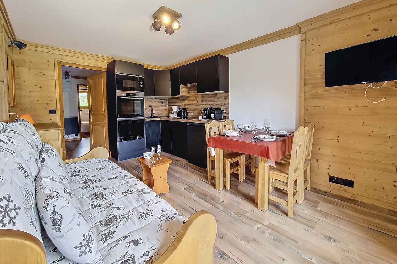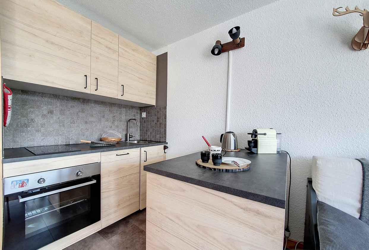 avec baignoire et machine à laver. WC indépendant. Cuisine intégrée avec 2 plaques, four, micro-onde, réfrégirateur, lave vaisselle, grille pain, cafetière, bouilloire, appareil à fondue. Sol : PVC Appartement non-fumeur. Animaux non admis Appartement équipé de couettes WIFI Station payant (sous réserve de couverture de réseau)