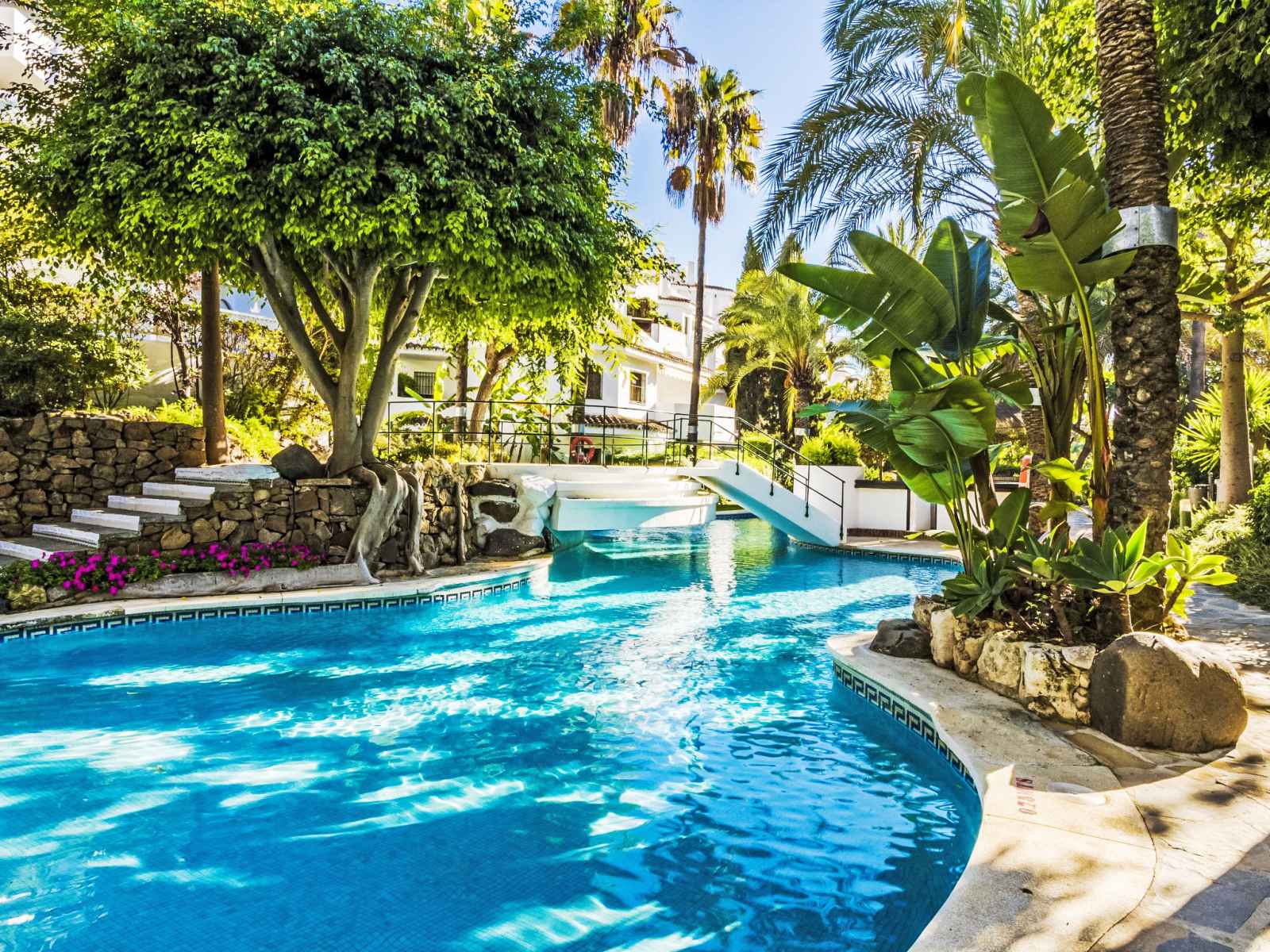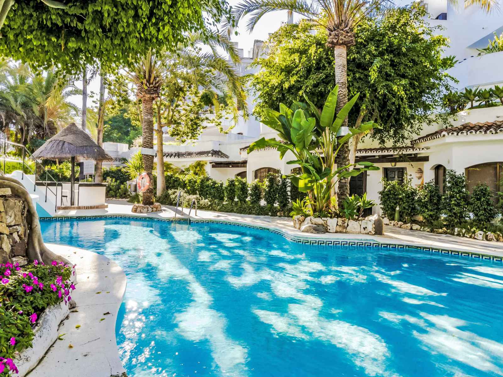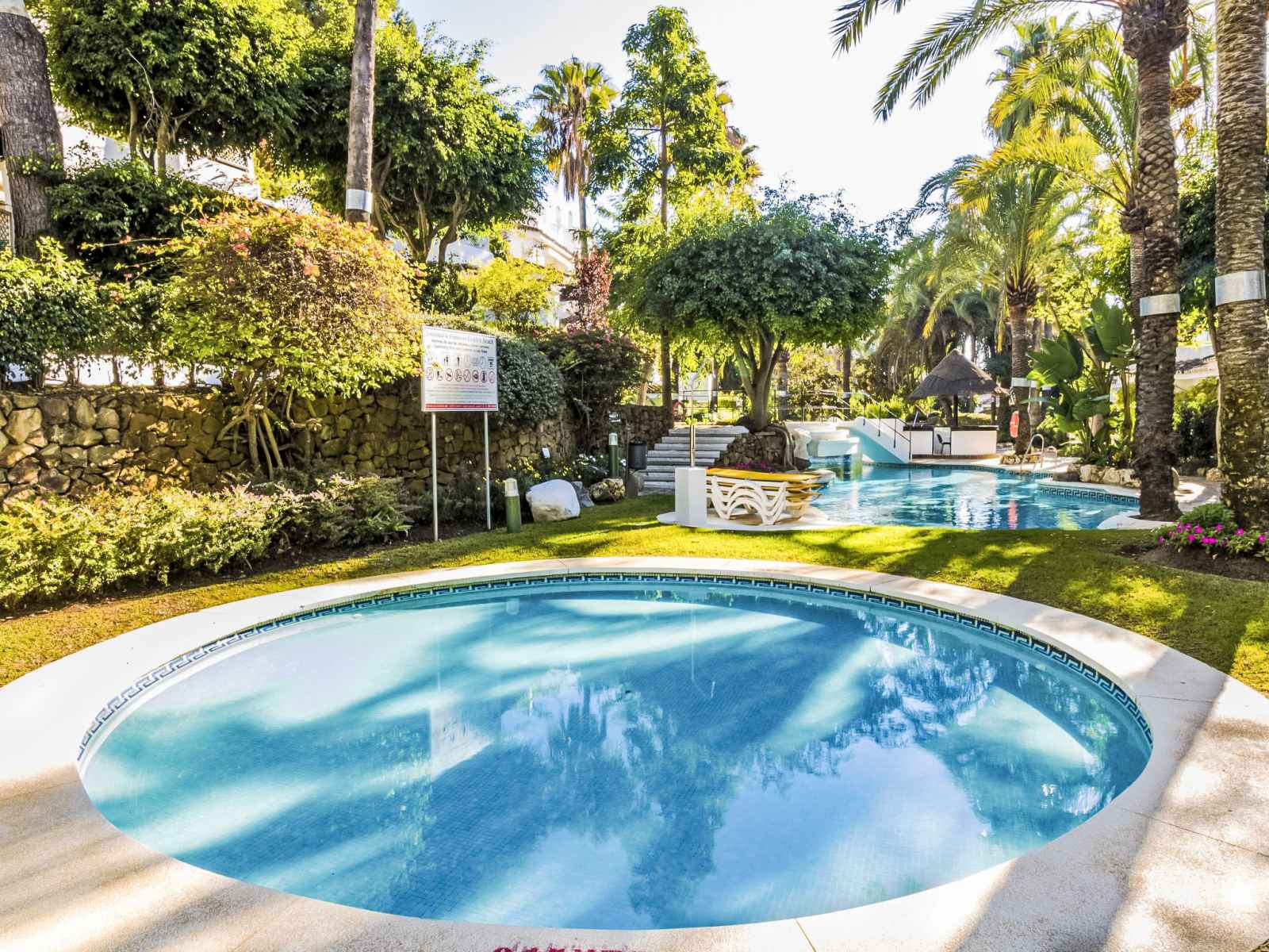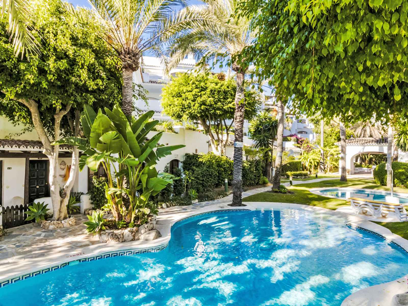 Belle petite résidence accueillante "golden beach". À 13 km du centre de marbella, à 23 km du centre de puerto banus, dans l'arrondissement elviria, à 150 m de la mer, à 150 m de la plage, orientée sud-est. en commun: grand jardin sur plusieurs niveaux avec pelouse, 2 piscines en forme d’haricot (profondeur 90 - 220 cm, disponibilité