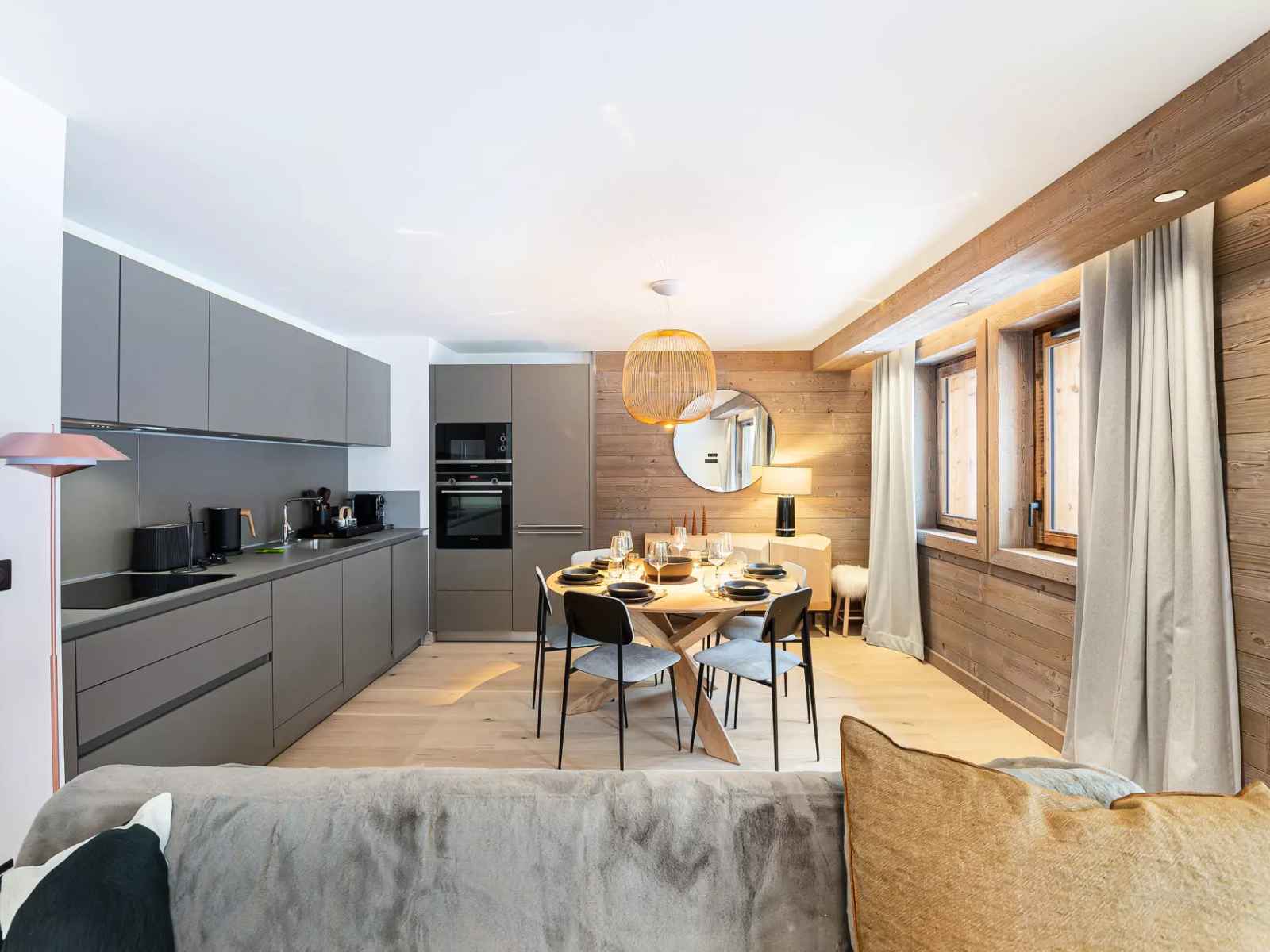 - Pièce de vie avec balcon, salon, cuisine équipée ouverte sur l'espace repas.