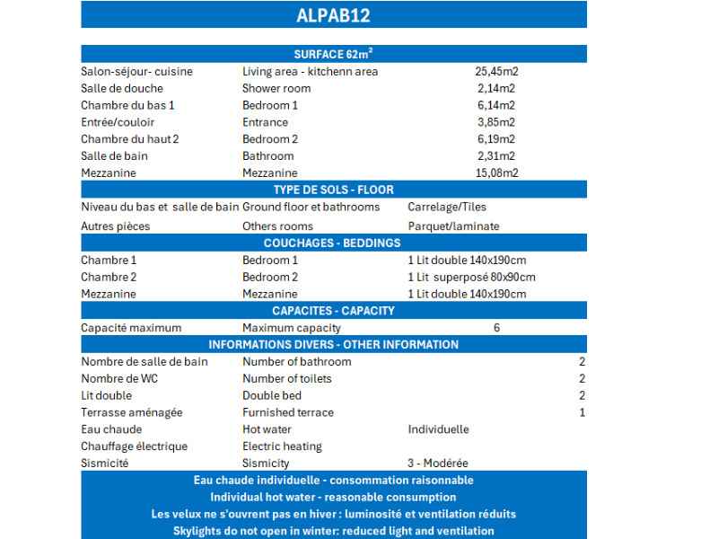 frigidaire, micro-ondes, lave-vaisselle, 4 plaques vitrocéramiques, grille pain, bouilloire Chambre 1 : 1 lit double (140x190cm) Salle de douche avec toilettes Etage : Mezzanine (avec vélux fixe) ouverte sur le séjour avec 1 lit double (140 x 190cm) Chambre 2 (soupentée - avec vélux fixe) : 1ensemble de lits superposés (80 x 190cm) avec une salle de bain et toilettes Accès à la terrasse avec salon de jardin Accès INTERNET GRATUIT - connexion dépendante de l'opérateur, ne peut être garantie NON-FUMEUR - ANIMAUX INTERDITS A NOTER : chauffe-eau individuel (200 litres) offrant un bon confort sous réserve d’une utilisation raisonnable