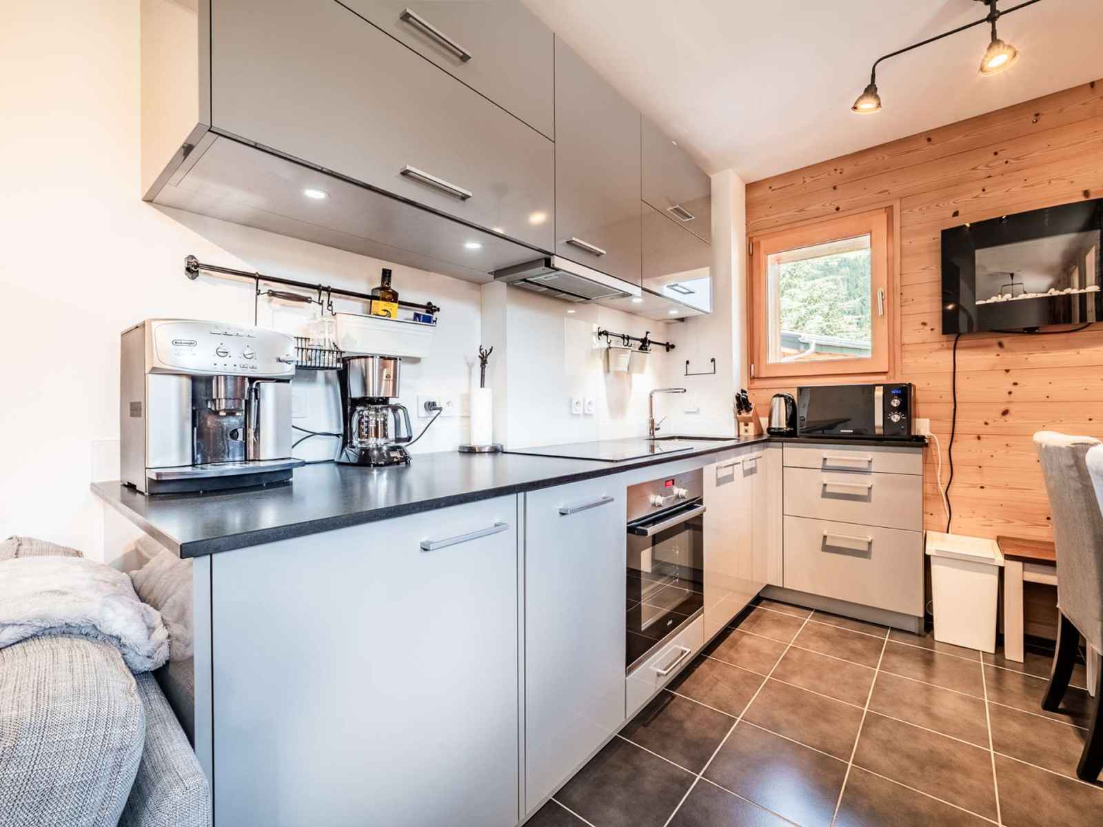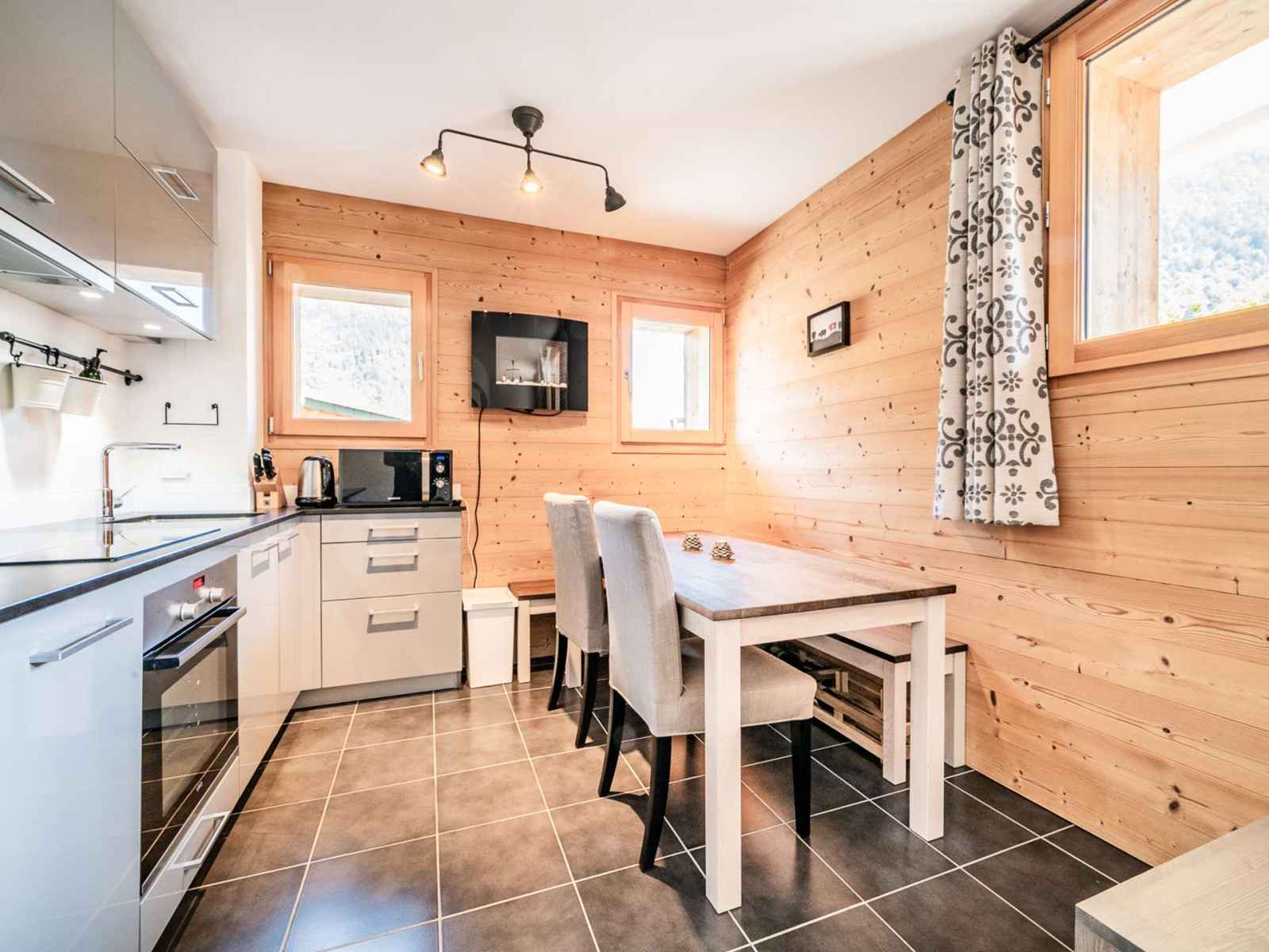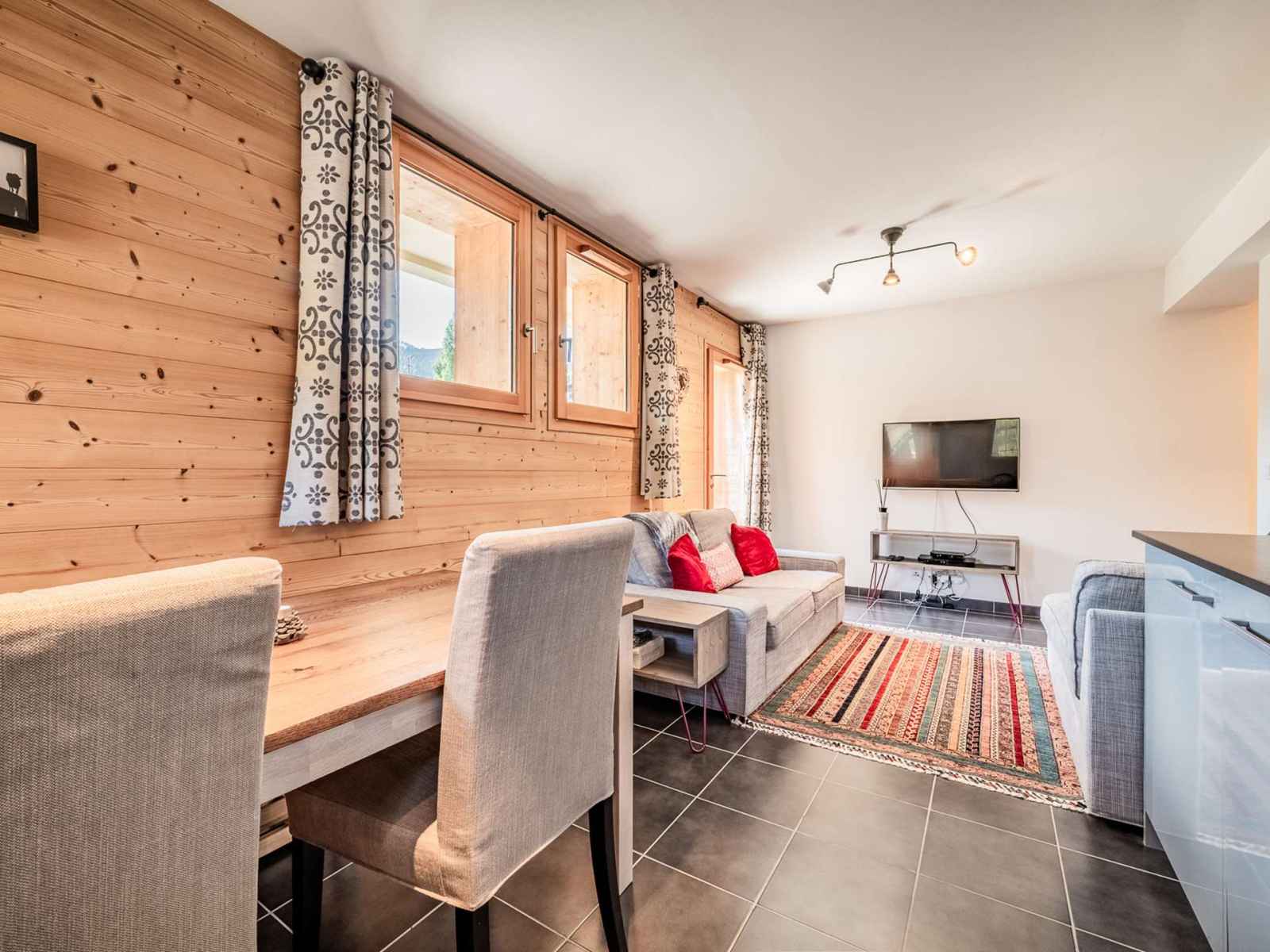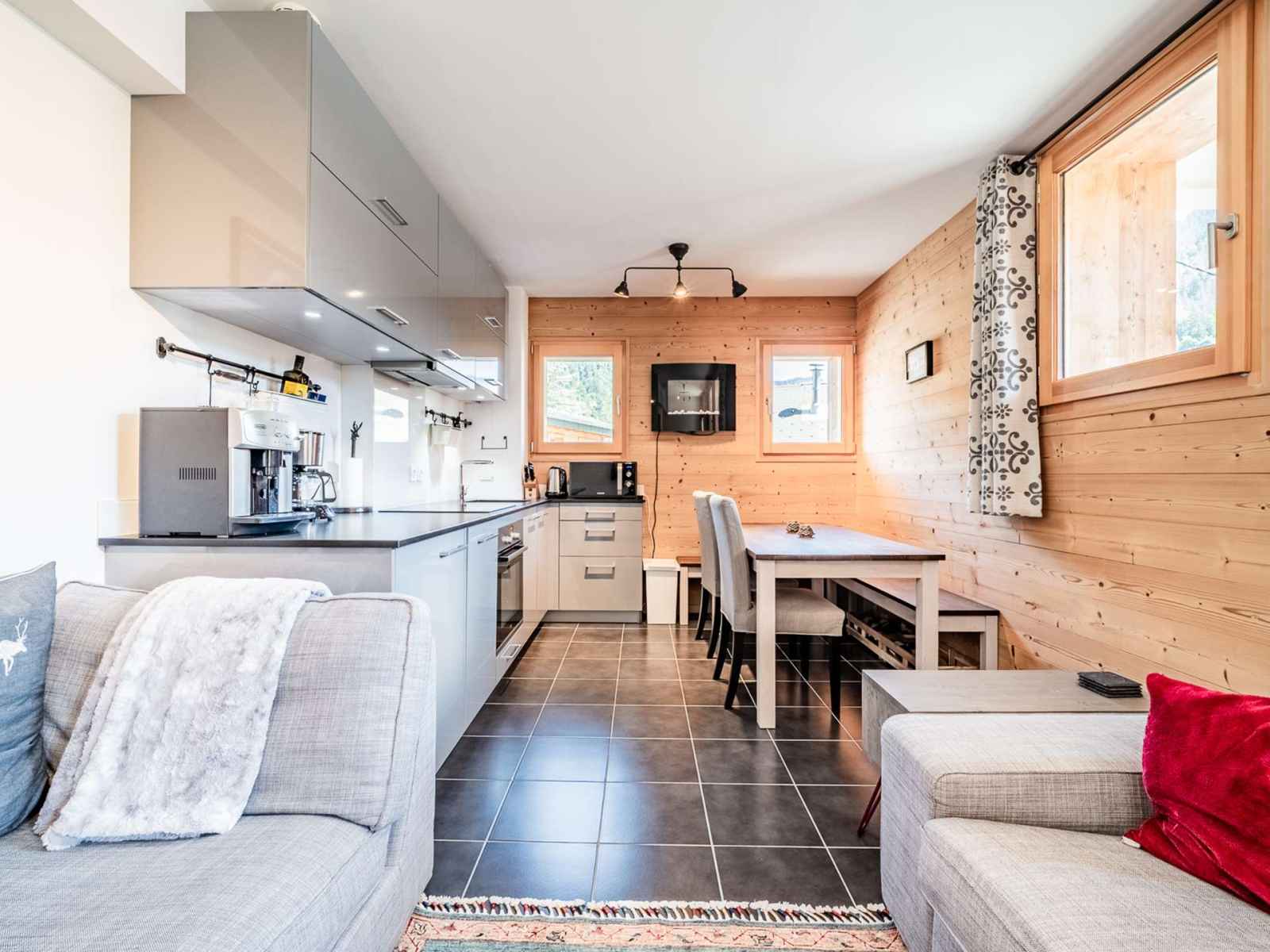 - séjour avec cuisine ouverte, coin salon, canapé, télévision, petit balcon avec vue sur les montagnes