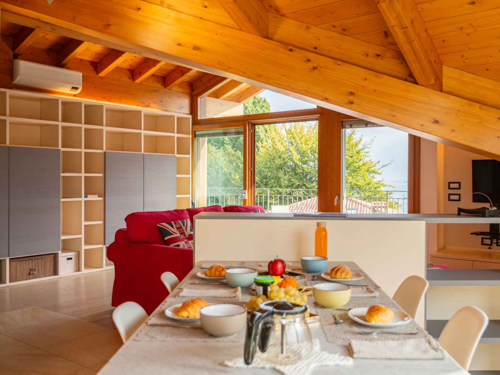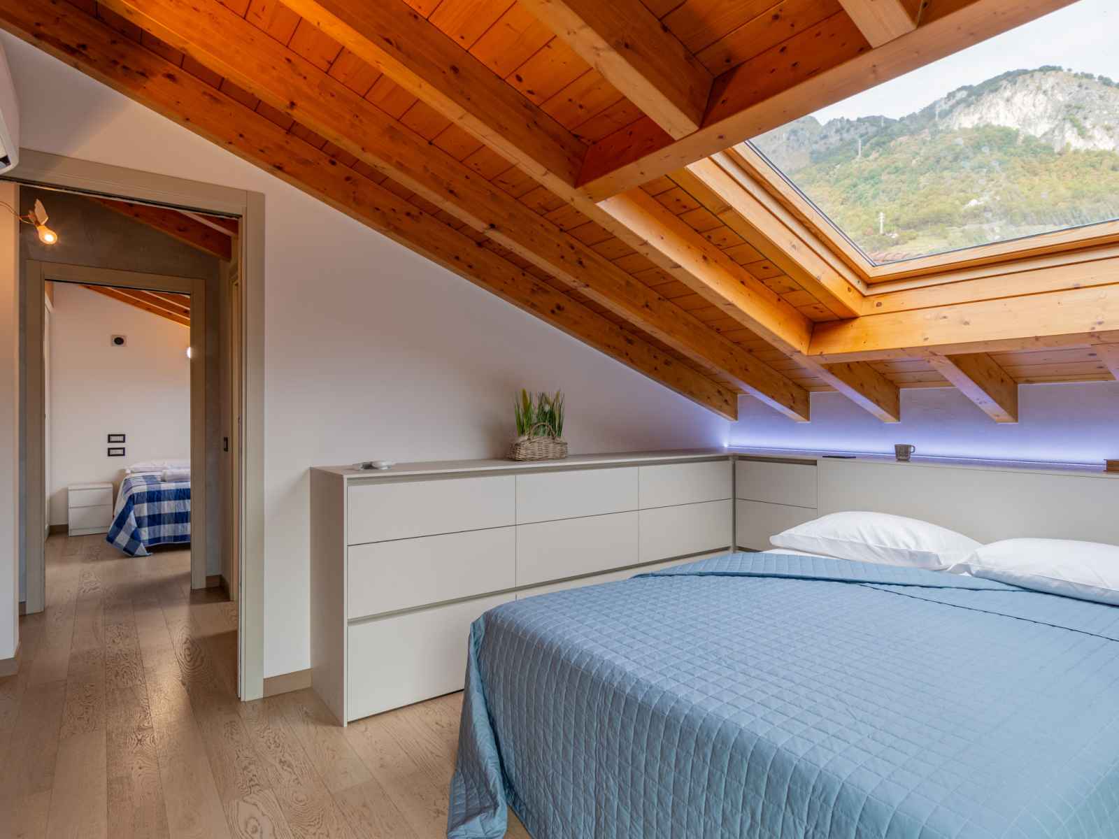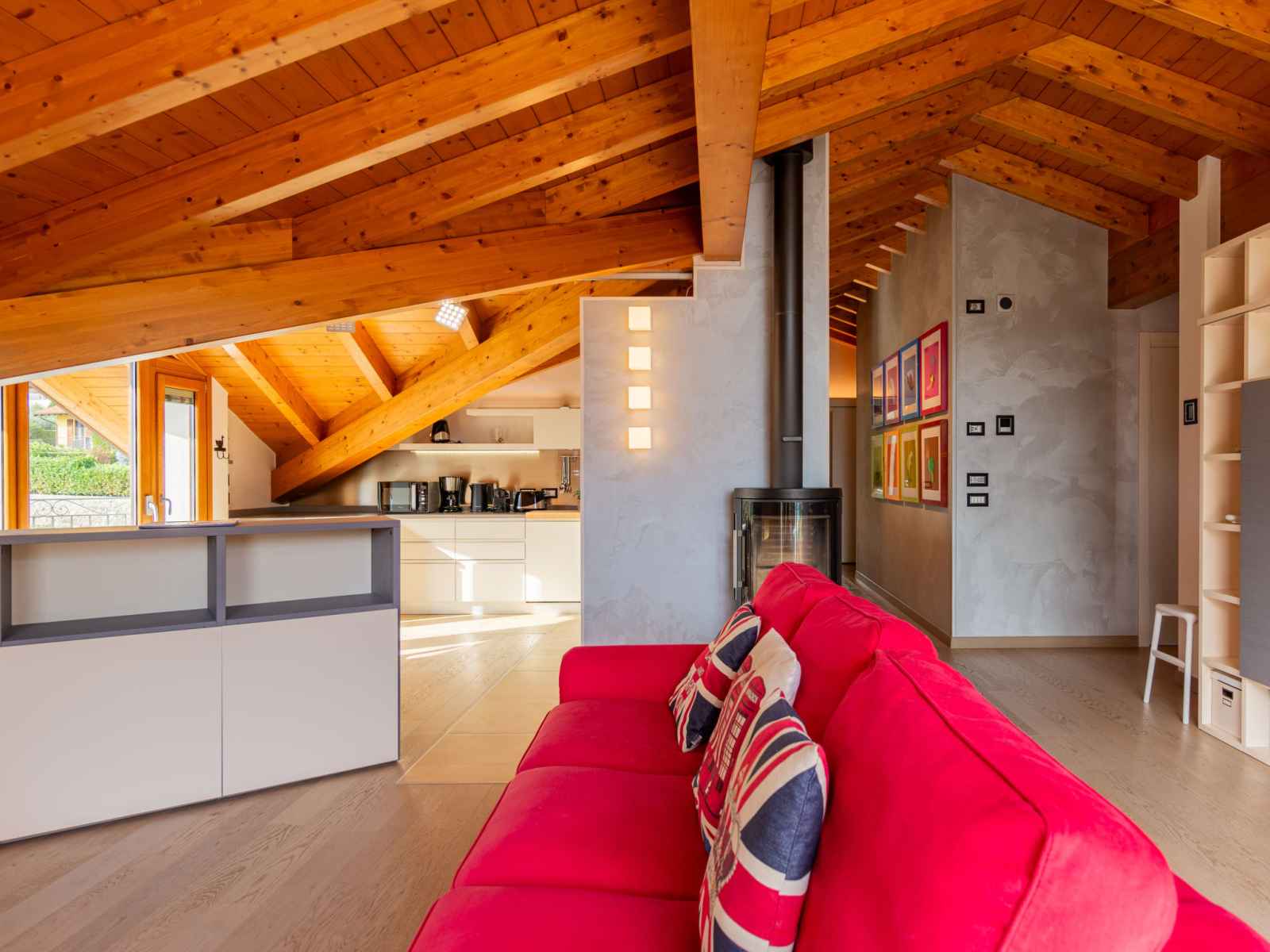 avec fenêtre sous le toit avec air-conditionné. 1 chambre avec fenêtre sous le toit, Dressing avec 2 lits et air-conditionné. Cuisine ouverte (four, lave-vaisselle, 4 plaques à induction, grille-pain, bouilloire électrique, micro-ondes, congélateur, cafetière électrique, Capsules pour machine à café (Nespresso)) avec table pour les repas. Sortie sur le balcon. 2 douches/bidet/WC. Chauffage au gaz, air-conditionné, chauffage par le sol. Possibilité de chauffage uniquement du 15.10. au 15.04. Sol en pierres naturelles. 2 grands balcons, petit balcon, jardin. Meubles de terrasse, mobilier de balcon, chaises longues (2). Très belle vue panoramique sur le lac et les montagnes. A disposition: lave-linge, fer à repasser, sèche-cheveux. Internet (Connexion WIFI, gratuit). Veuillez noter: logement non-fumeur. IT013160C28UUHA8PU