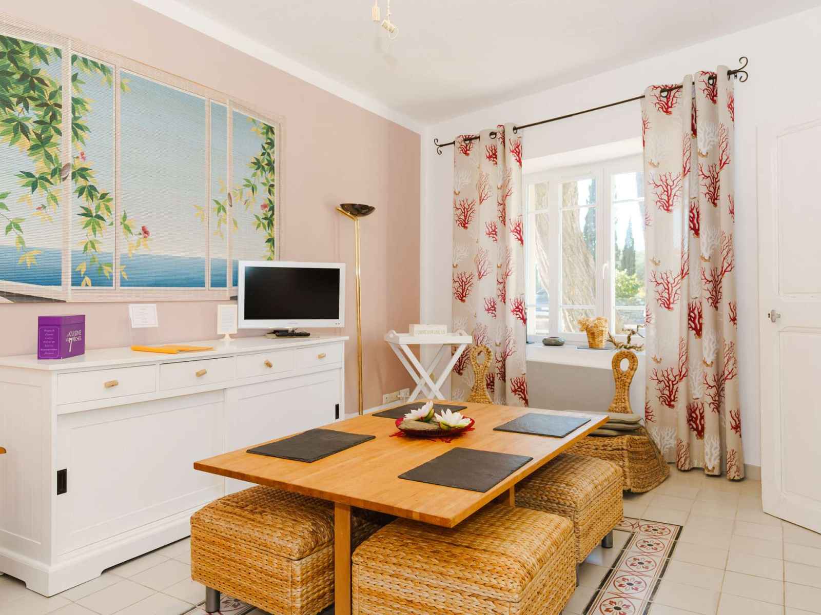 La partie salon est équipée d'une TV avec chaînes françaises, d'une table basse où l'on peut aussi prendre les repas, et d'un canapé-lit convenant pour une personne.