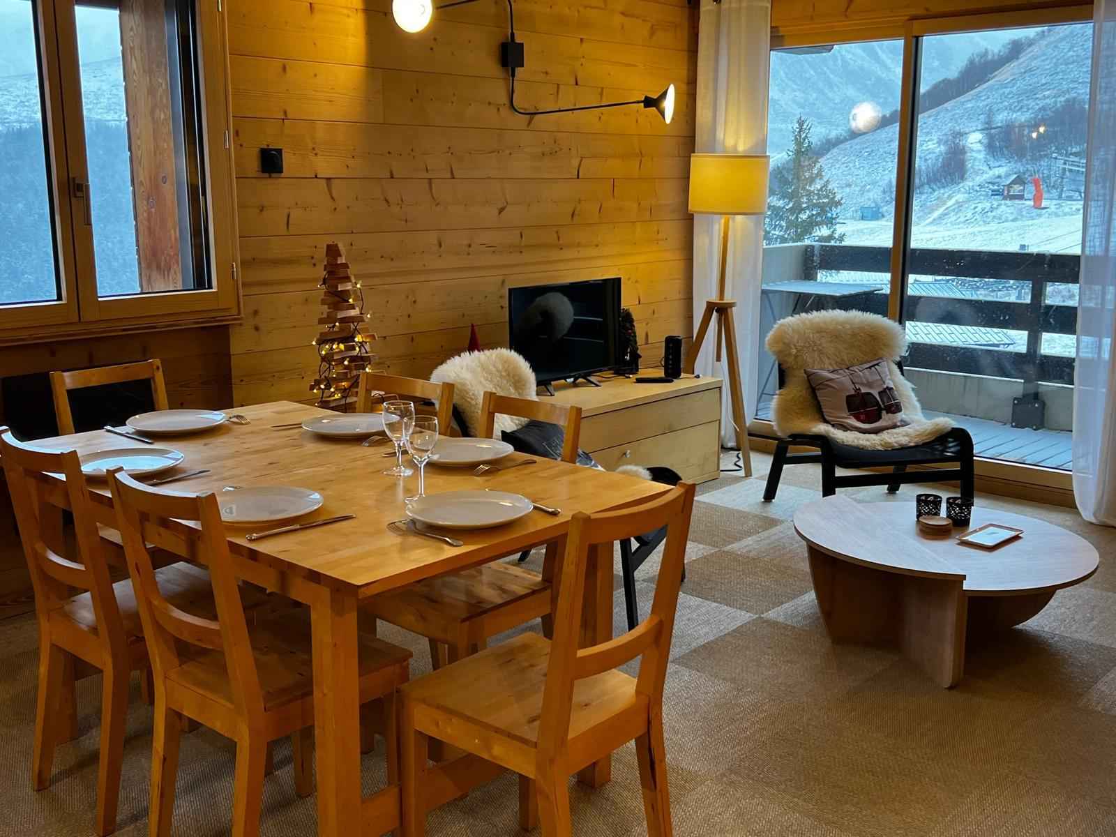 Appartement non fumeur entièrement rénové (env.70m2) pour 8 personnes avec balcon plein sud au pied des pistes, dans résidence avec ascenseur.