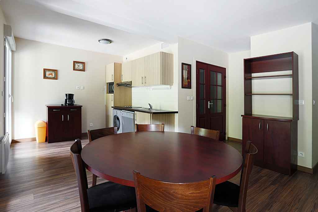 kitchenette équipée de 4 plaques vitrocéramiques, d'un micro ondes, d'un réfrigérateur, d'un lave vaisselle et d'un lave linge.