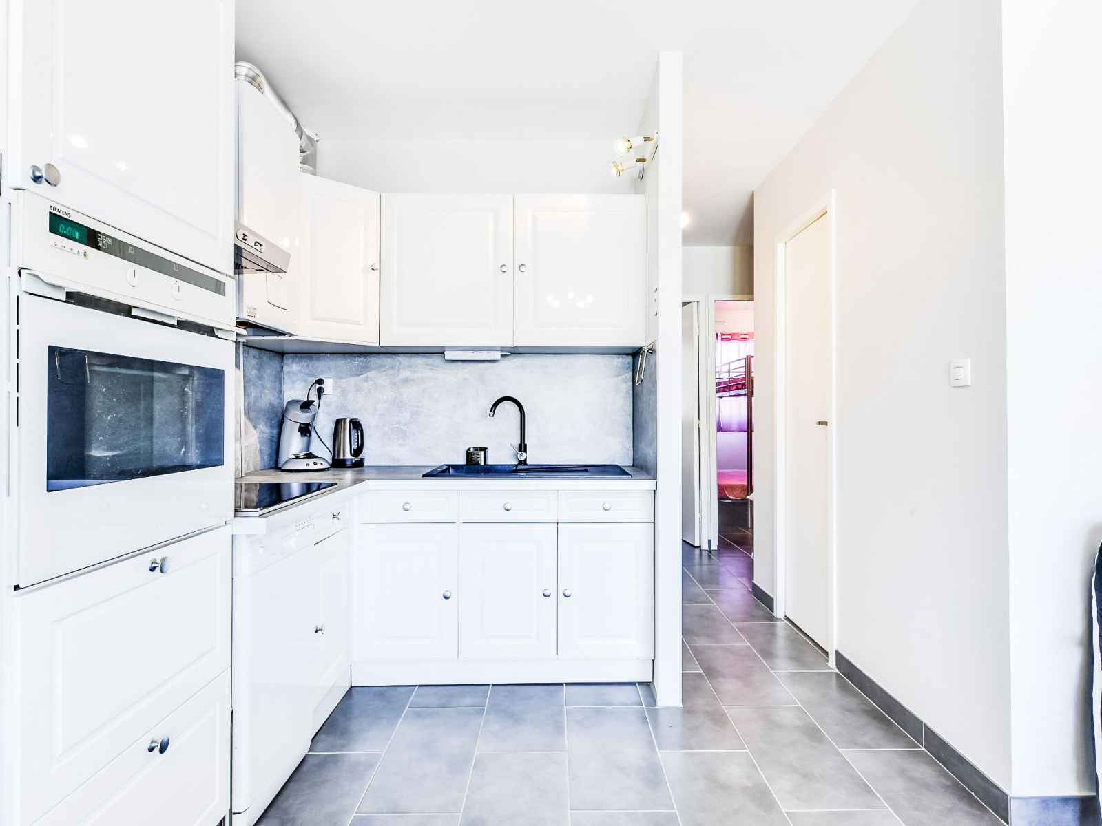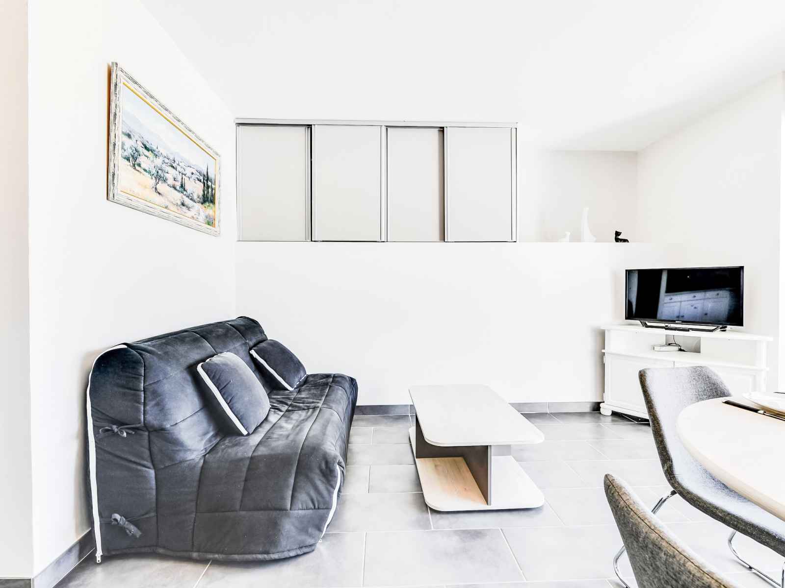 Apt 3 pièces 46 m2, au rez-de-chaussée. aménagement agréable: séjour/salle à manger avec tv et air-conditionné. 1 chambre avec 1 grand-lit (140 cm, longueur 200 cm), ventilateur. 1 chambre avec 1 x 2 lits superposés (90 cm, longueur 180 cm). coin cuisine (four, lave-vaisselle, 3 plaques à induction, micro-ondes, congélateur). douche, wc