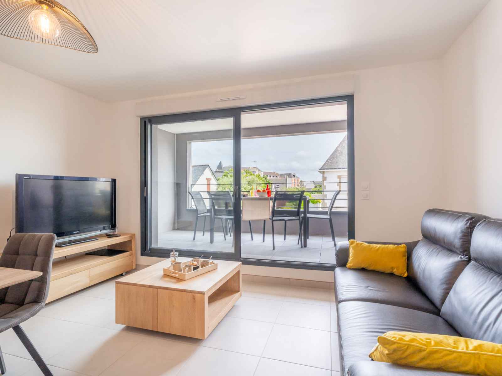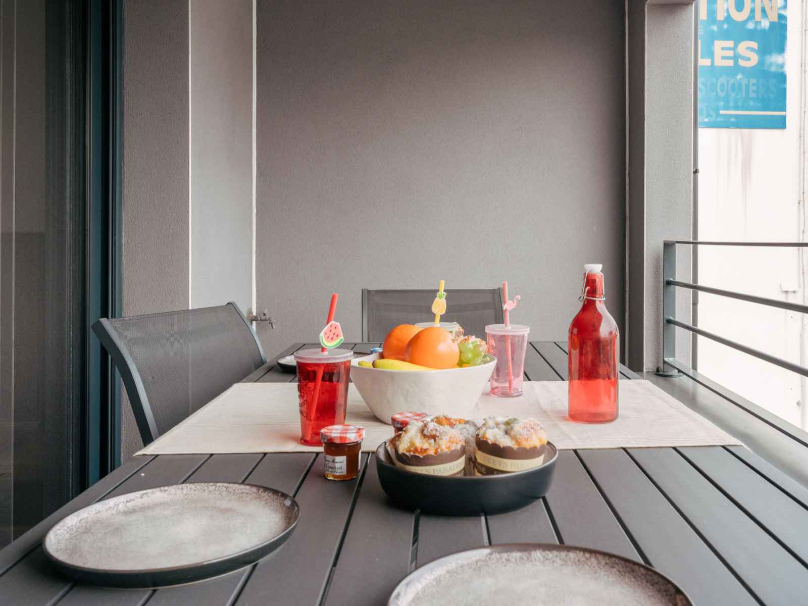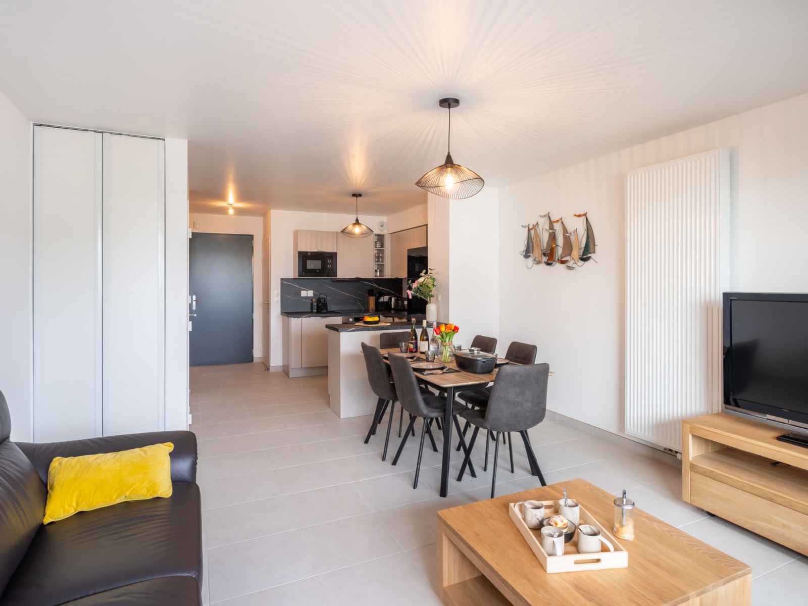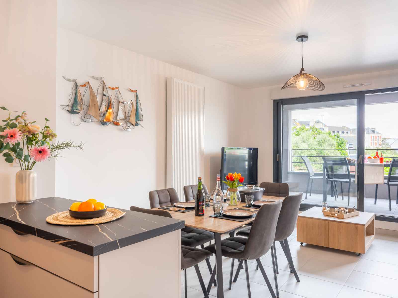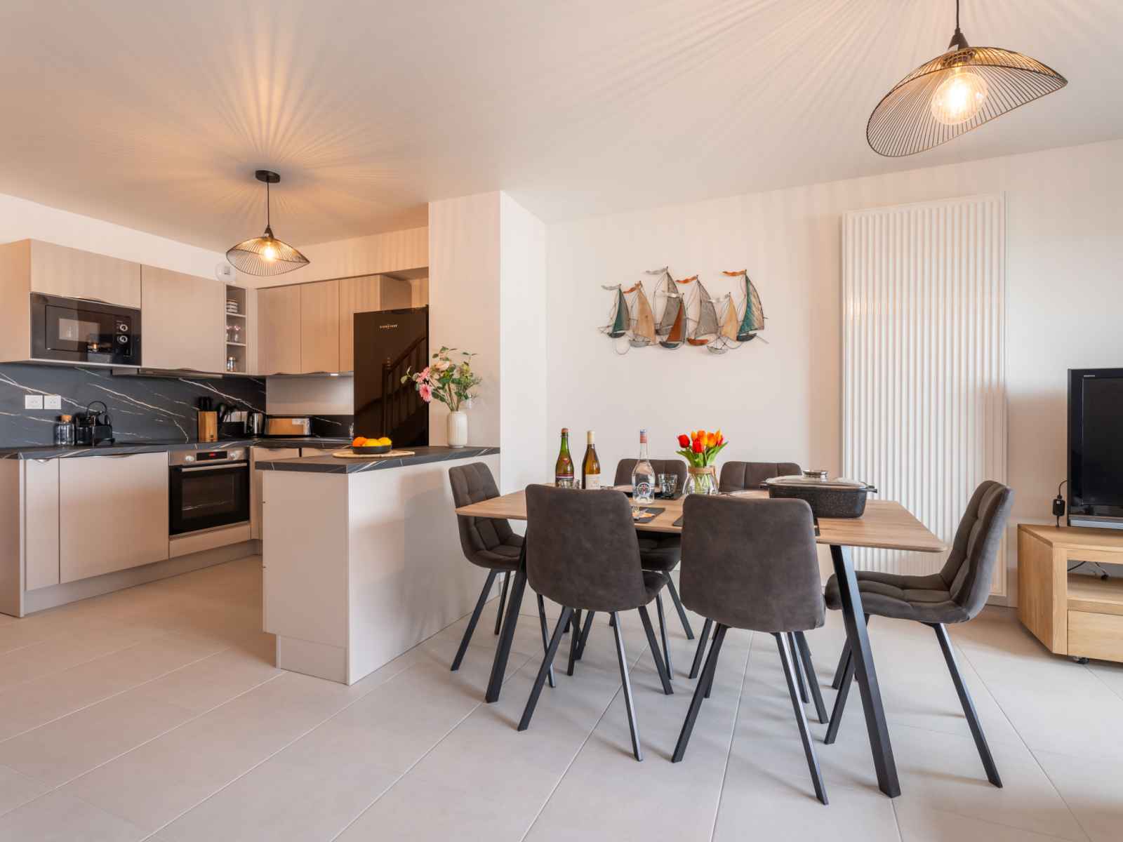 Apt 3 pièces 60 m2 sur 2 niveaux au 1er étage. aménagement agréable et moderne: séjour/salle à manger avec tv (écran plat). sortie sur la terrasse. cuisine ouverte (four, lave-vaisselle, 3 plaques à induction, micro-ondes, congélateur, cafetière électrique). wc séparé. chauffage électrique. À l'étage supérieur: 1 chambre avec 1