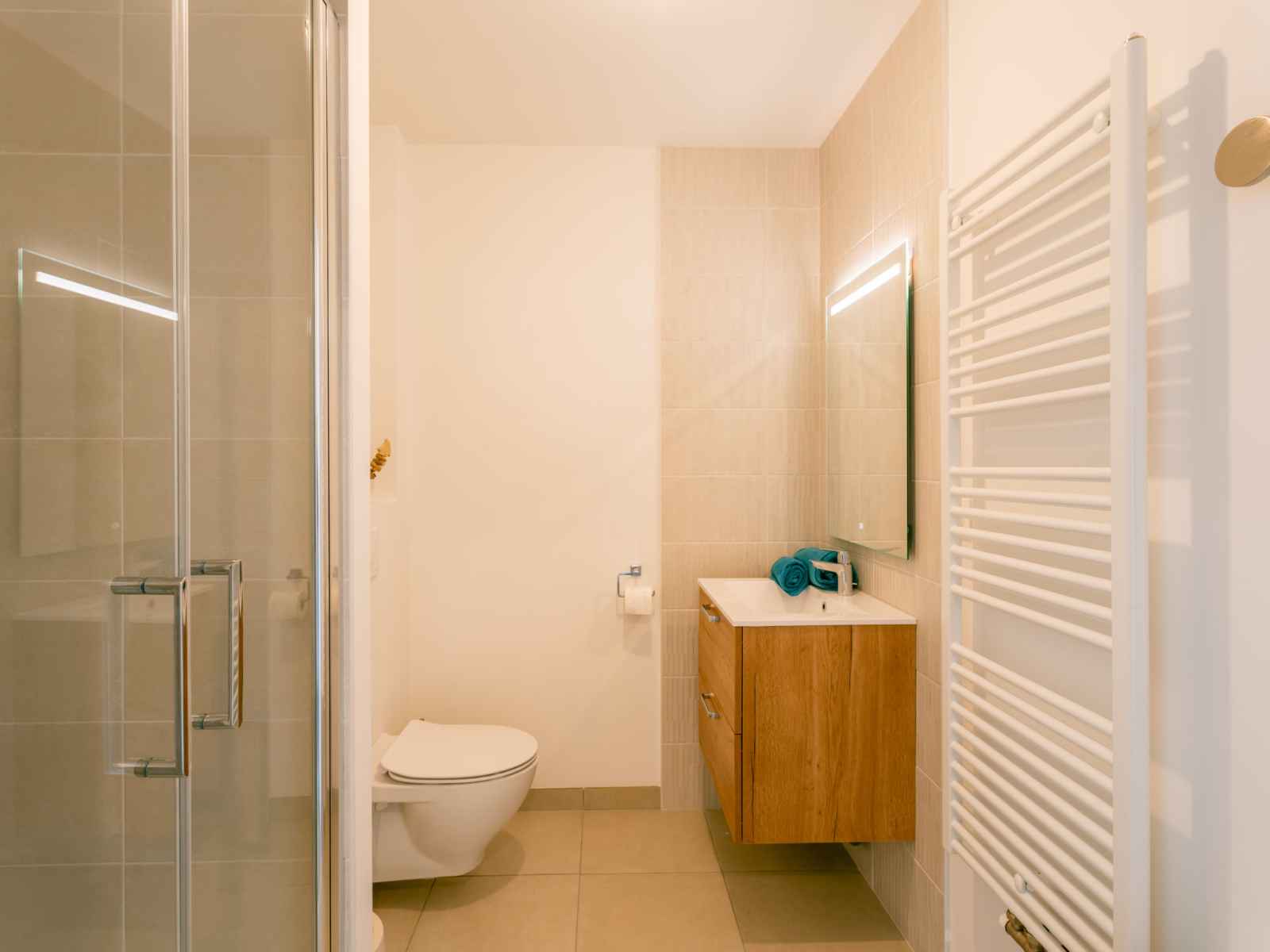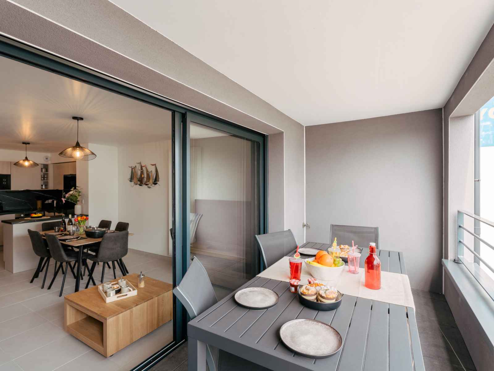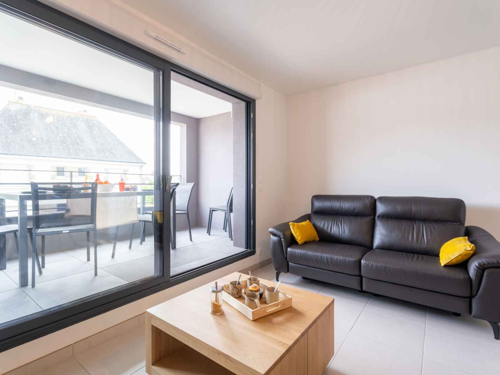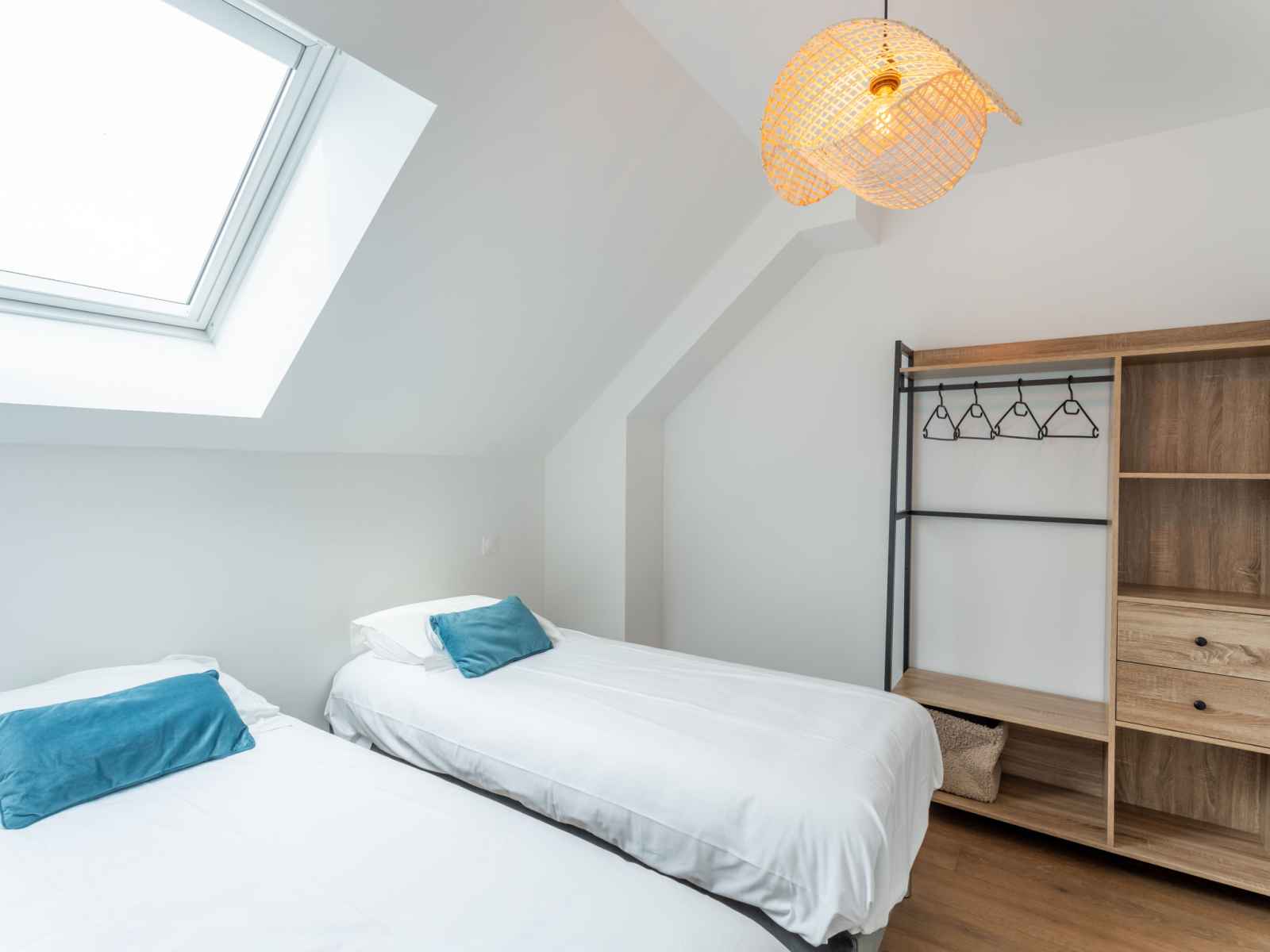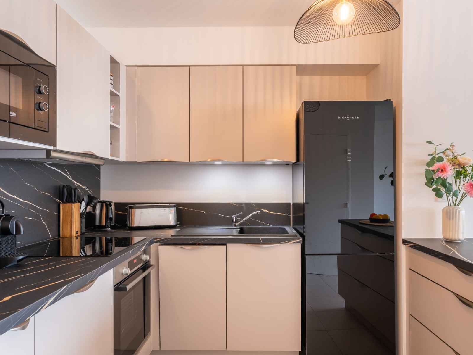 Apt 3 pièces 60 m2 sur 2 niveaux au 1er étage. aménagement agréable et moderne: séjour/salle à manger avec tv (écran plat). sortie sur la terrasse. cuisine ouverte (four, lave-vaisselle, 3 plaques à induction, micro-ondes, congélateur, cafetière électrique). wc séparé. chauffage électrique. À l'étage supérieur: 1 chambre avec 1