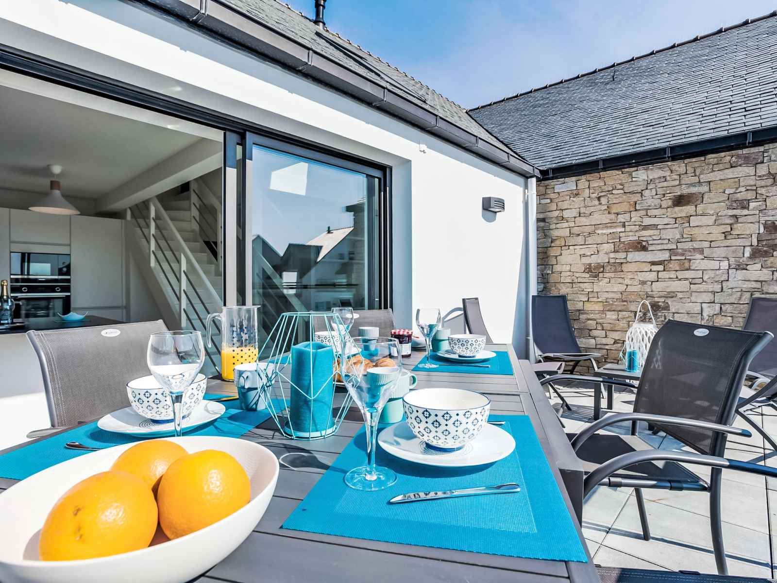 terrasse. Douche, WC séparé. Chauffage au gaz. À l'étage supérieur: 1 chambre avec 1 grand-lit (1 x 160 cm, longueur 200 cm), douche/WC. 1 chambre avec 2 lits (80 cm, longueur 200 cm). Grande terrasse 15 m2. Meubles de terrasse. Vue partielle sur la mer. A disposition: lave-linge, sèche-linge, sèche-cheveux. Internet (Connexion WIFI, gratuit). Place de parking No 25, garage (1 Voiture). Veuillez noter: détecteur de fumée. 56186 000716 JS