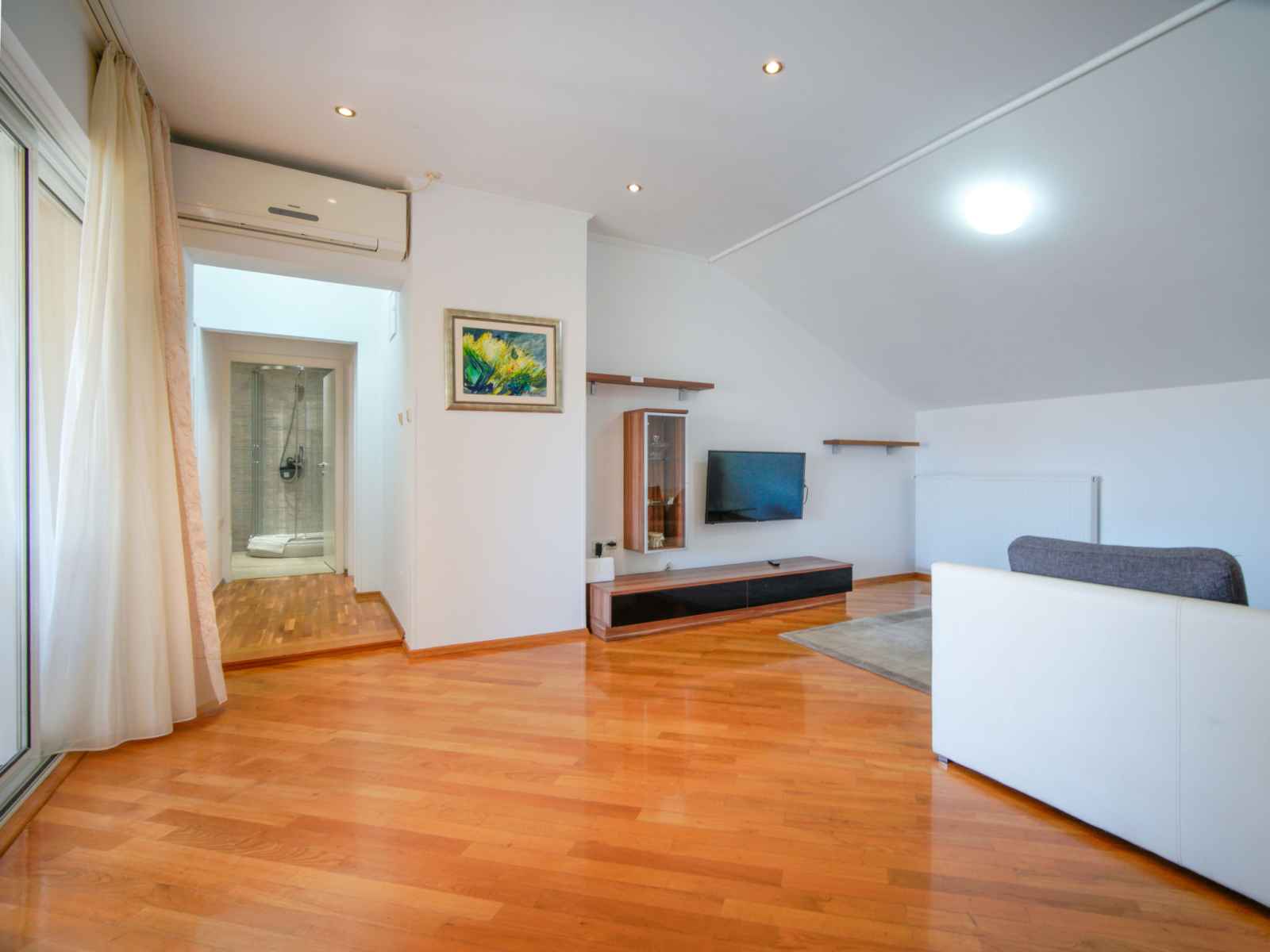 Apt 3 pièces 110 m2, sous le toit. aménagement agréable et plaisant: séjour/salle à manger 46 m2, mansardé hauteur plafond 165 - 280 cm avec 1 divan-lit (150 cm, longueur 190 cm), tv (satellite) (écran plat), air-conditionné. sortie sur la terrasse. 1 chambre mansardée hauteur plafond 165 - 280 cm avec 1 lit double (2 x 90 cm, longueur