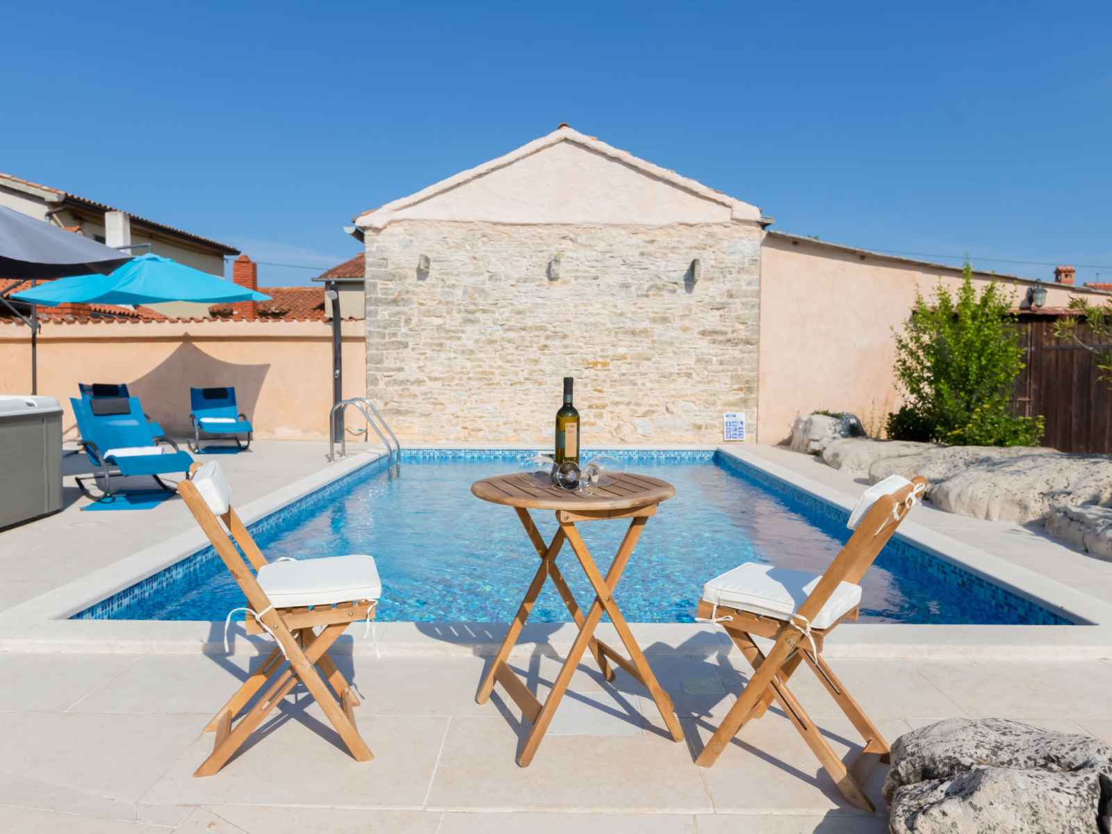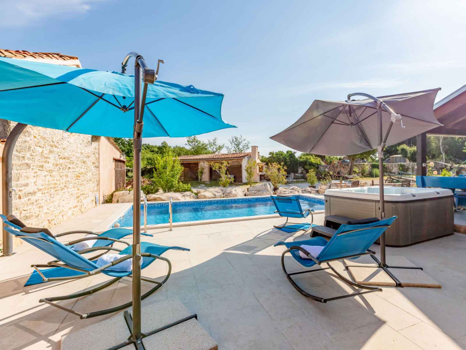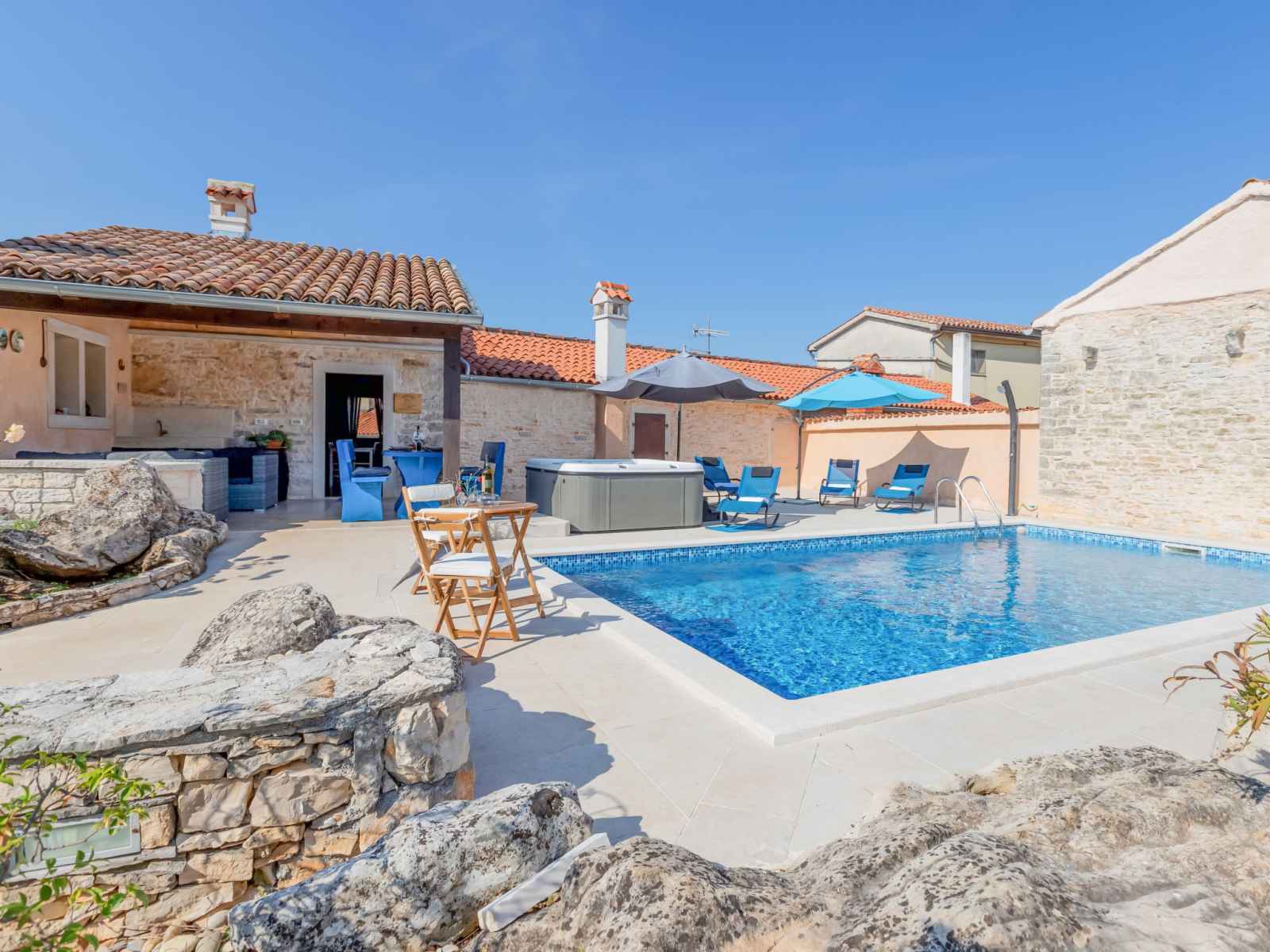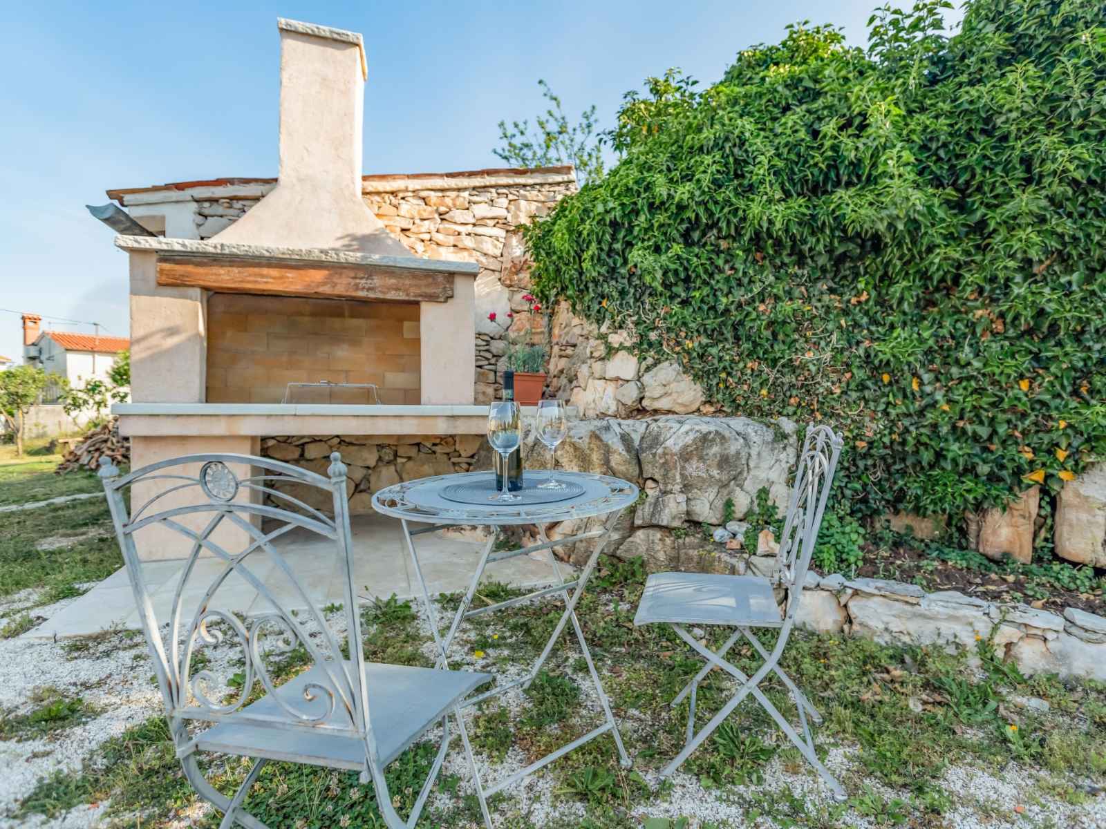 Maison à 2 apts "botra maria". dans le hameau de gljuščići, à 7 km du centre de Žminj, à 25 km du centre de rovinj, à 25 km de la mer. a usage privé: terrain 1'000 m2 avec plantes, piscine rectangulaire (8 x 4 m, profondeur 135 cm, disponibilité saisonnière: 01.mai. - 30.sep.). douche extérieure, bain à remous , barbecue.