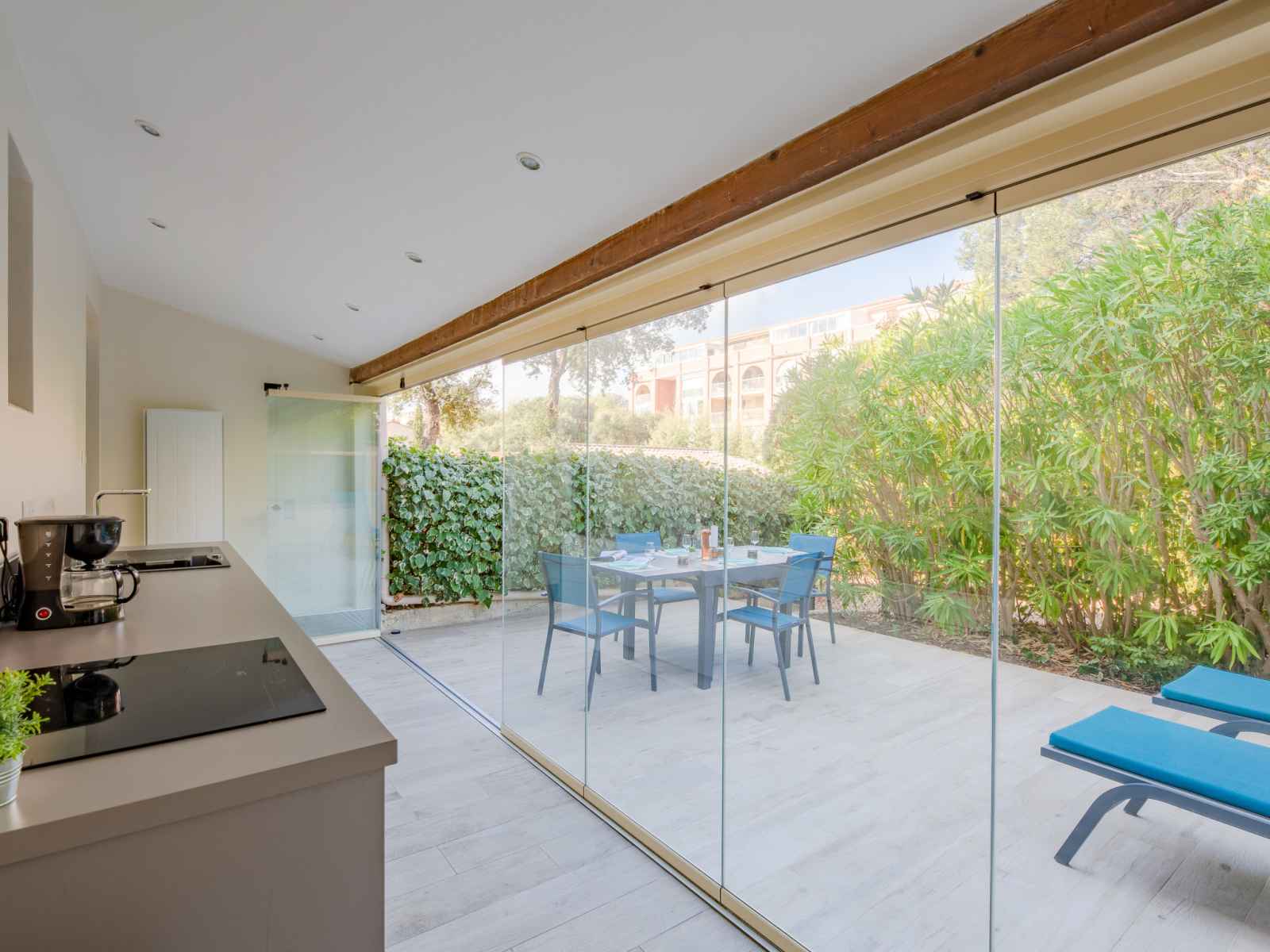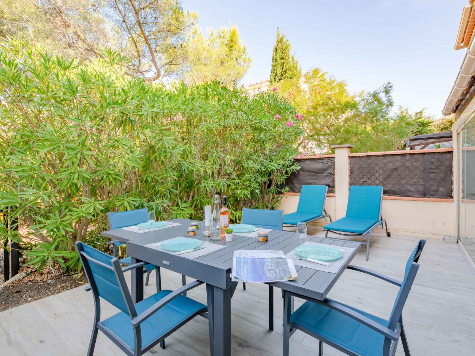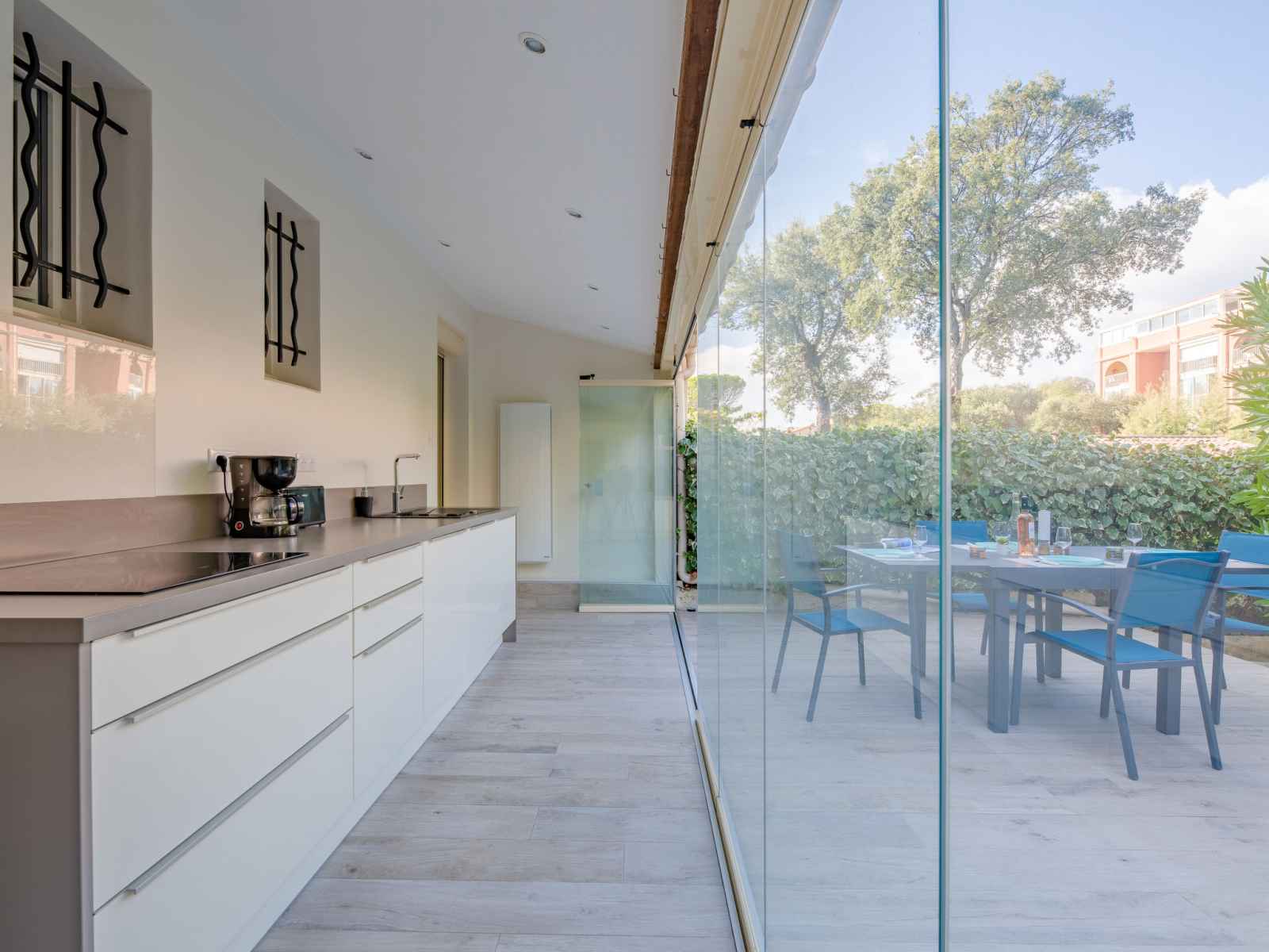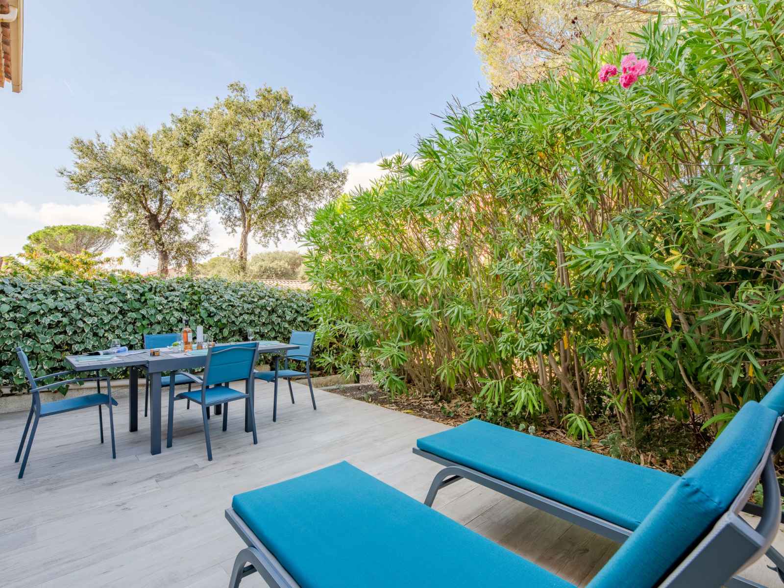 vitrée Dressing avec 1 grand-lit (1 x 140 cm, longueur 190 cm), ventilateur. Cuisine ouverte (four, lave-vaisselle, 3 plaques à induction, grille-pain, bouilloire électrique, micro-ondes, congélateur, cafetière électrique). Sortie sur la terrasse. Douche, WC séparé. Chauffage. Terrasse 15 m2 partiellement couverte, situation est terrasse 23 m2, situation ouest. Meubles de terrasse, chaises longues (2). A disposition: lave-linge, sèche-linge, fer à repasser, sèche-cheveux. Internet (Connexion WIFI, gratuit). Place de parking No 21 (1 Voiture). Veuillez noter: logement non-fumeur. Détecteur de fumée. Annonce d'un particulier (art 155, IV du CGI). QEFCSN
