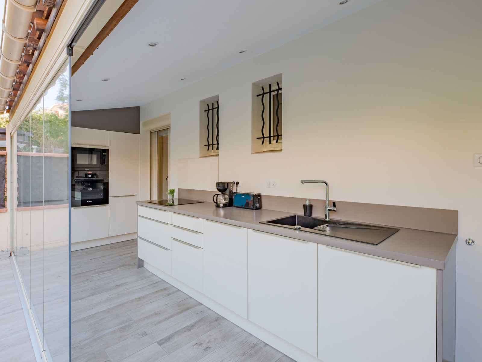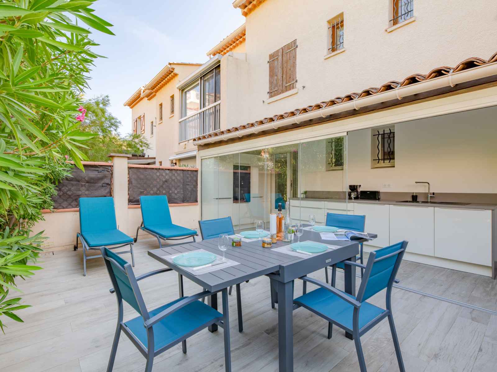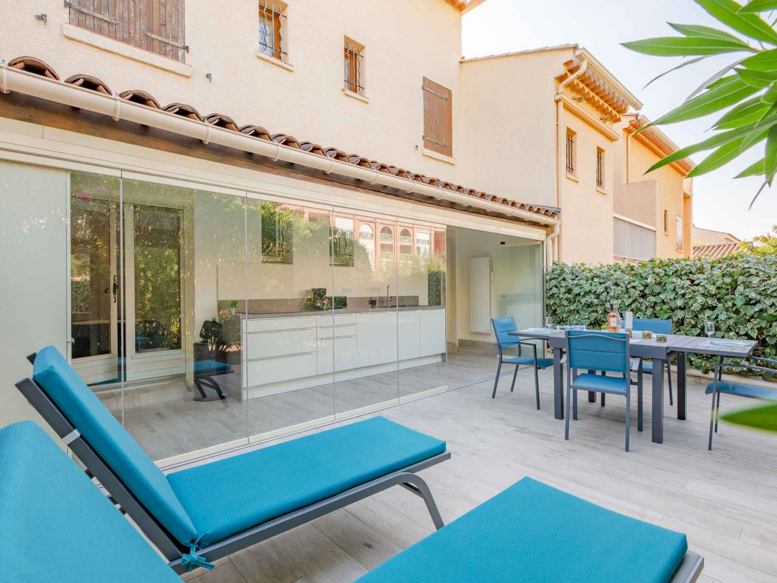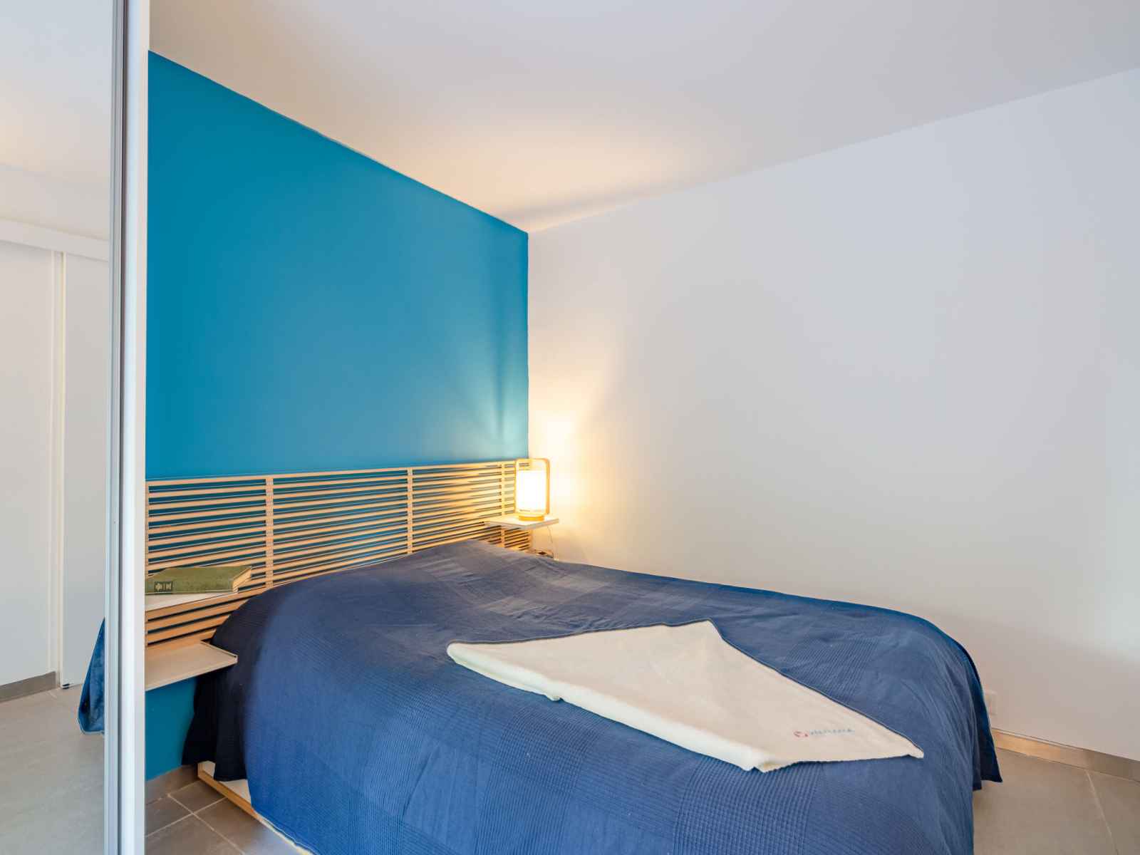 vitrée Dressing avec 1 grand-lit (1 x 140 cm, longueur 190 cm), ventilateur. Cuisine ouverte (four, lave-vaisselle, 3 plaques à induction, grille-pain, bouilloire électrique, micro-ondes, congélateur, cafetière électrique). Sortie sur la terrasse. Douche, WC séparé. Chauffage. Terrasse 15 m2 partiellement couverte, situation est terrasse 23 m2, situation ouest. Meubles de terrasse, chaises longues (2). A disposition: lave-linge, sèche-linge, fer à repasser, sèche-cheveux. Internet (Connexion WIFI, gratuit). Place de parking No 21 (1 Voiture). Veuillez noter: logement non-fumeur. Détecteur de fumée. Annonce d'un particulier (art 155, IV du CGI). QEFCSN