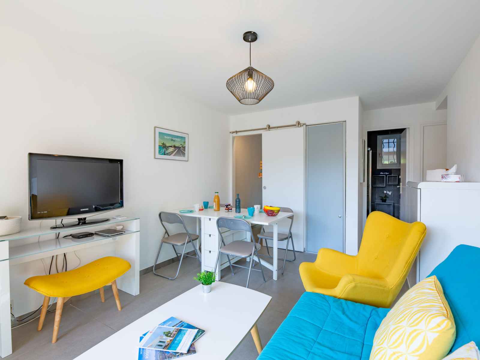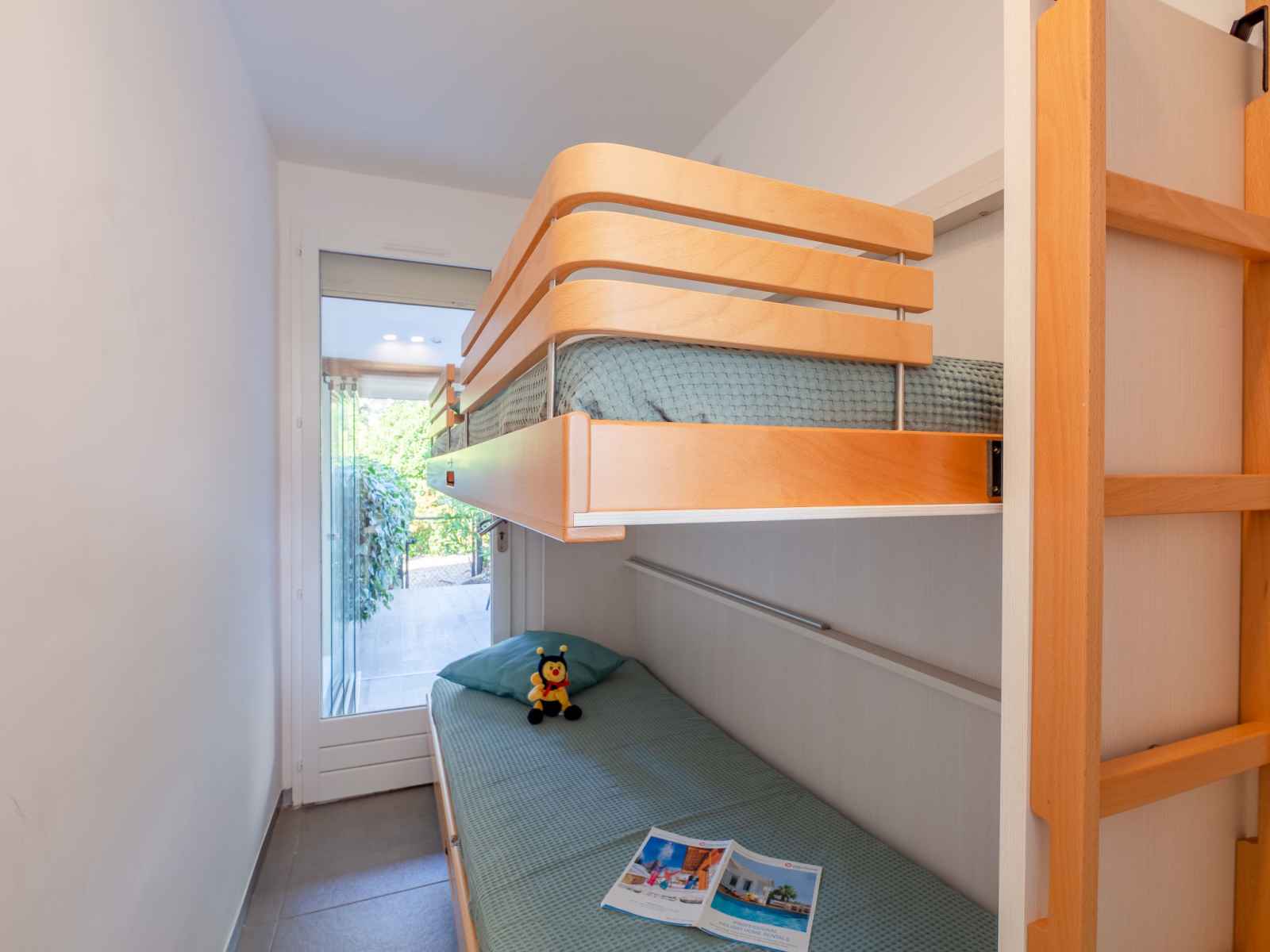 Apt 3 pièces 42 m2, rez-de-chaussée surélevé, situation sud-est. logement idéal pour 2 adultes + 2 enfants. clair, rénové en 2022, aménagement simple et confortable: salle à manger avec tv (écran plat), air-conditionné. sortie sur la terrasse. 1 petite chambre avec 1 x 2 lits superposés (80 cm, longueur 190 cm). 1 chambre avec baie
